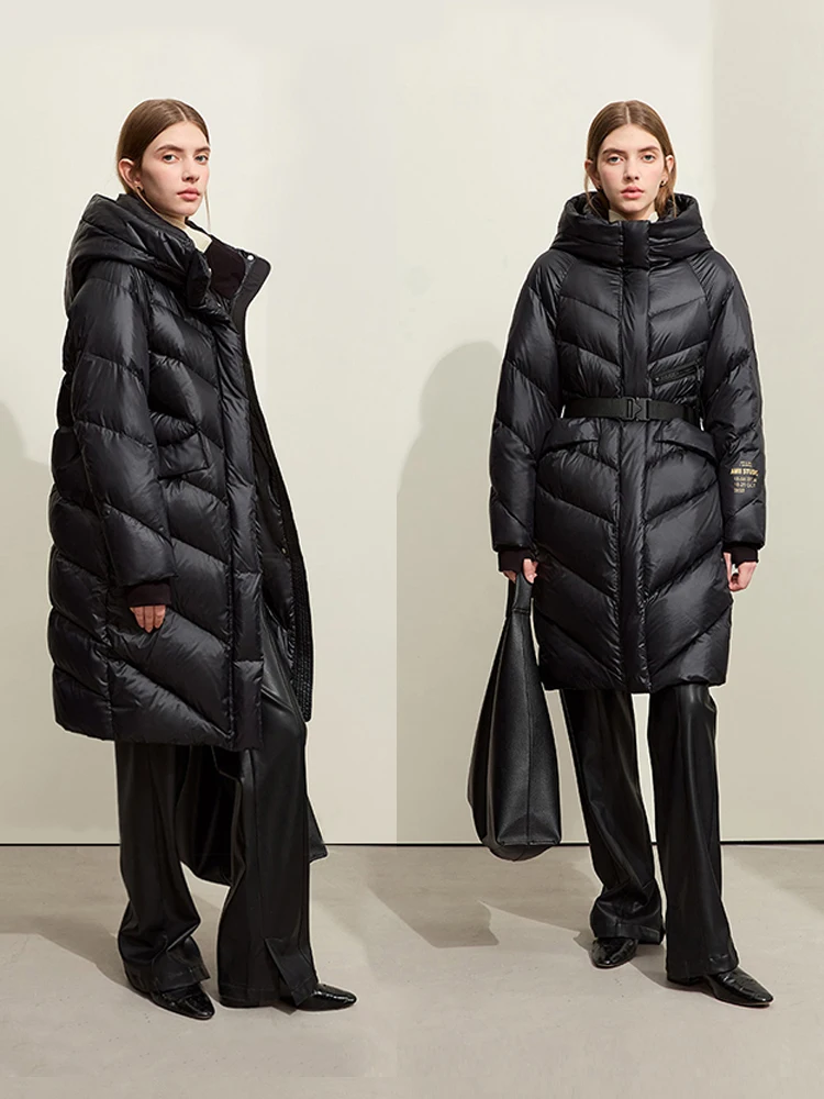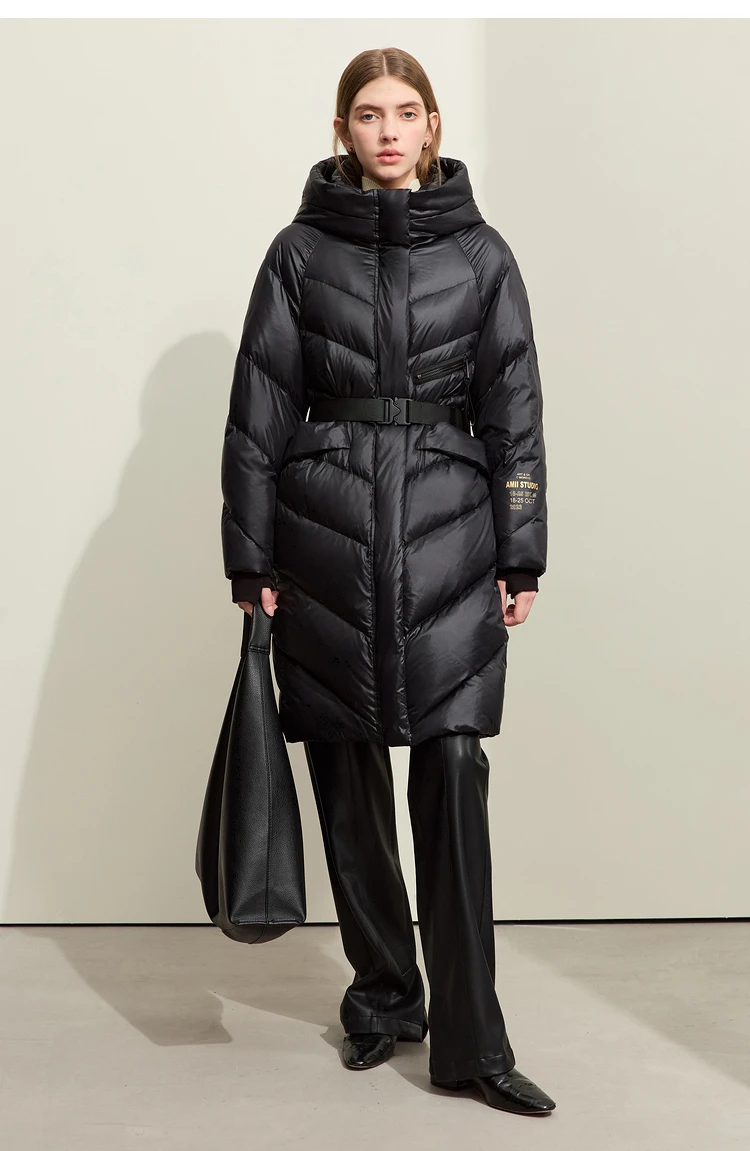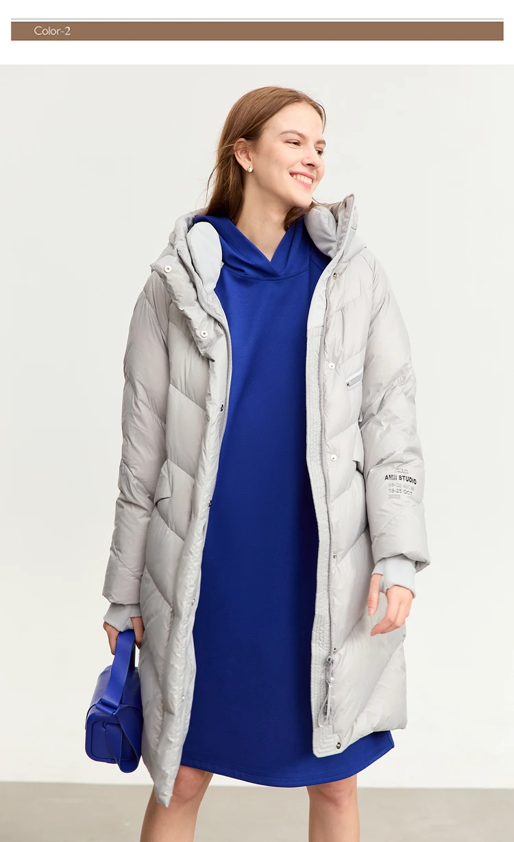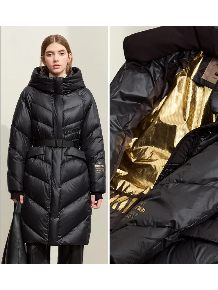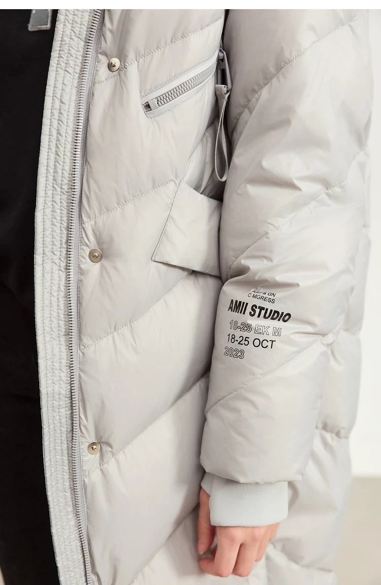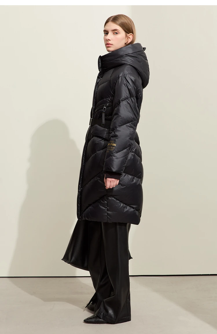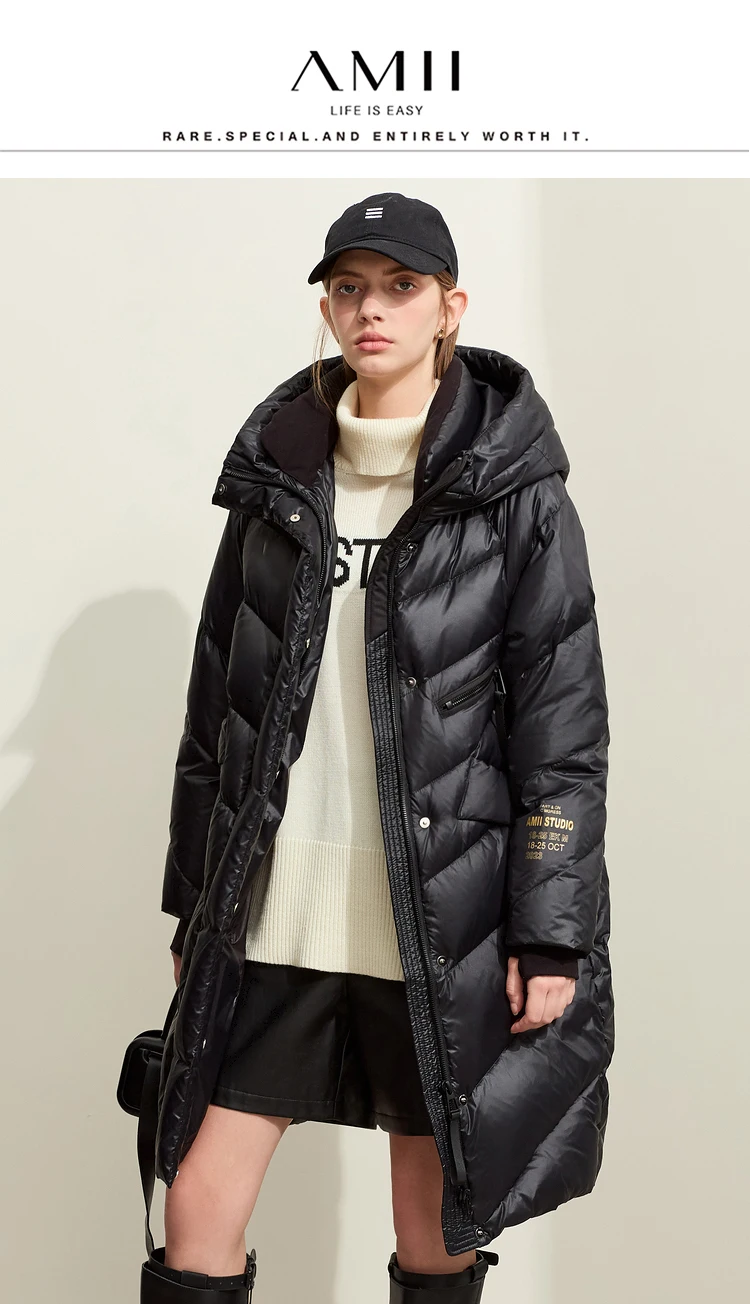 AMII Minimalist 2023 Winter Down Puffer Coat For Women New Warm Hooded With Belt Outerwear Female Letter Print Top 12324011