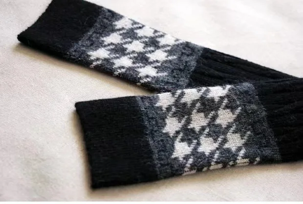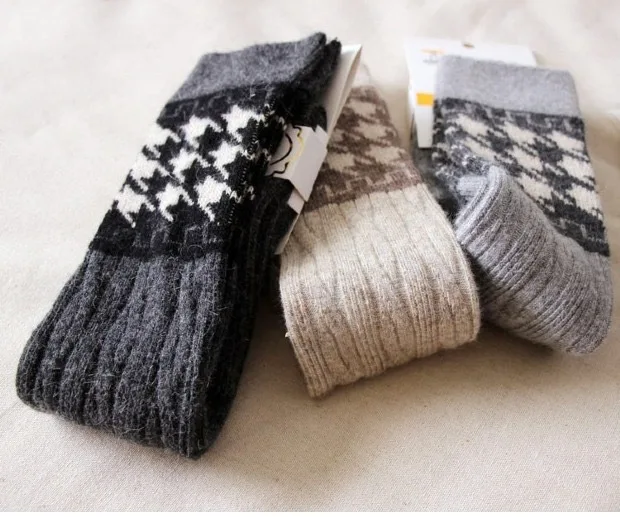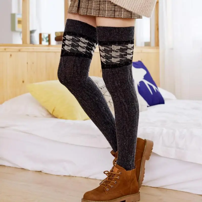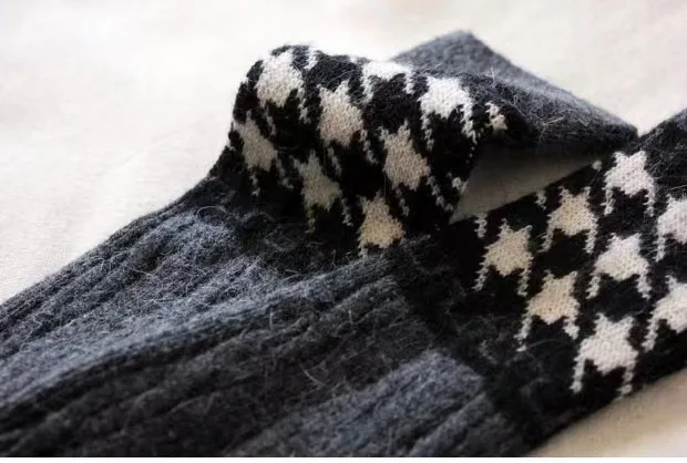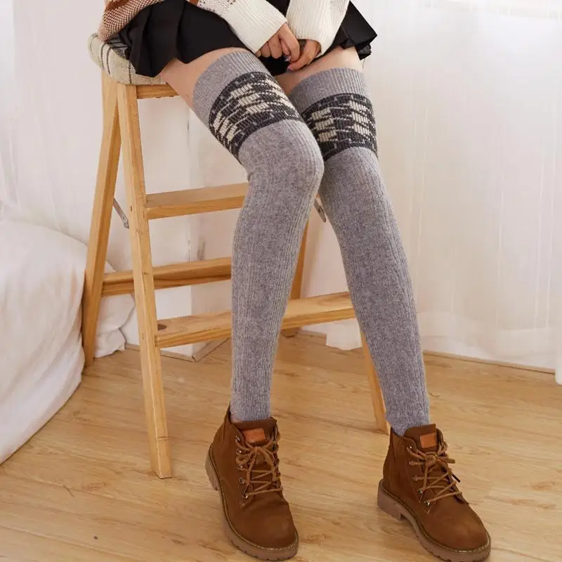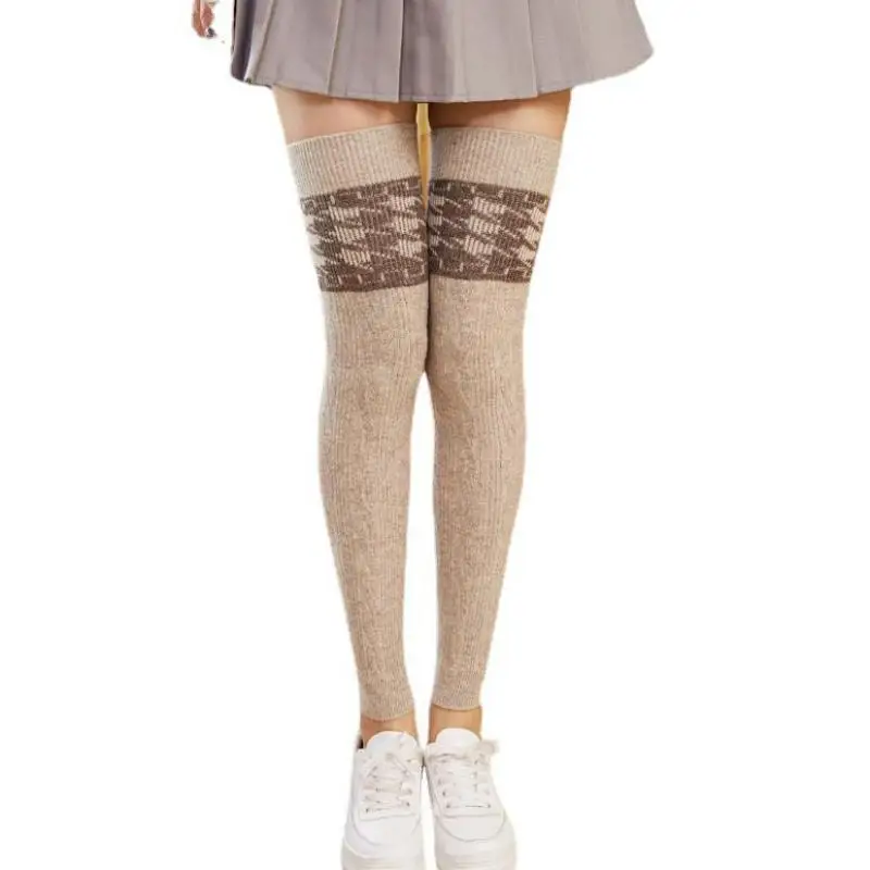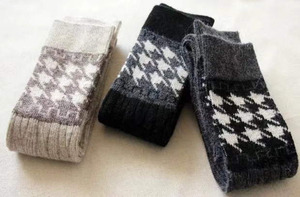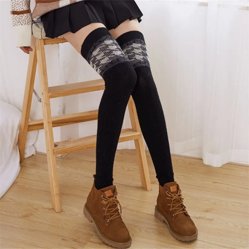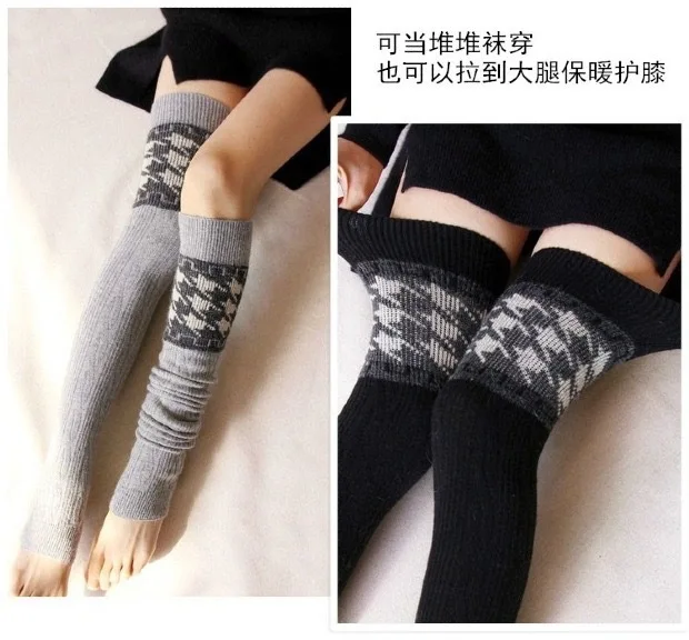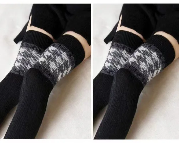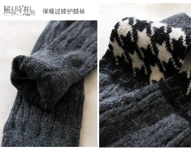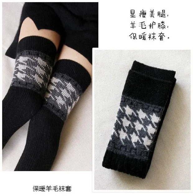 Autumn And Winter Thickened Rabbit Wool Socks Cover Thousand Bird Lattice Knitted Over Knee Stockings Foot Cover Knee Protection