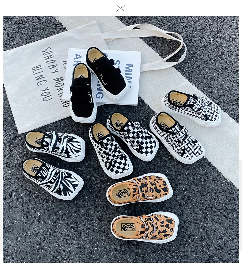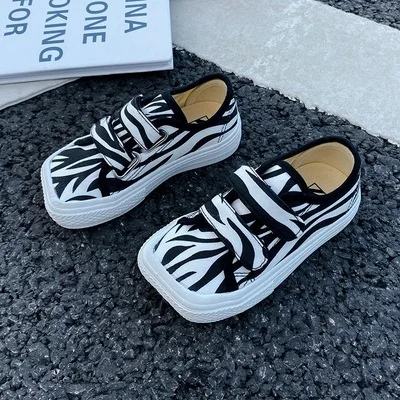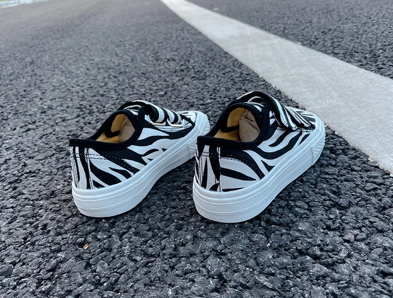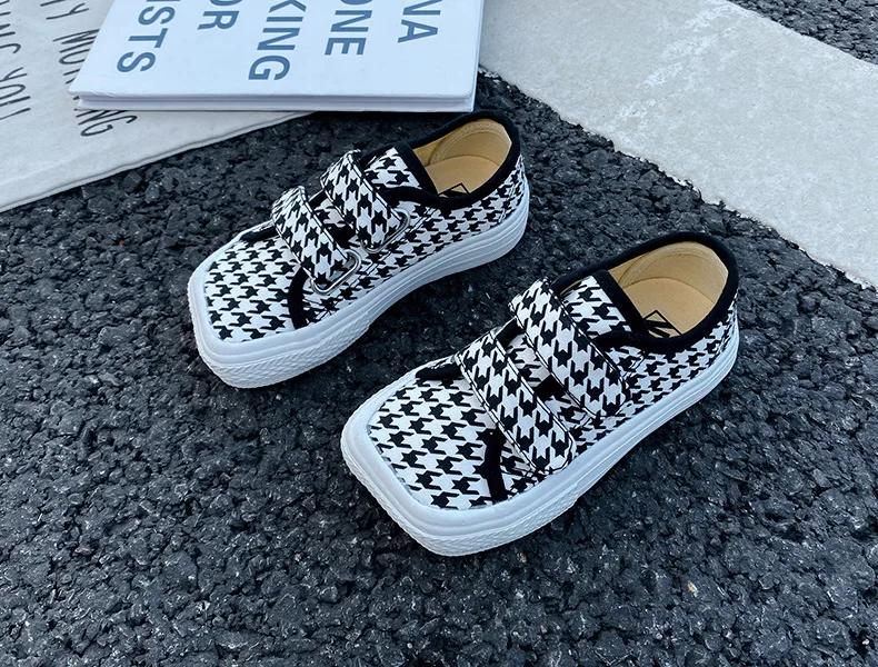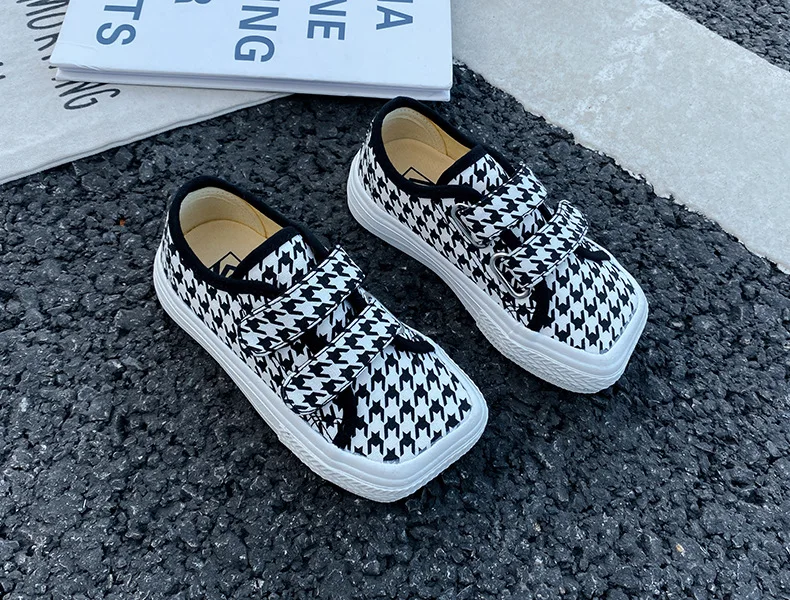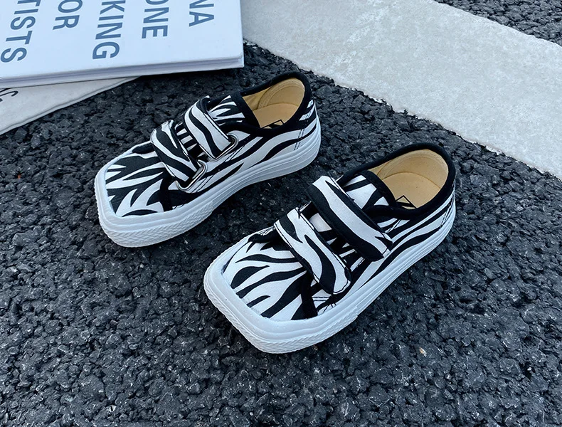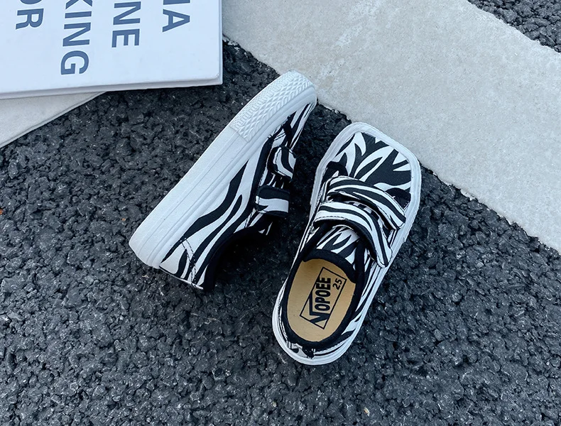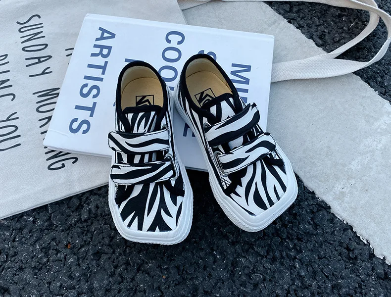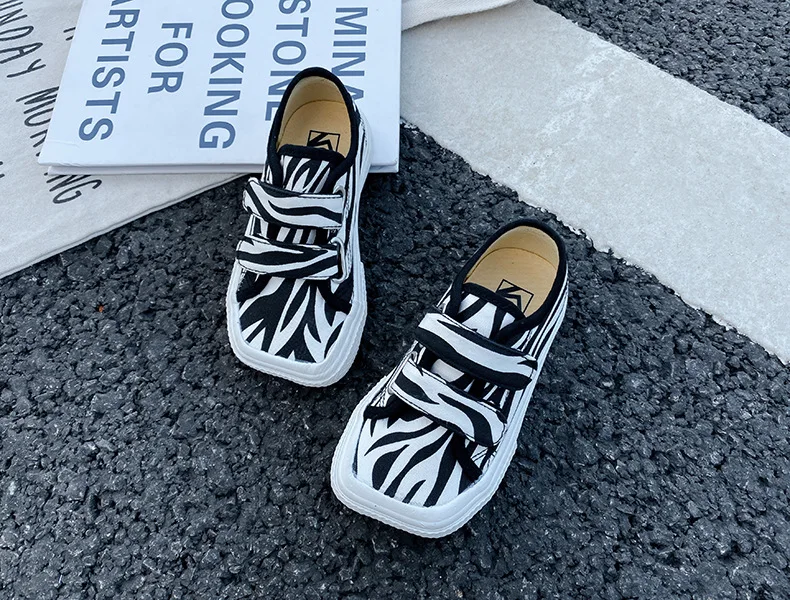 Autumn Girls Boys Canvas Shoes Soft Sports Sneaker Black Kids Running Sneakers Zebra Lattice Prints Square Toe Soft Children