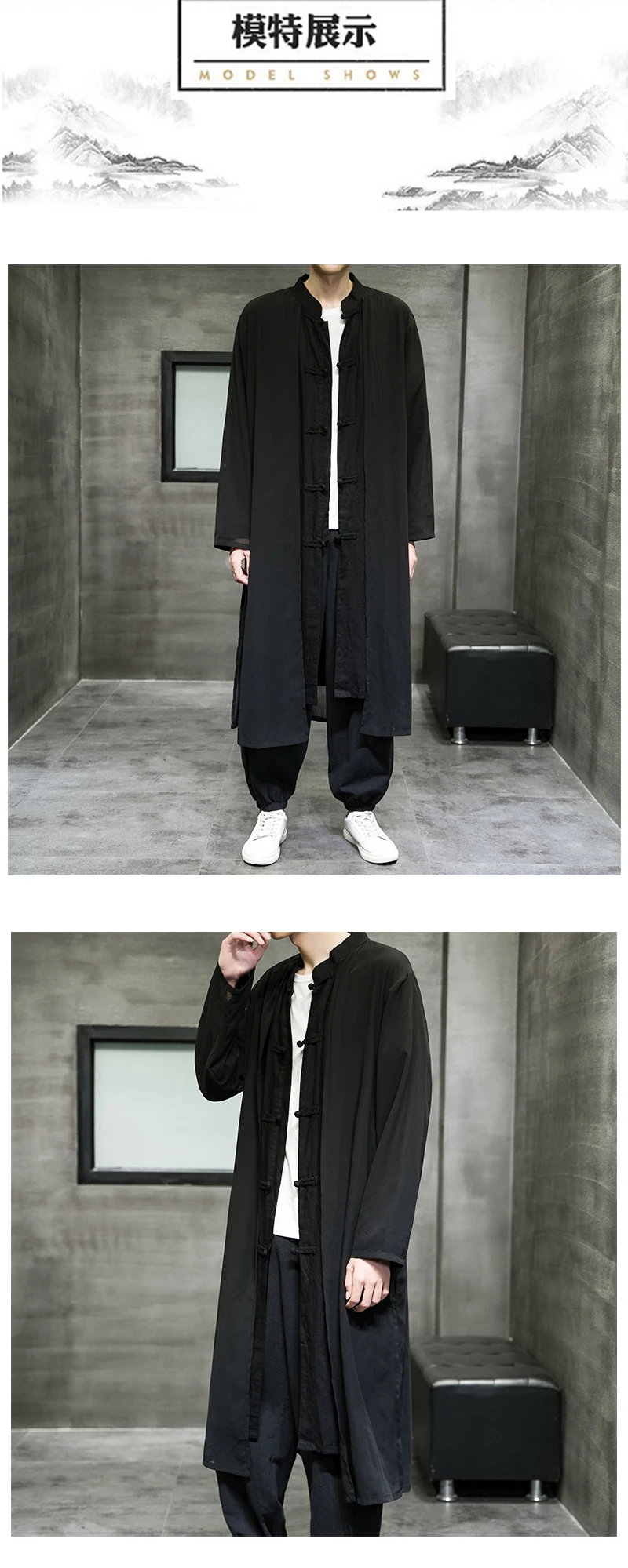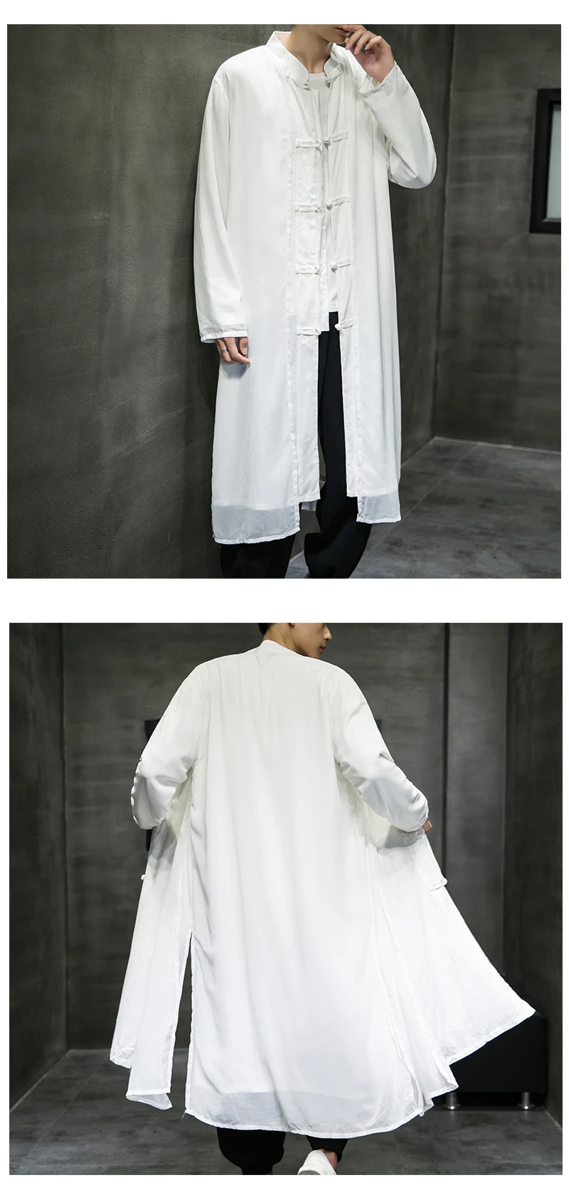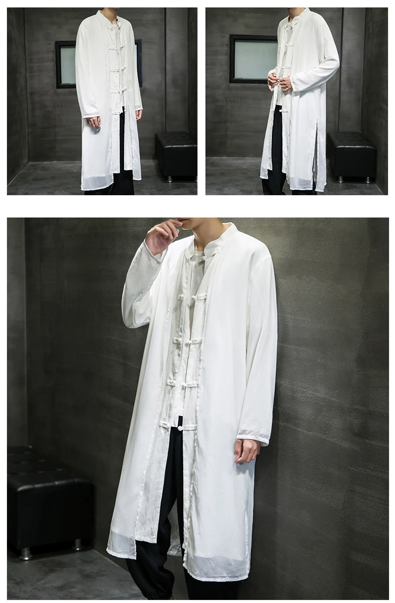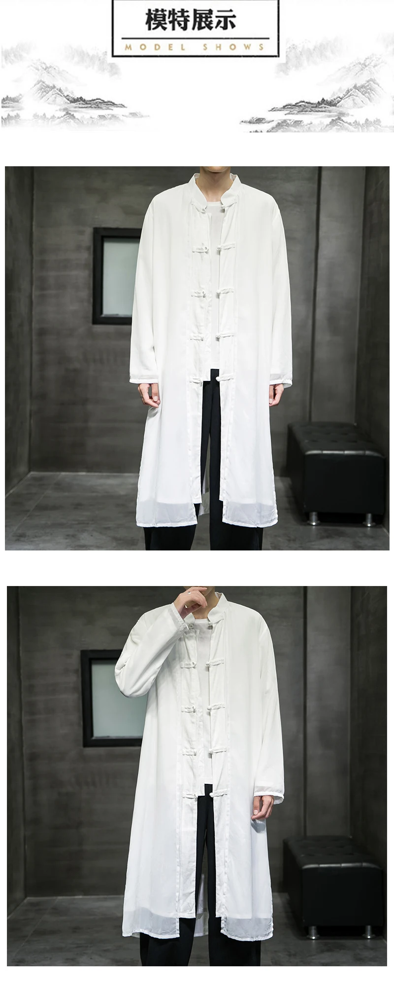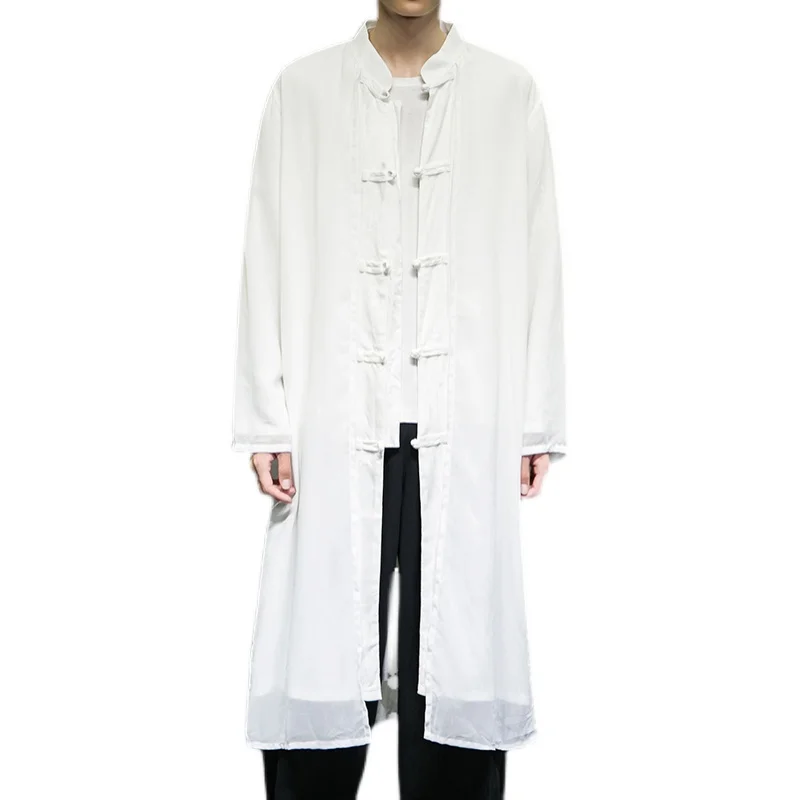 Autumn Men White Linen Trench Coat Mens Loose Long Chinese Type Cotton Windbreaker Male Mandarin Collar Cardigan Robe