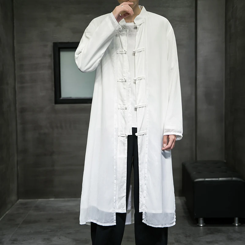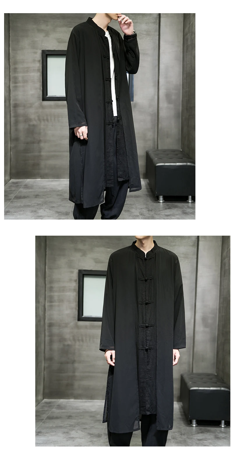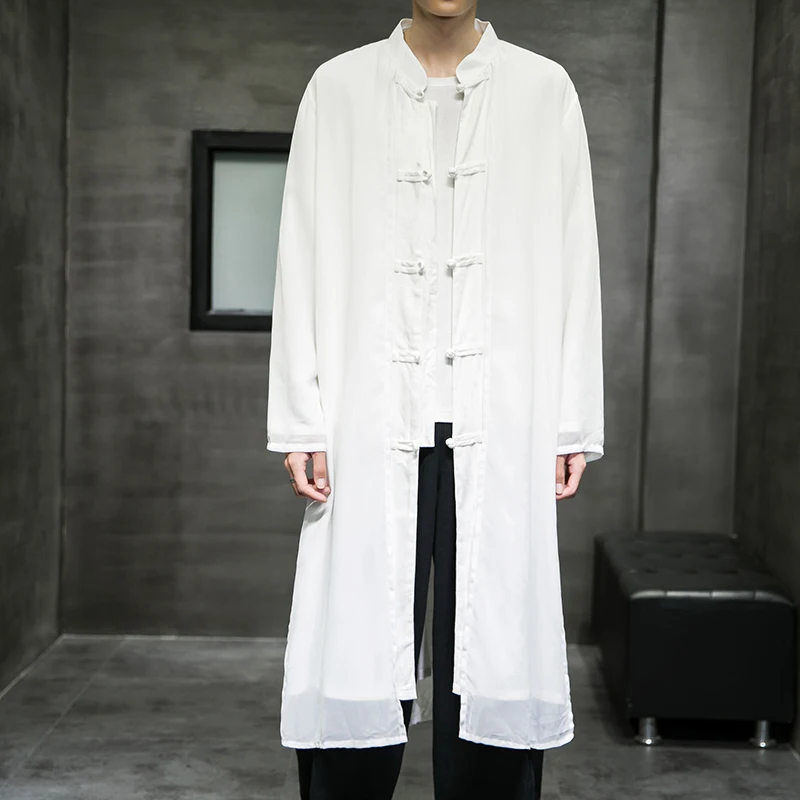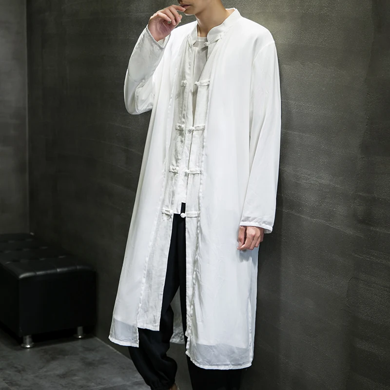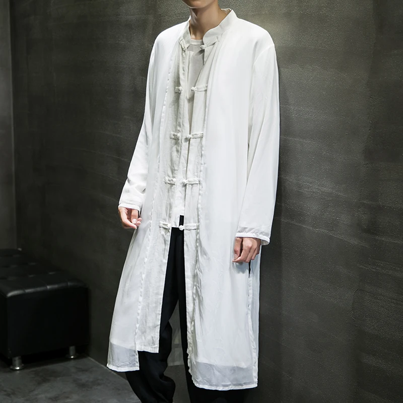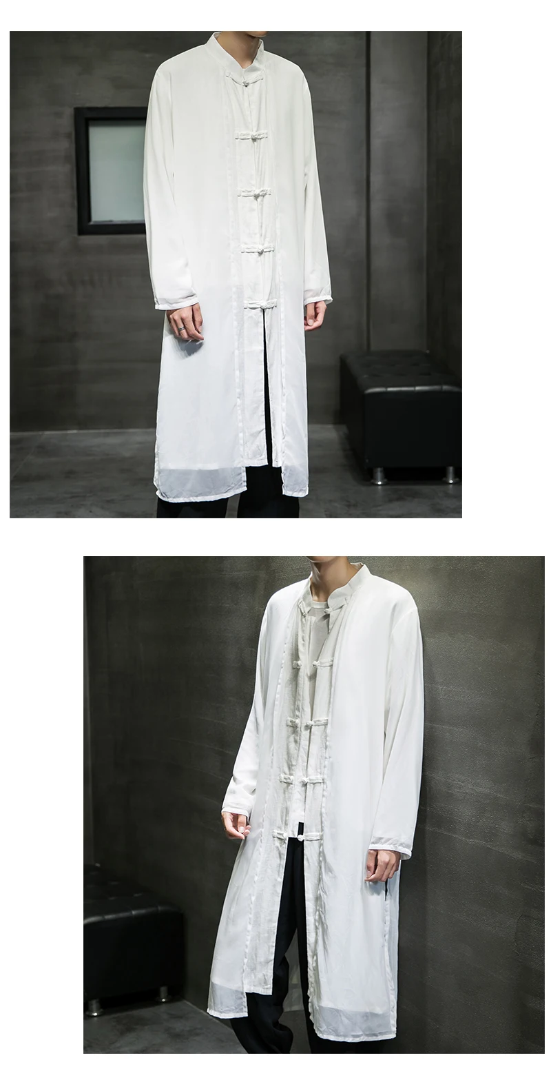 Autumn Men White Linen Trench Coat Mens Loose Long Chinese Type Cotton Windbreaker Male Mandarin Collar Cardigan Robe