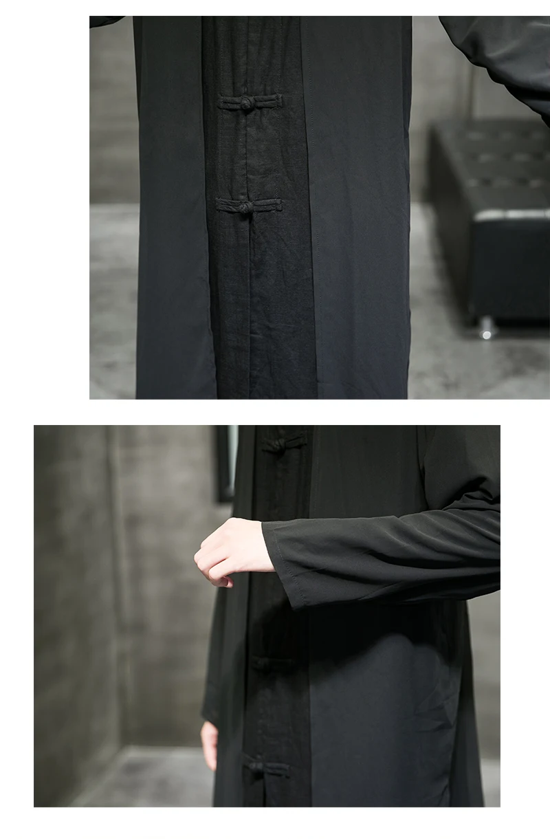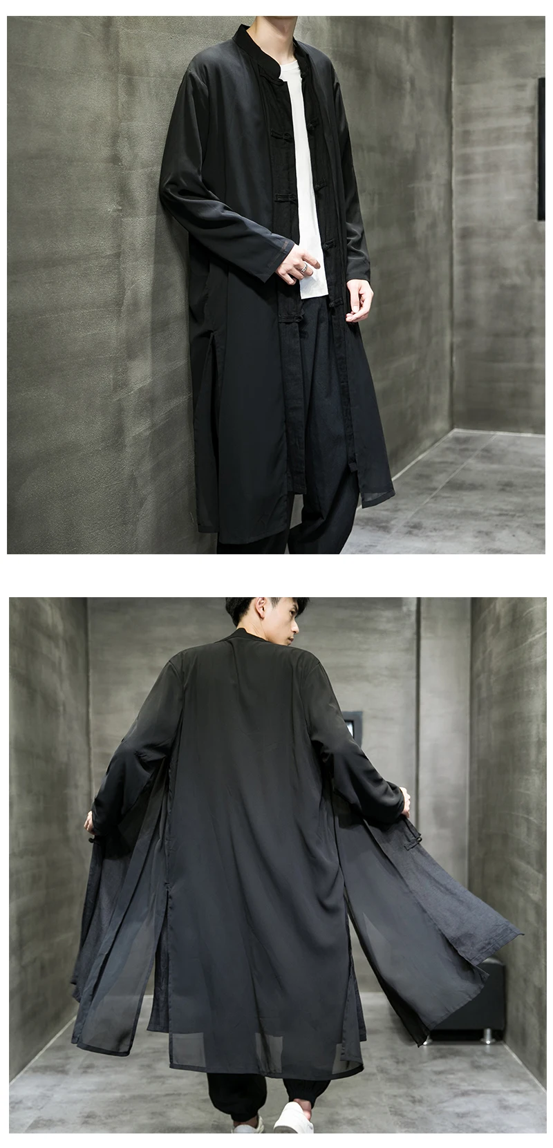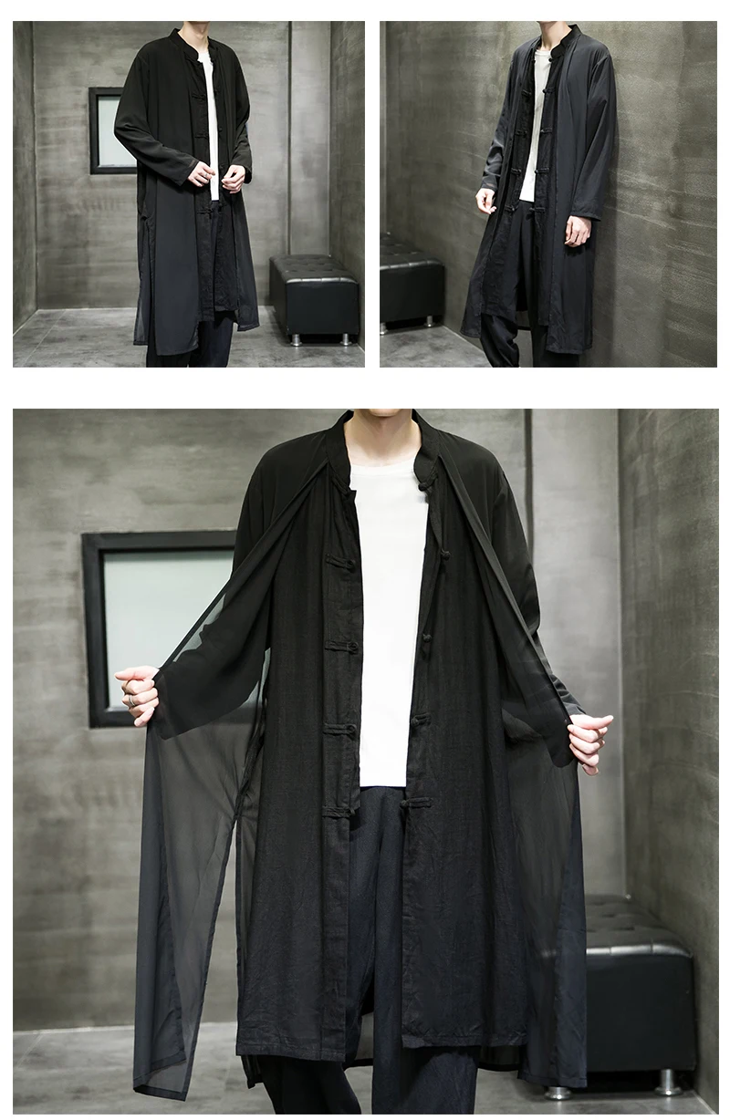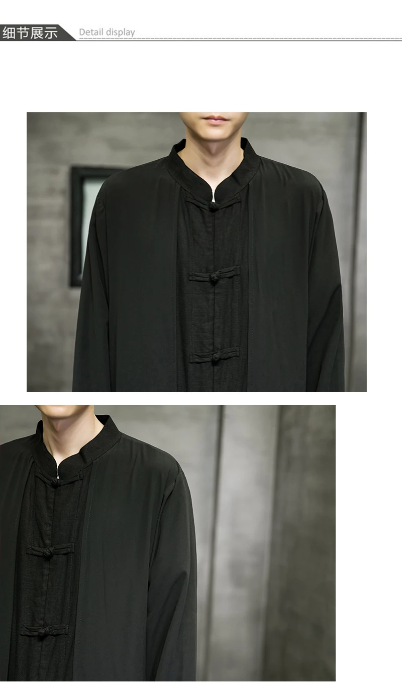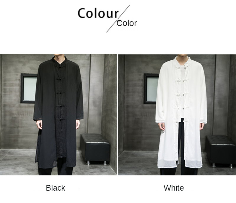 Autumn Men White Linen Trench Coat Mens Loose Long Chinese Type Cotton Windbreaker Male Mandarin Collar Cardigan Robe