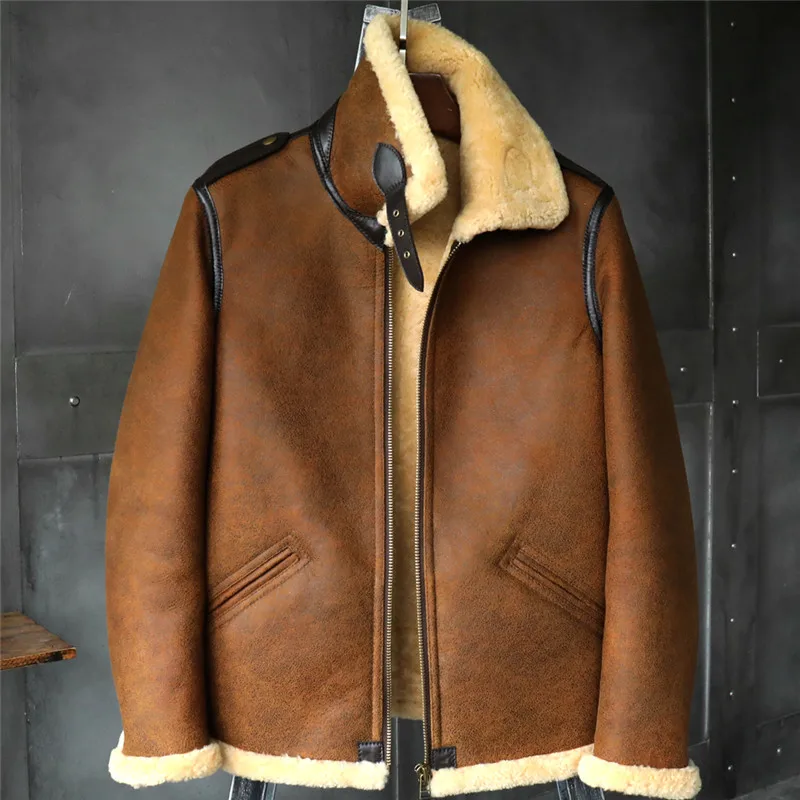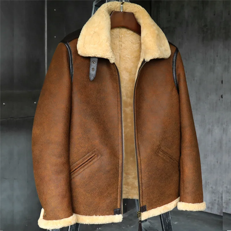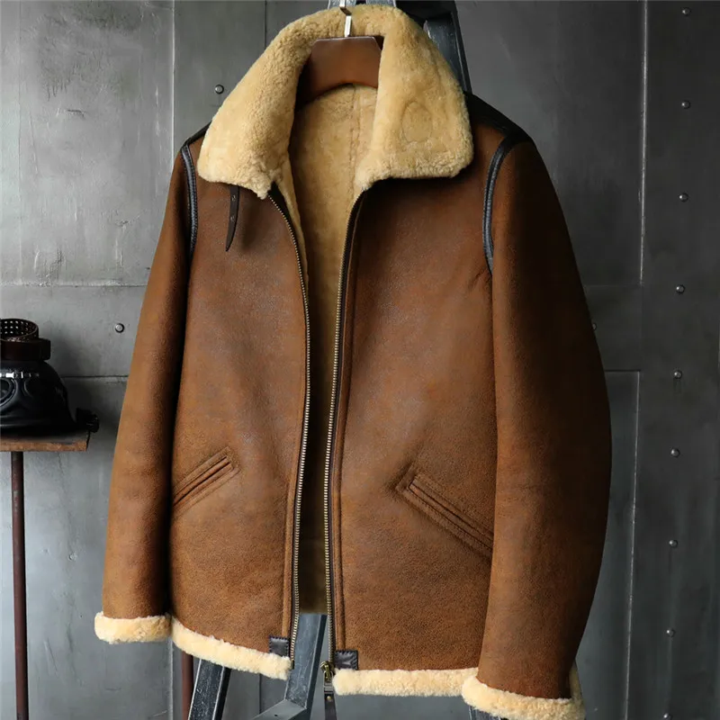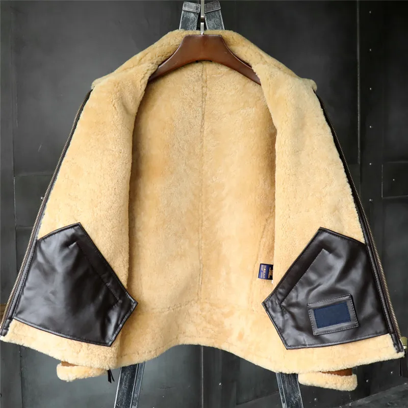 B3 Men’s Shearling Jacket Flight Jacket Short Fur Leather Jacket Imported Wool From Australia Mans Sheepskin Aviator Fur Coat