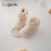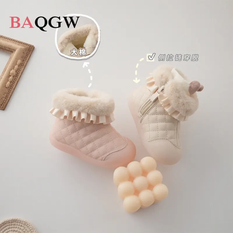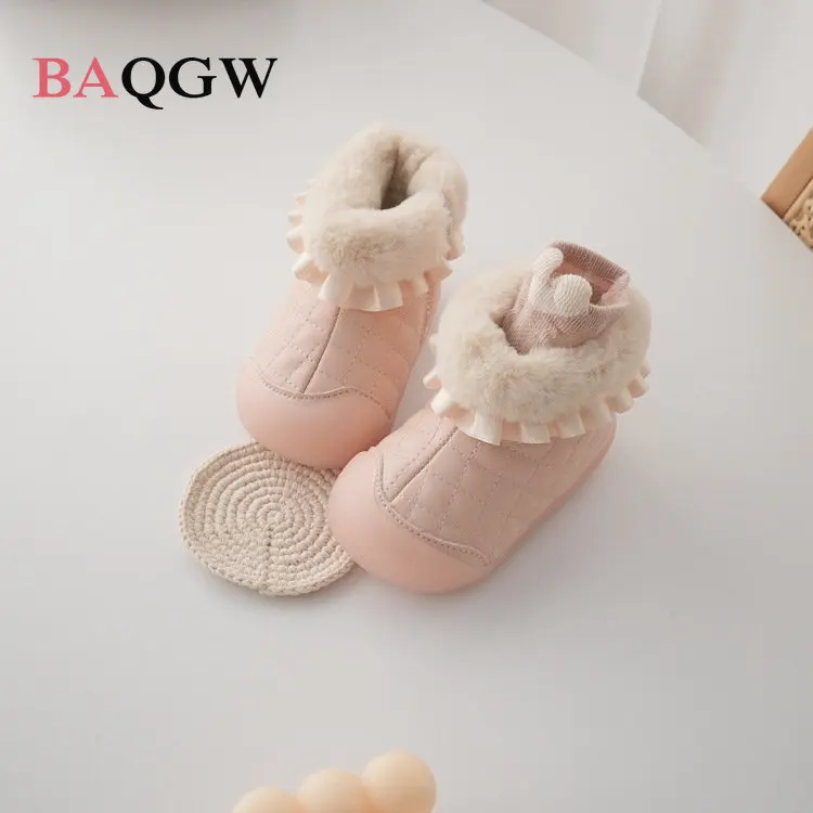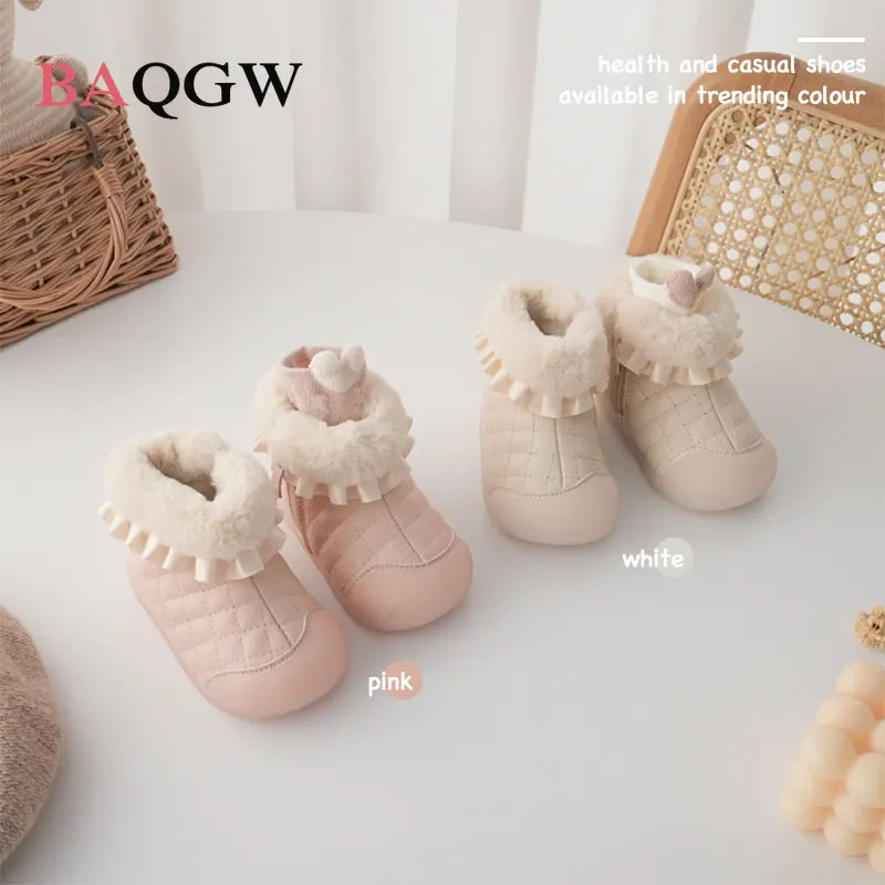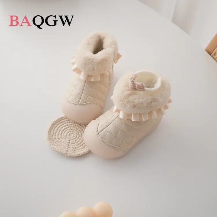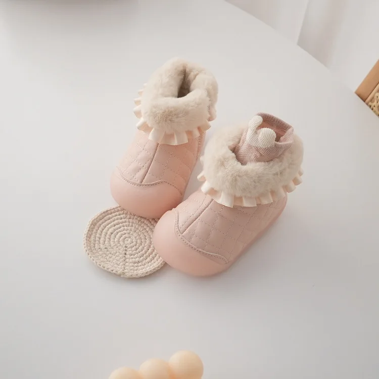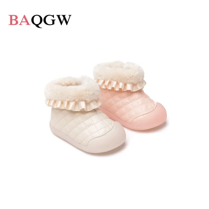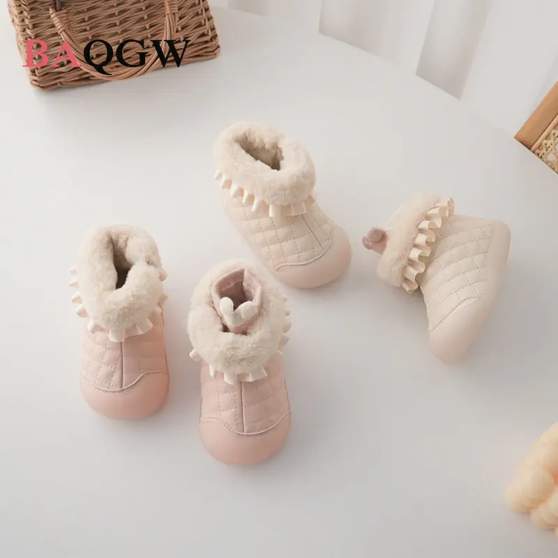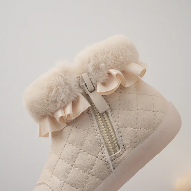 Baby Girl Sweet Plush Warm Boots Autum Winter Plaid Leather Fashion Korean Style High Top Comfortable Furry First Walker Shoes