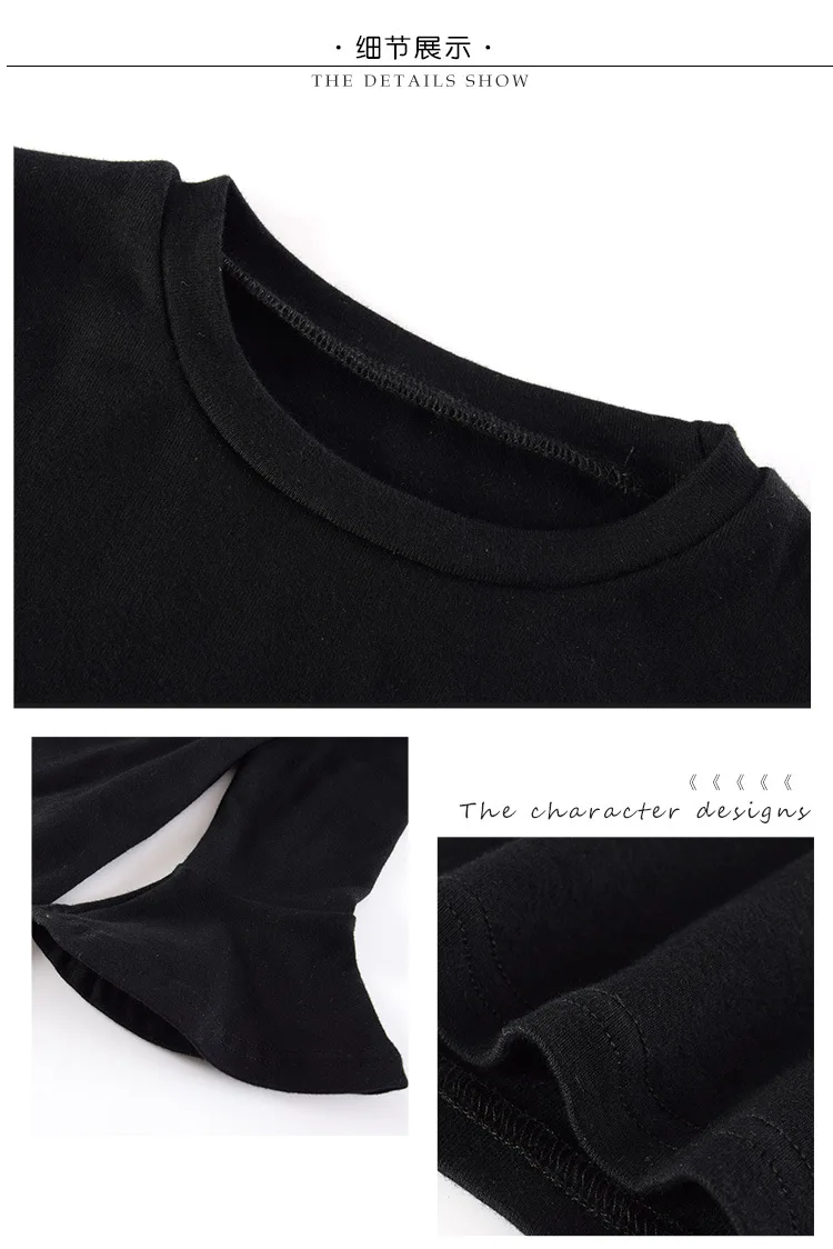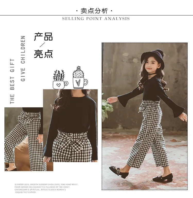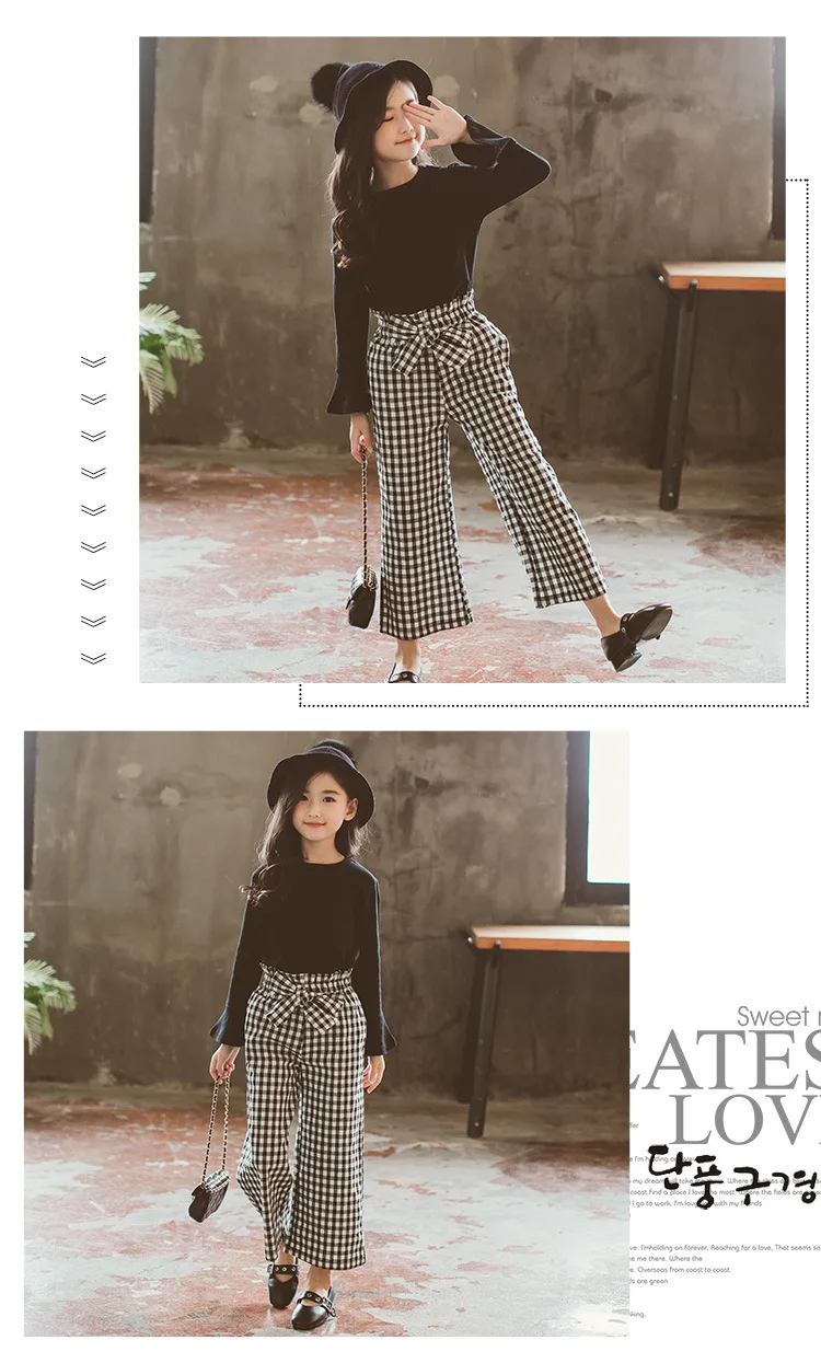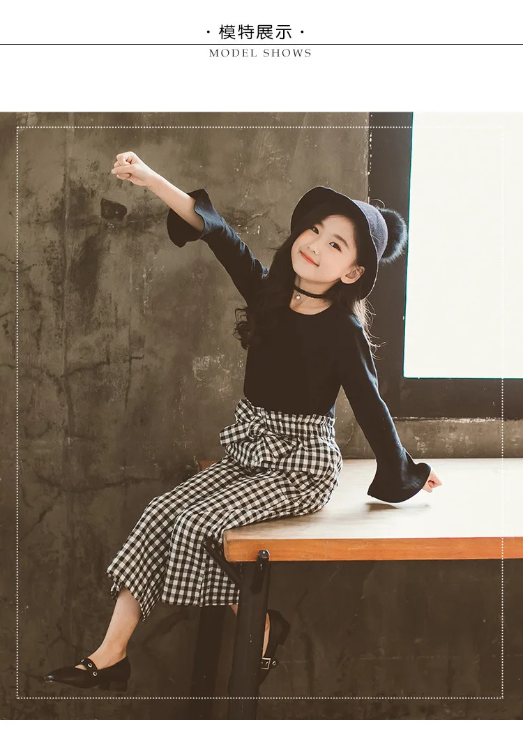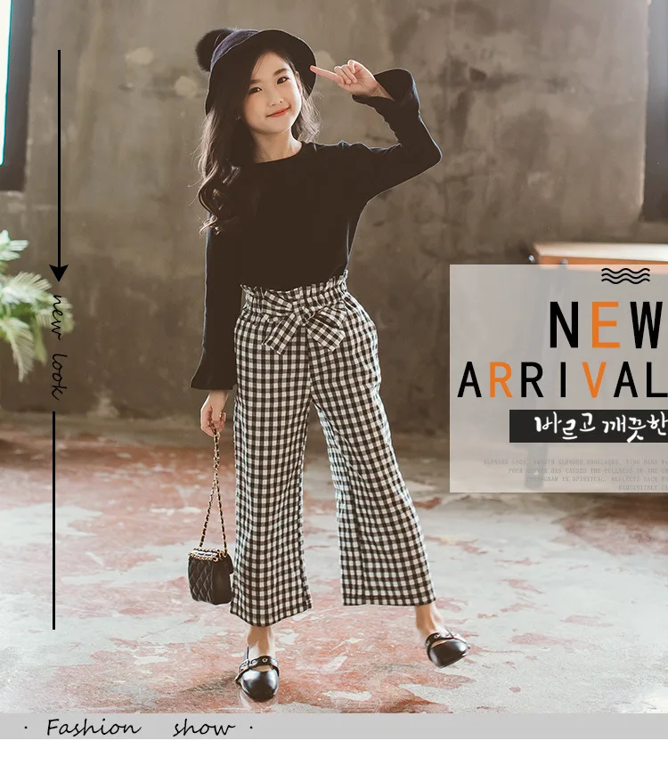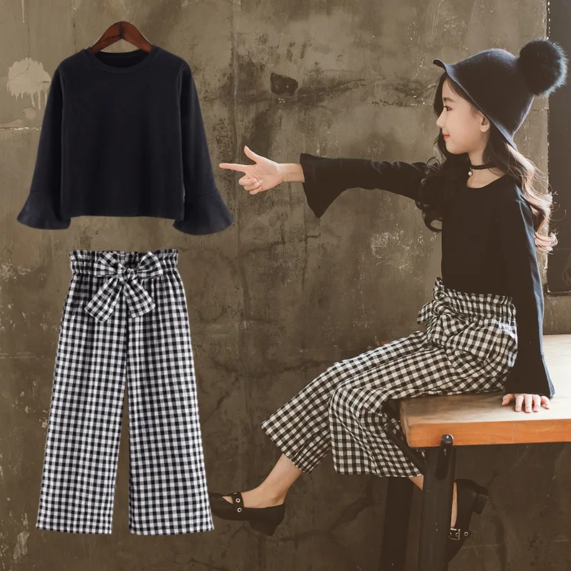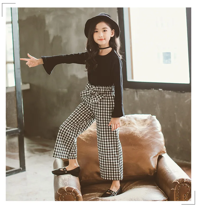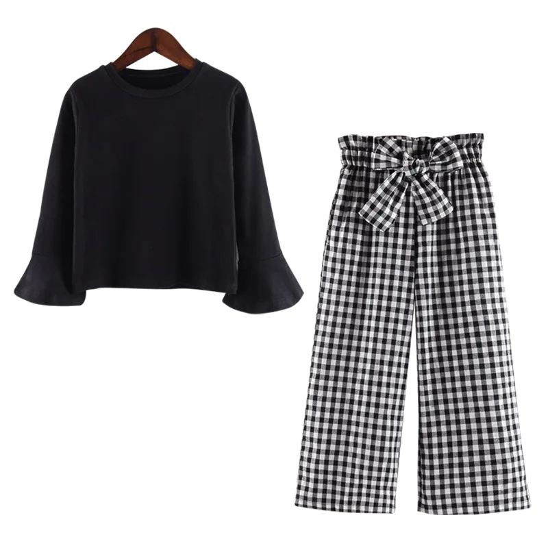 Baby Girls Clothes Sets Fashion Toldder Kids Solid Black Long T Shirt Tops Plaid Bow Pants Outfits 3 4 6 8 9 10 11 12 14 Years