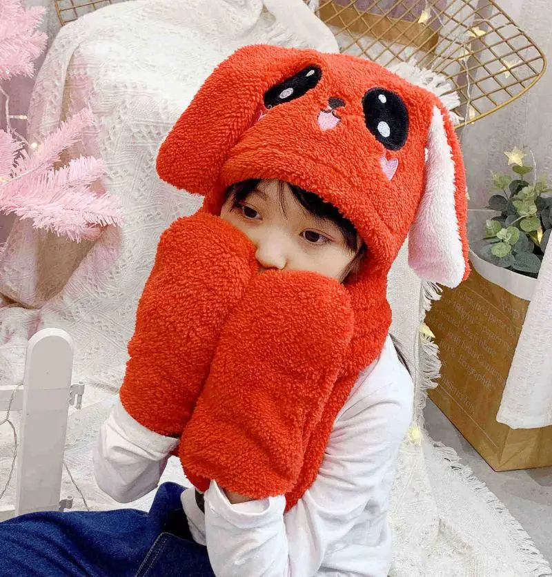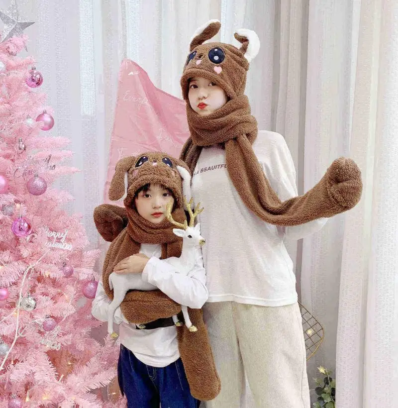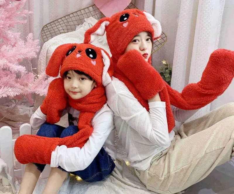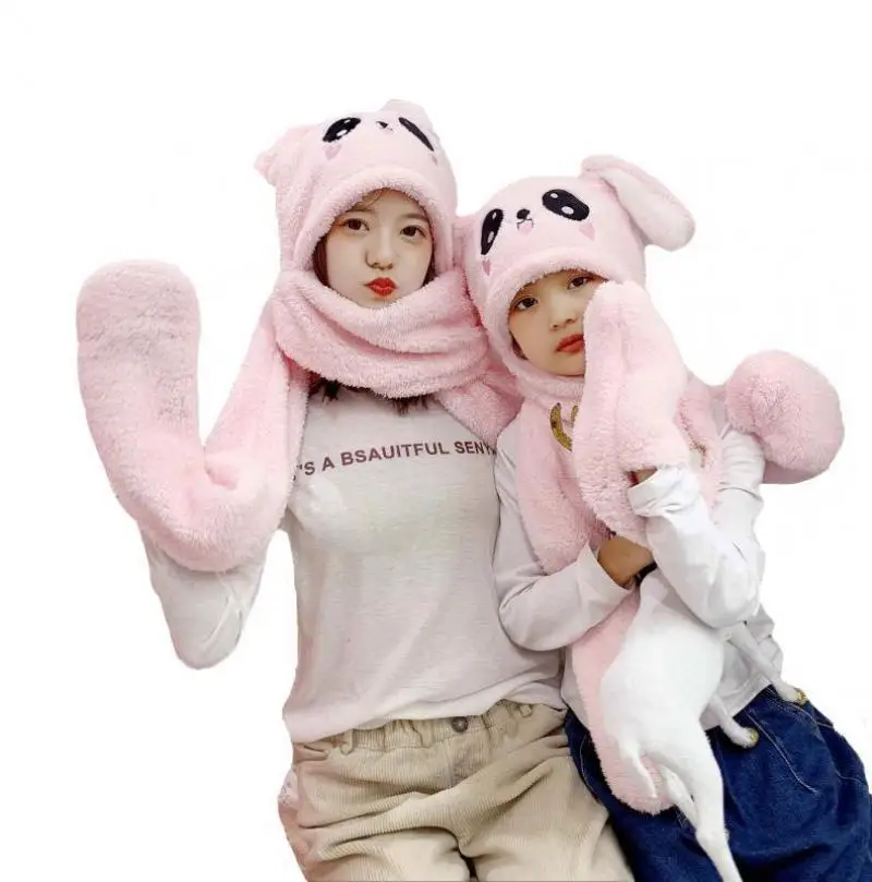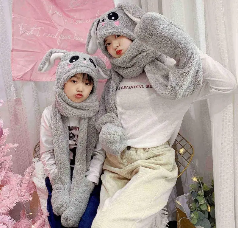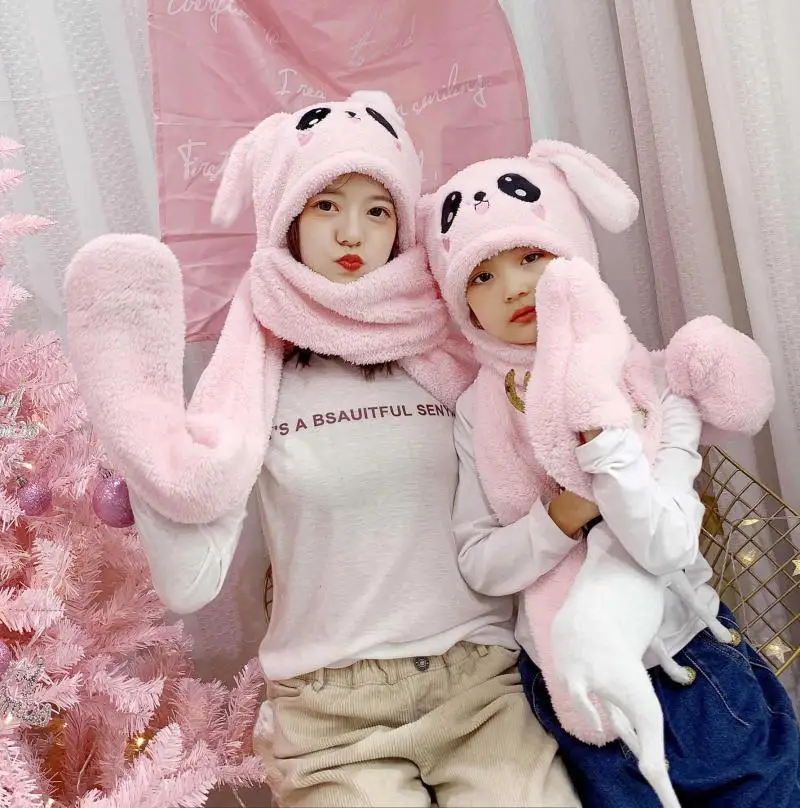 Baby Girls Mom Rabbit Ear Moving Jumping Hats Children Women Warm Plush Winter Scarf Caps Gloves Kids Cute Bunny Funny Hats Cap