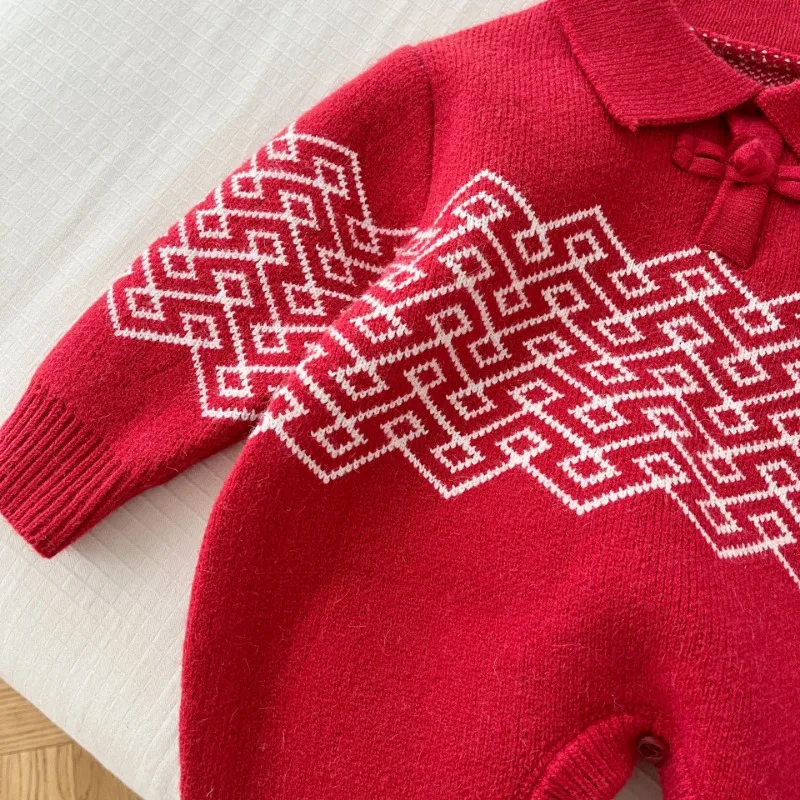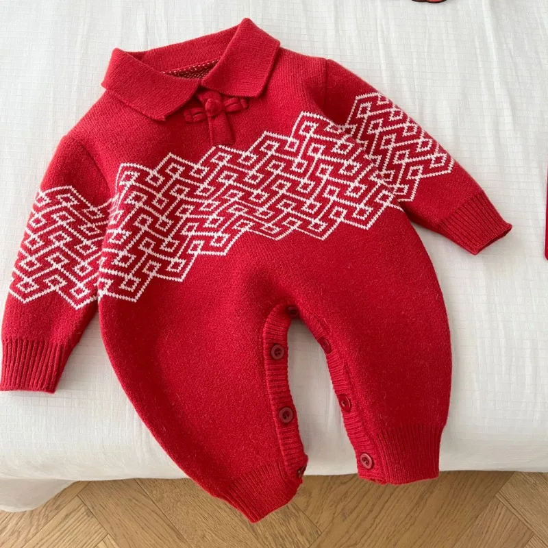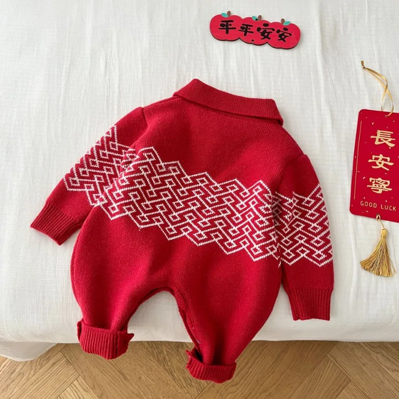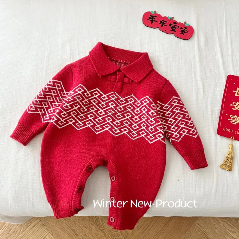 Baby Red New Year’s Eve Clothing for 0-2 Year Old Winter Girl Baby Thickened Jumpsuit Newborn Romper Sweater