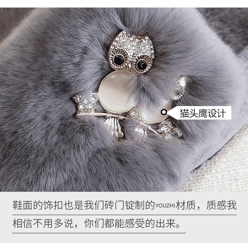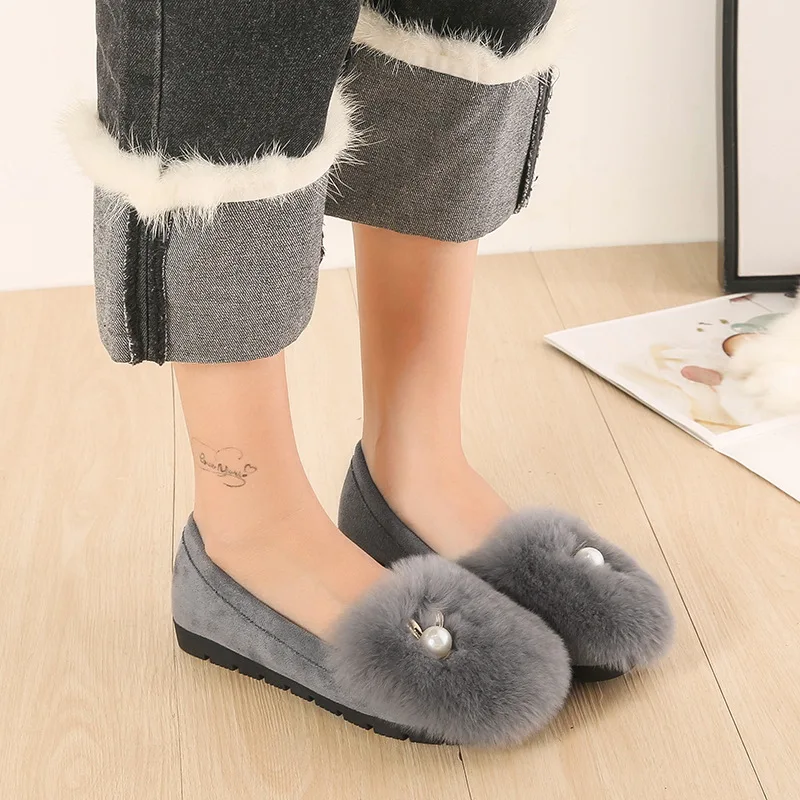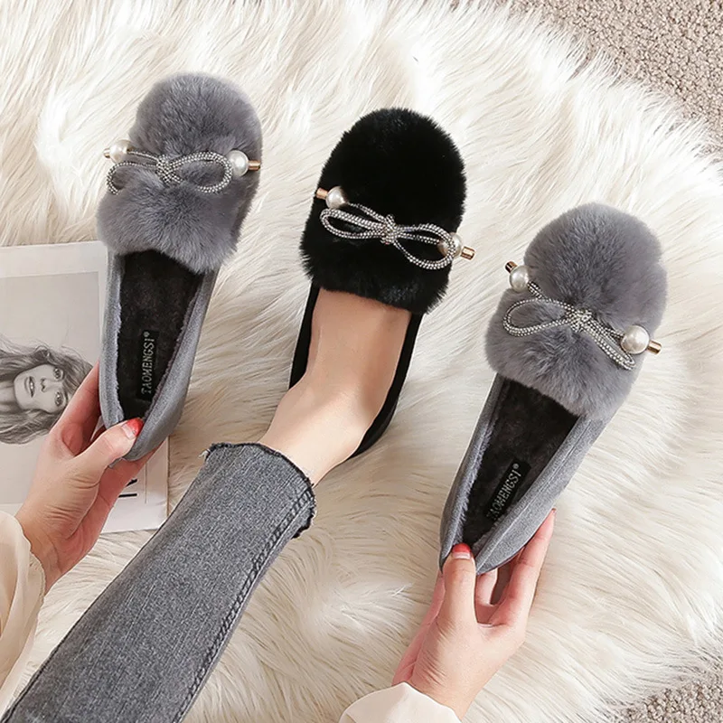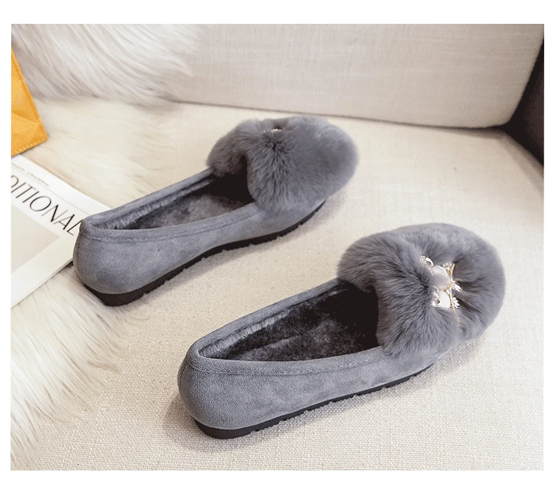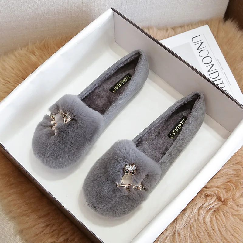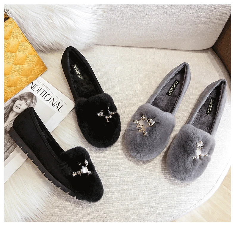 Big Size 34-43 Pom-Pom Rabbit Fur Shoes Women Owl Stone Moccasins Winter Plush Warm Boots Ladies Wool Flats Femme Cotton Loafers