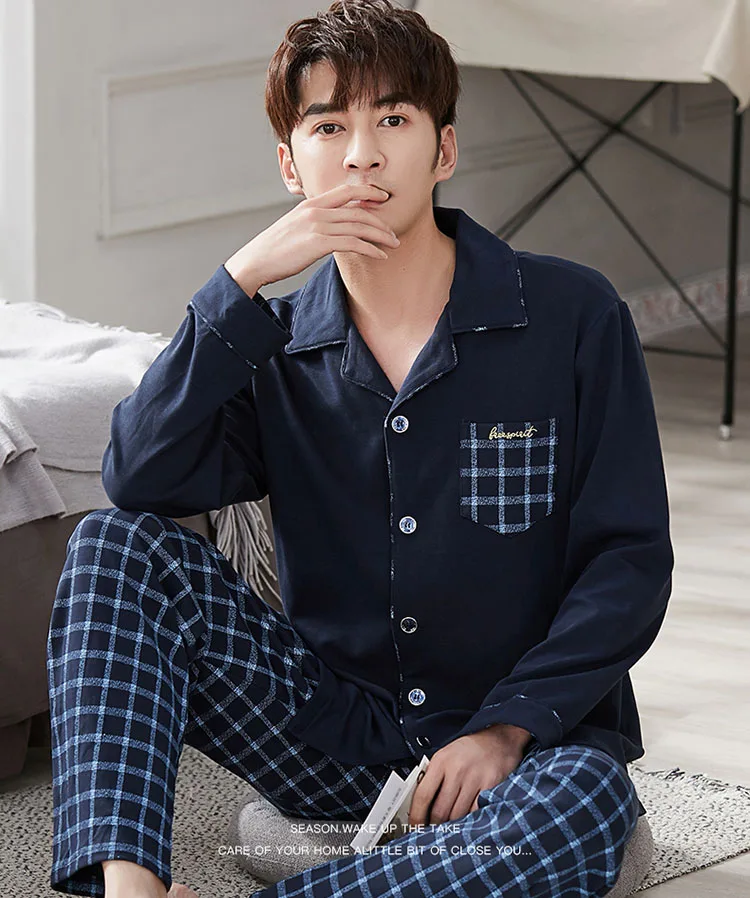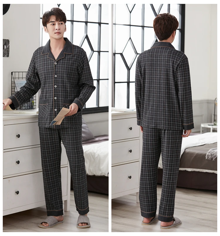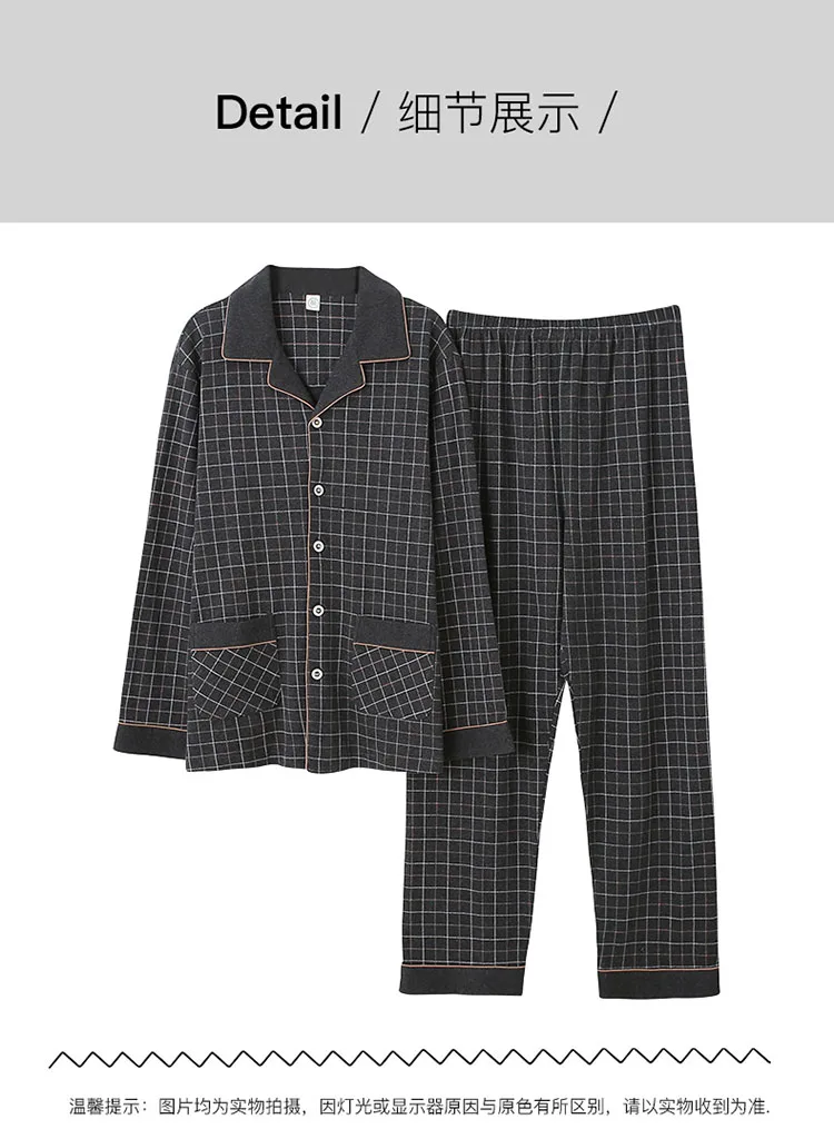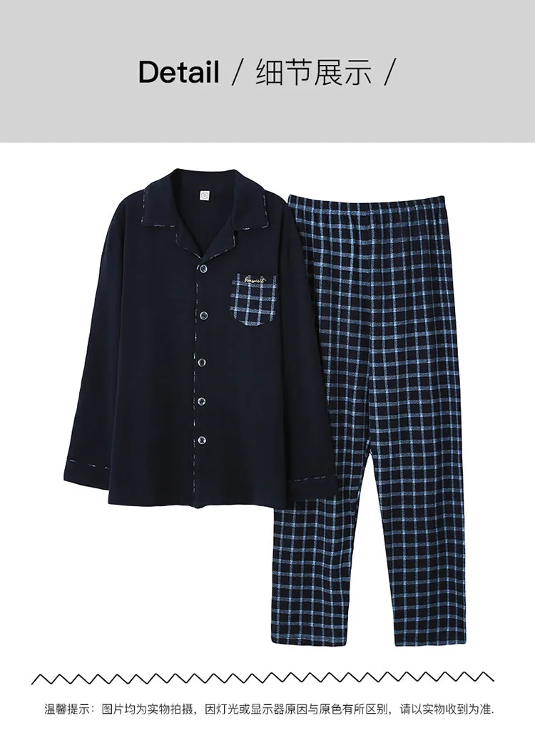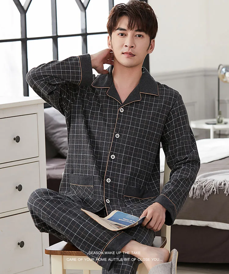 Big Size M-4XL Spring and Autumn Men Pajamas Set 100% Cotton Long Sleeve Sleepwear Male Turn-down Collar Plaid Pijama