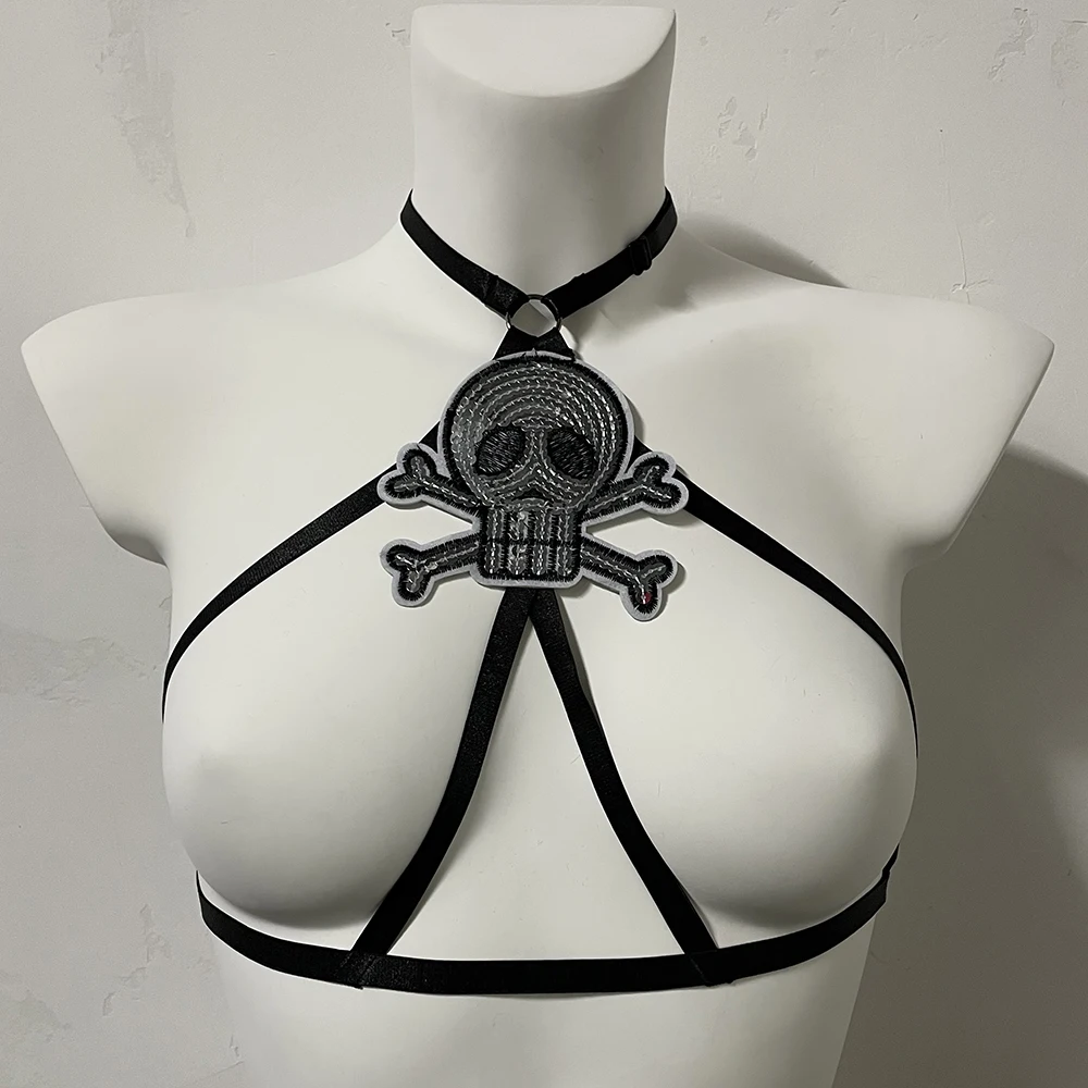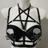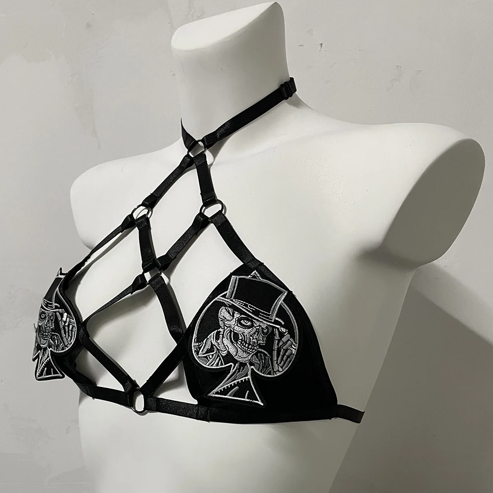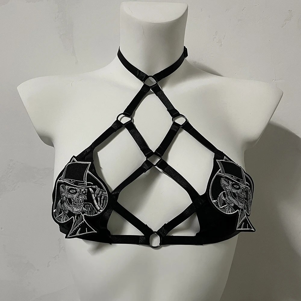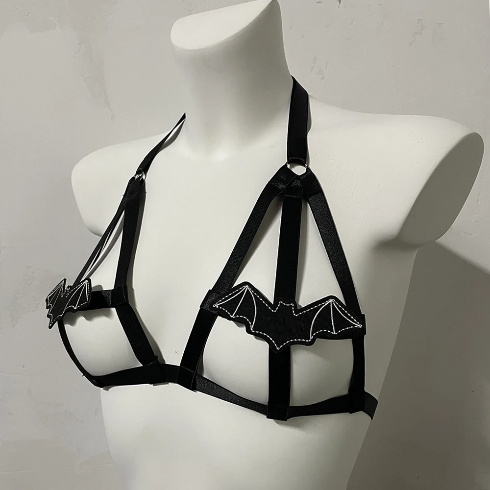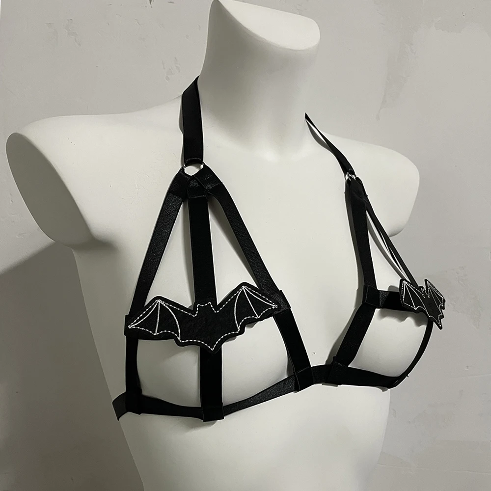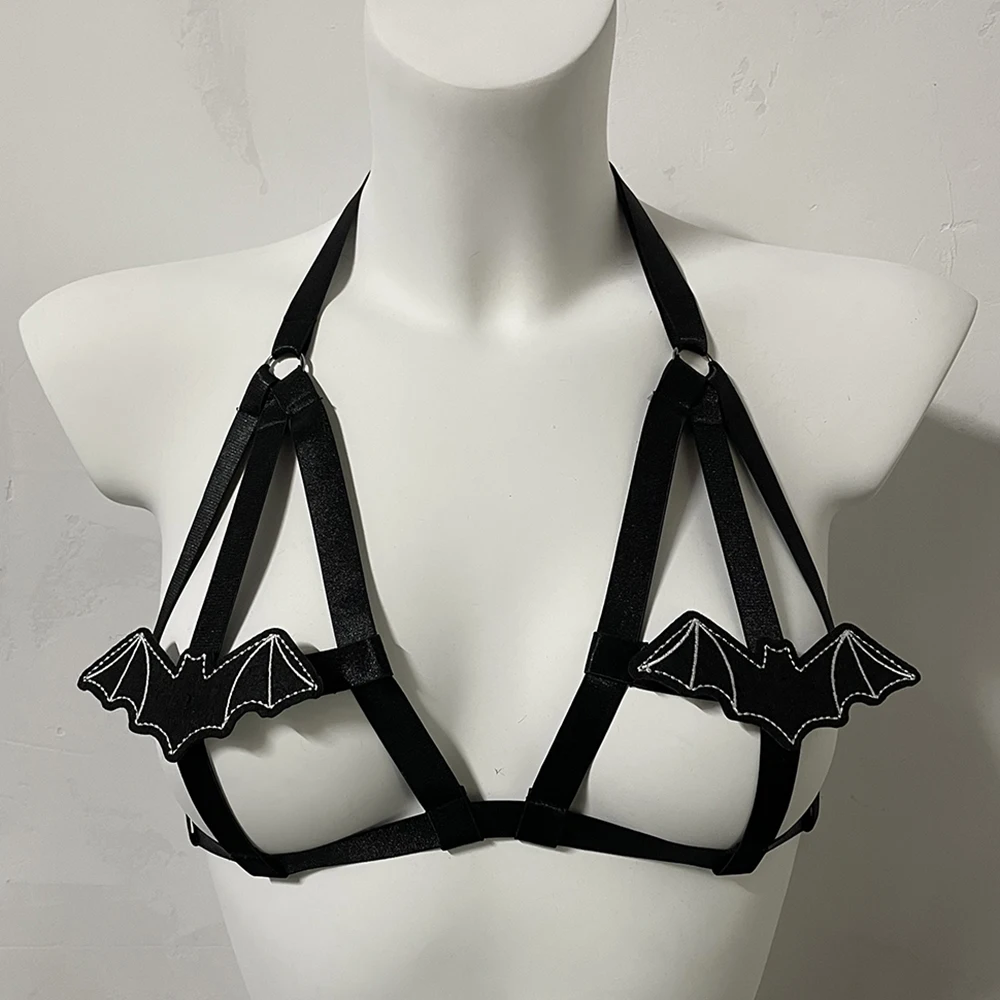 Black Halloween Body Harness Hollow Bralette Punk Bat Patch Crop Top Body Cage Goth Open Chest Harness Bra