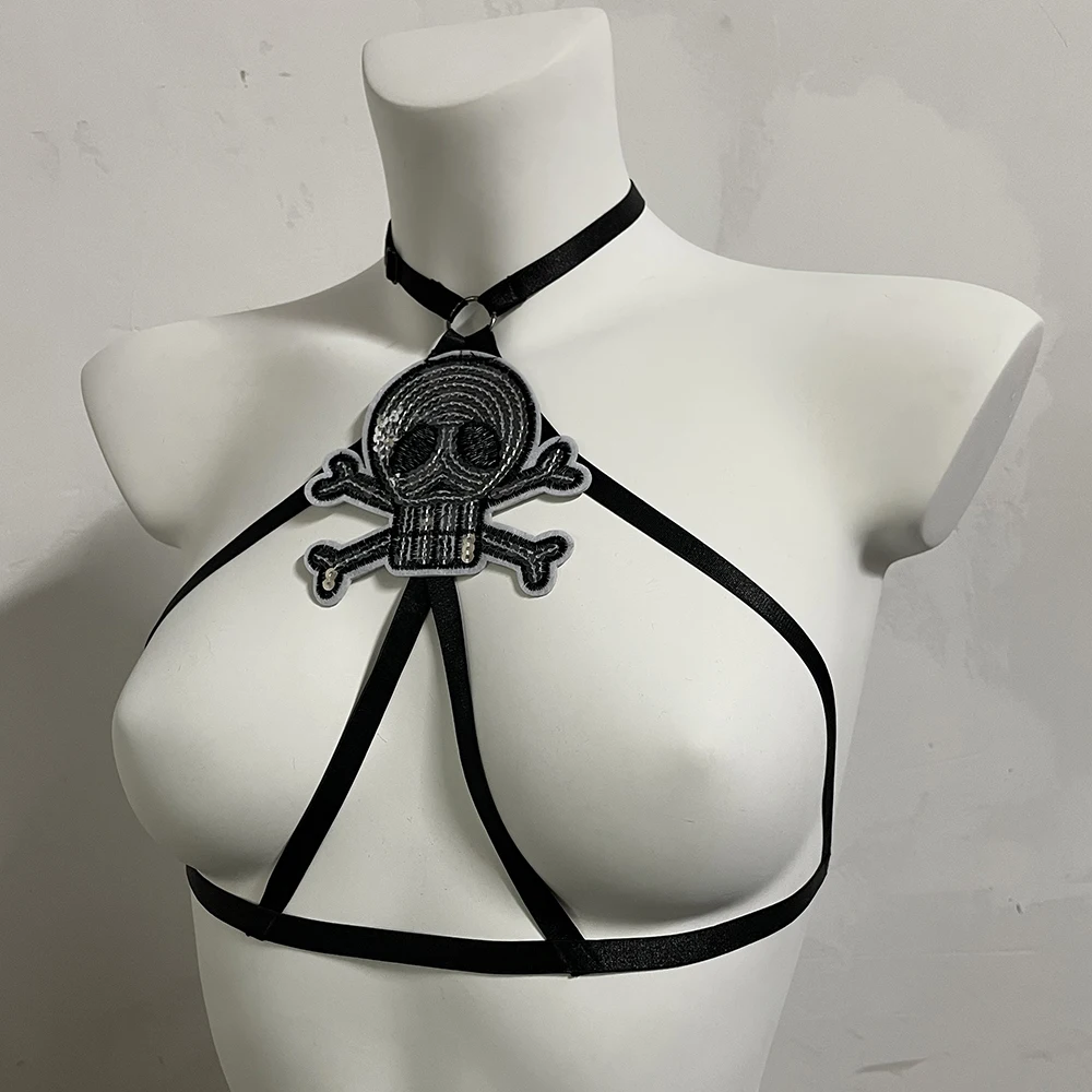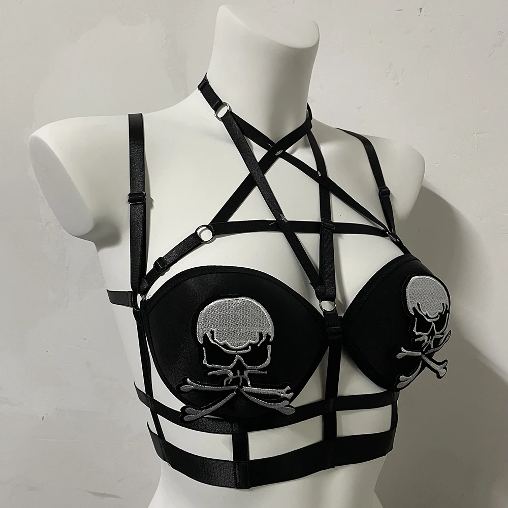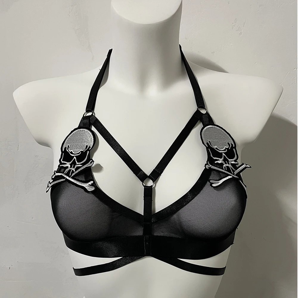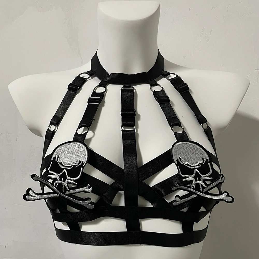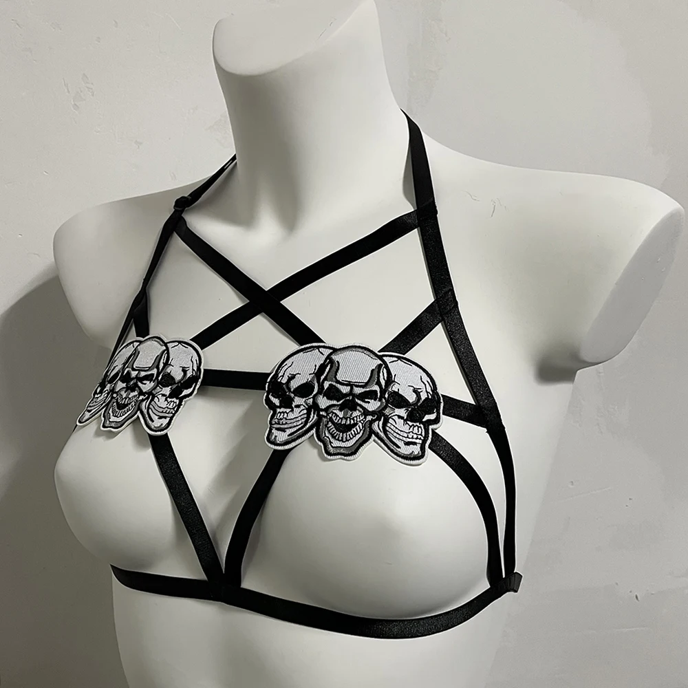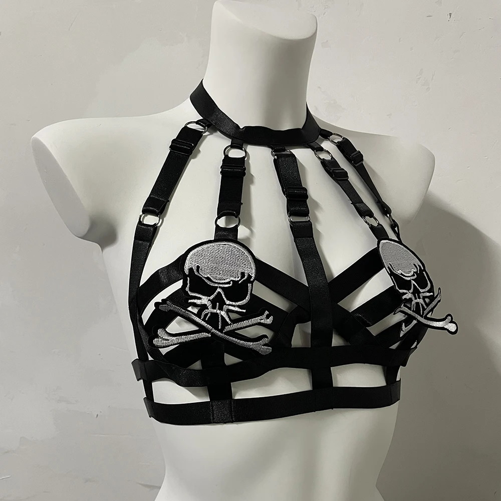 Black Halloween Body Harness Hollow Bralette Punk Bat Patch Crop Top Body Cage Goth Open Chest Harness Bra