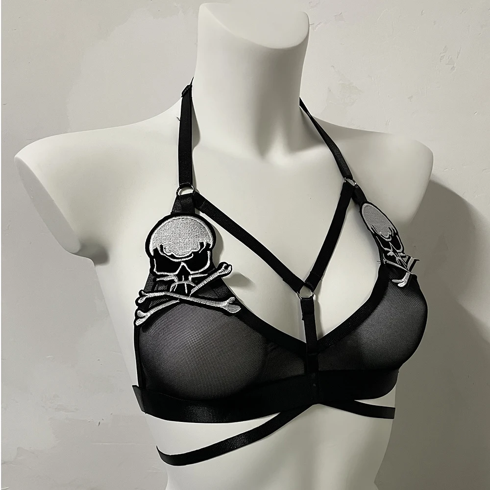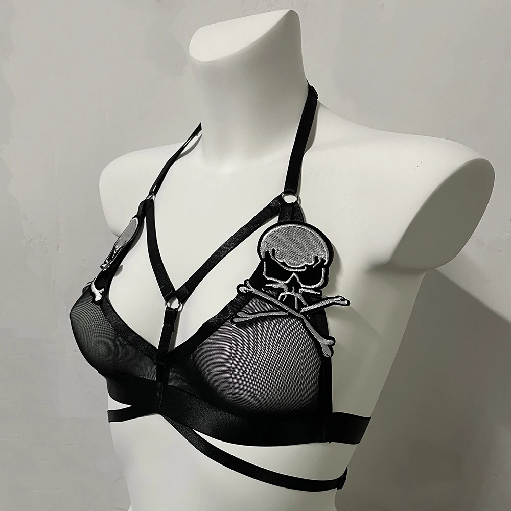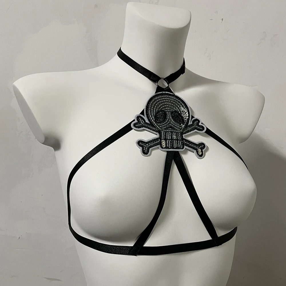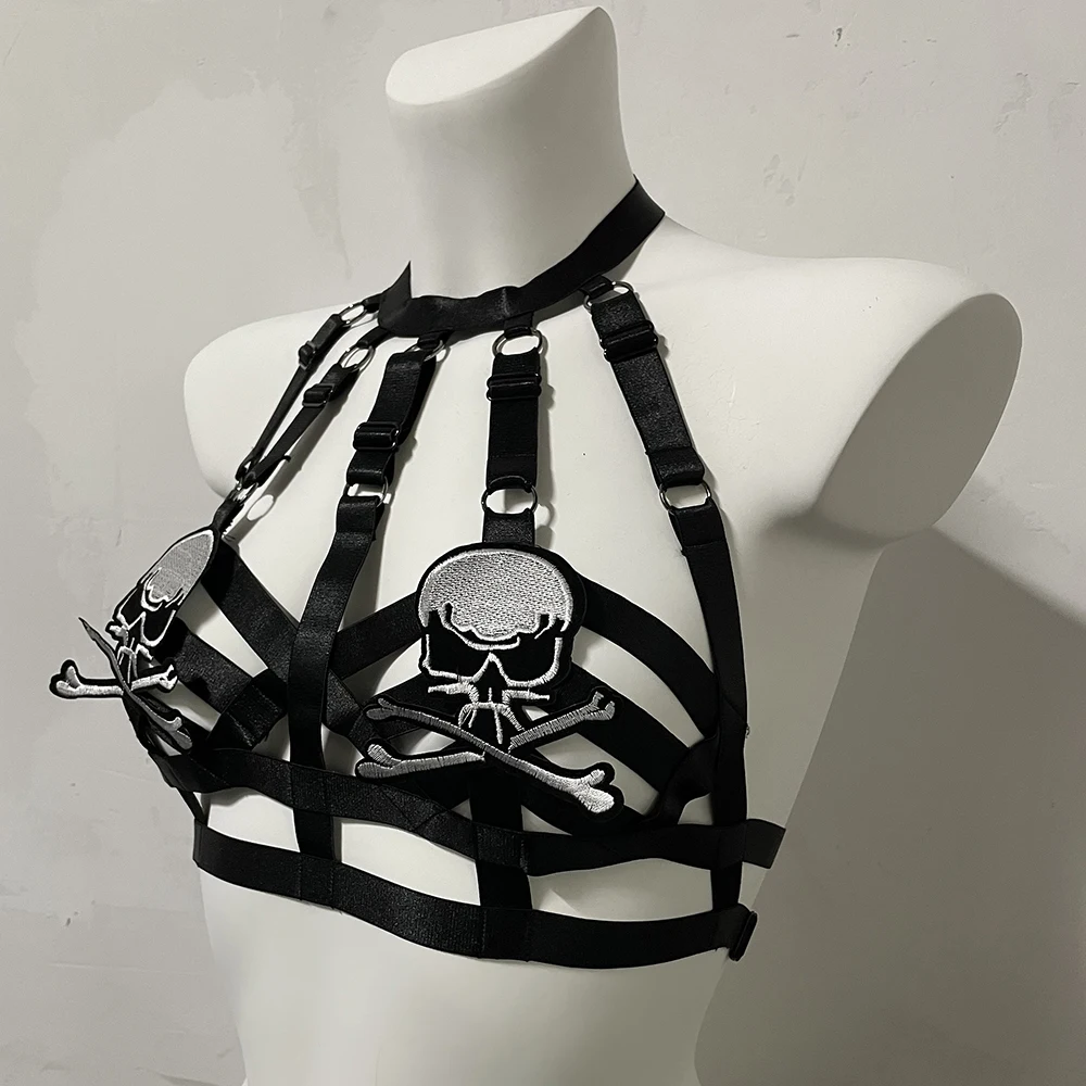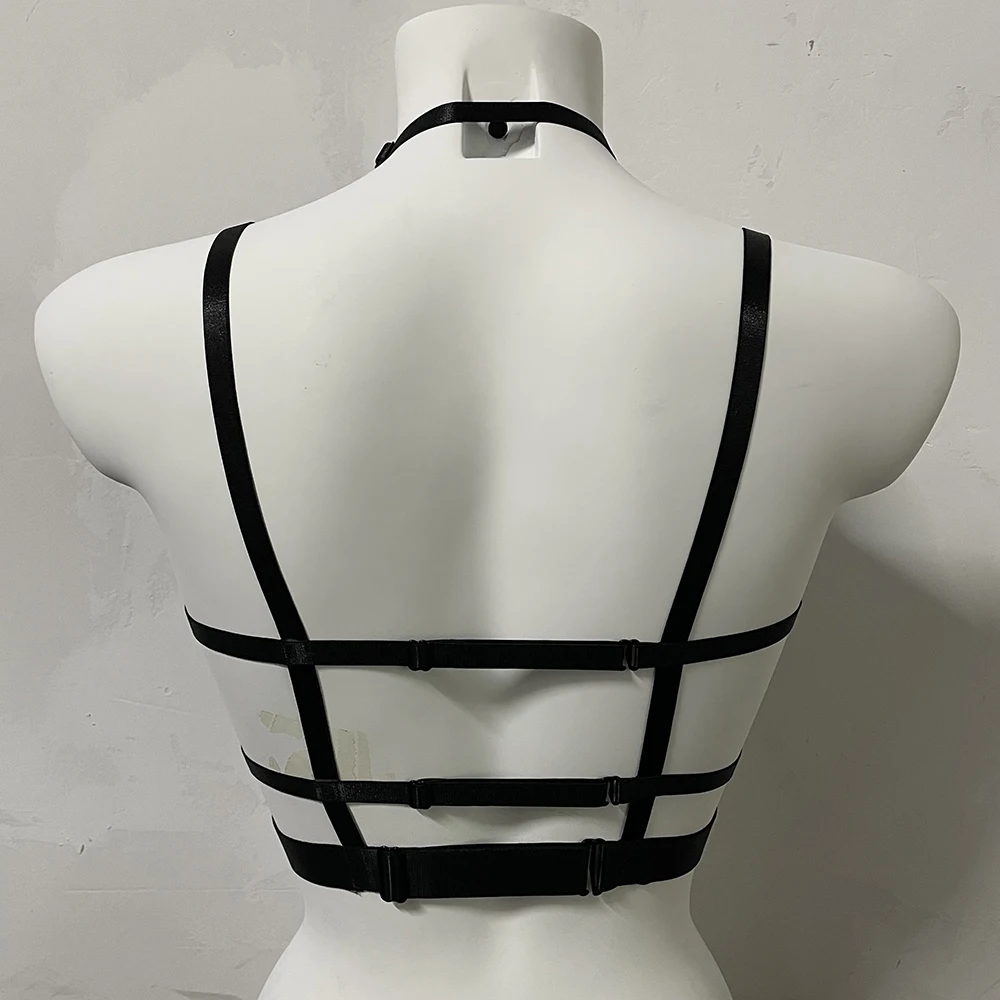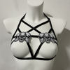 Black Halloween Body Harness Hollow Bralette Punk Bat Patch Crop Top Body Cage Goth Open Chest Harness Bra