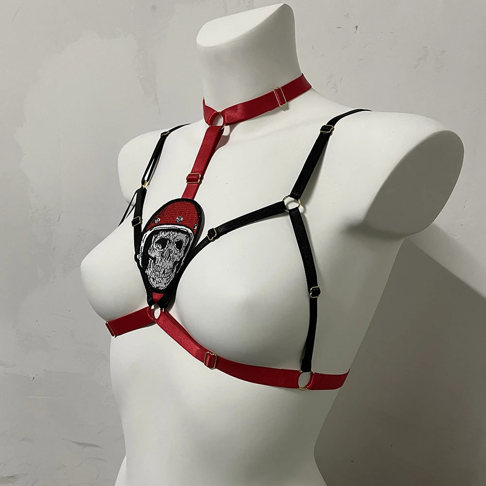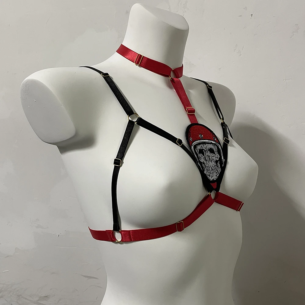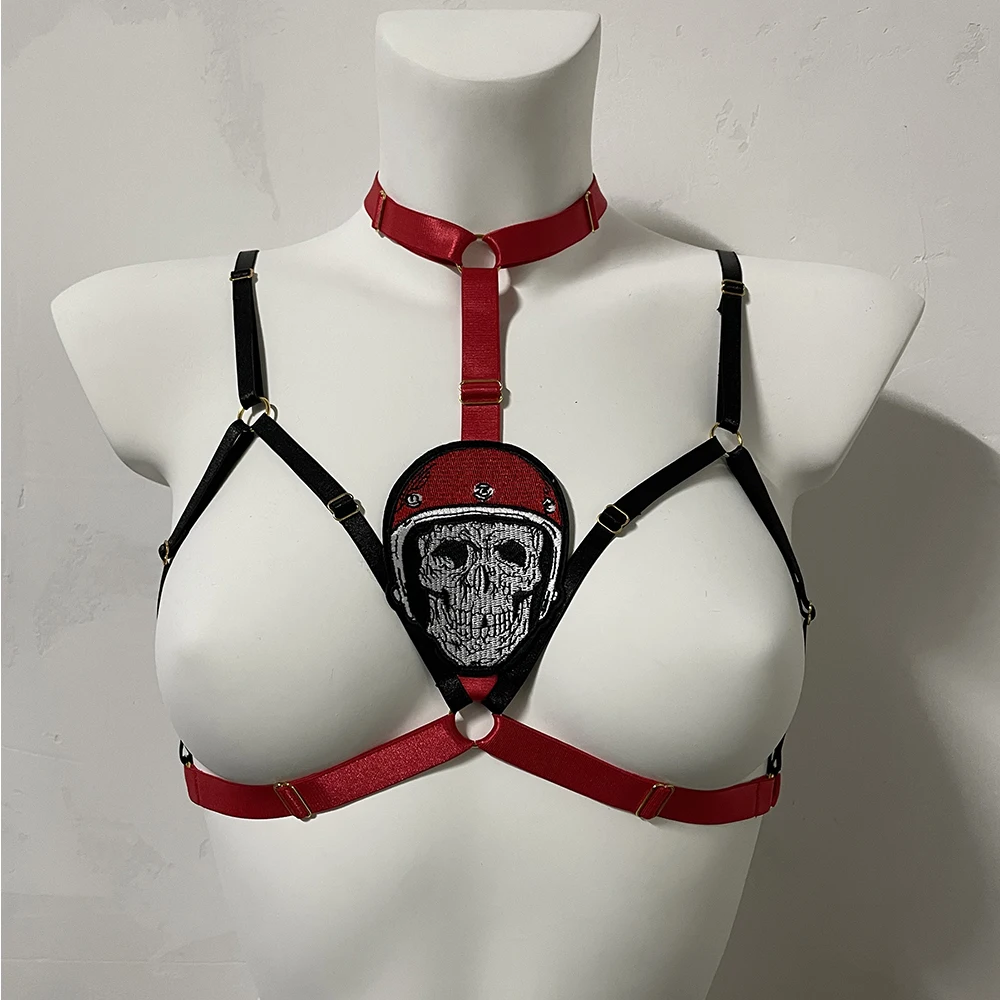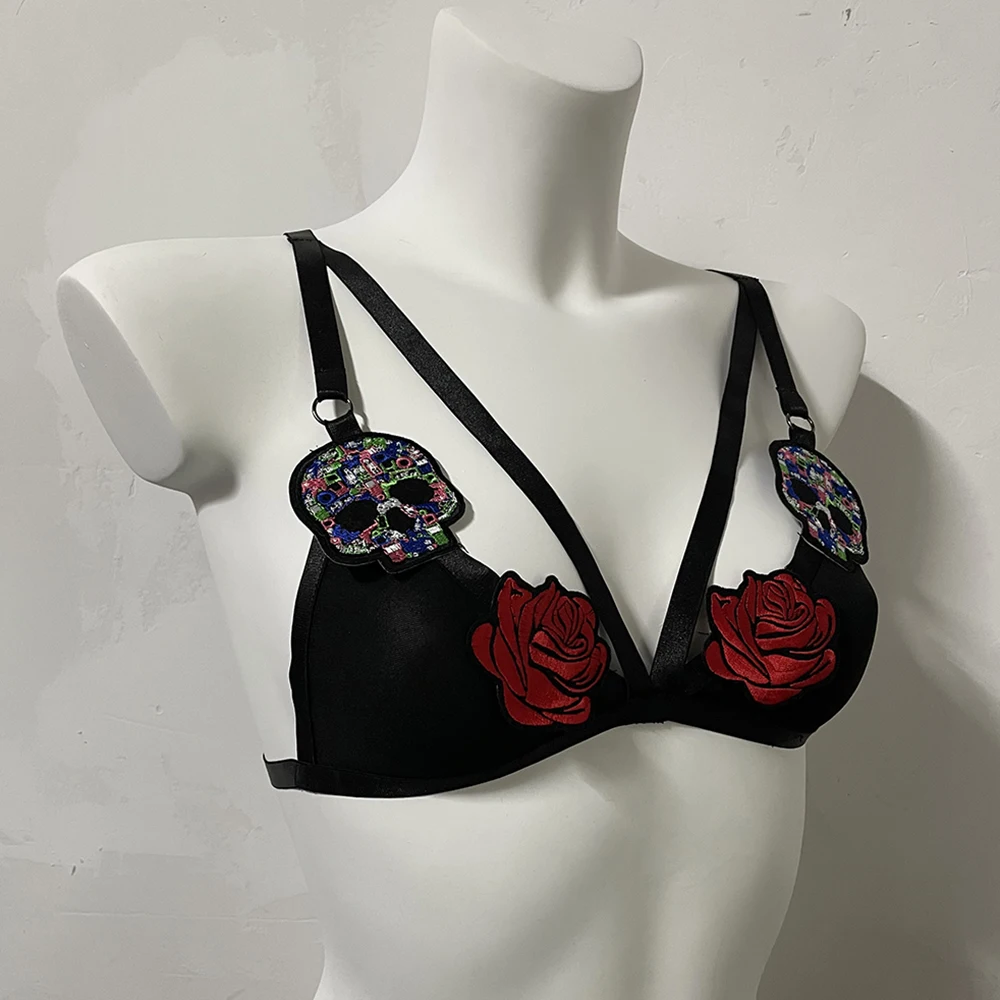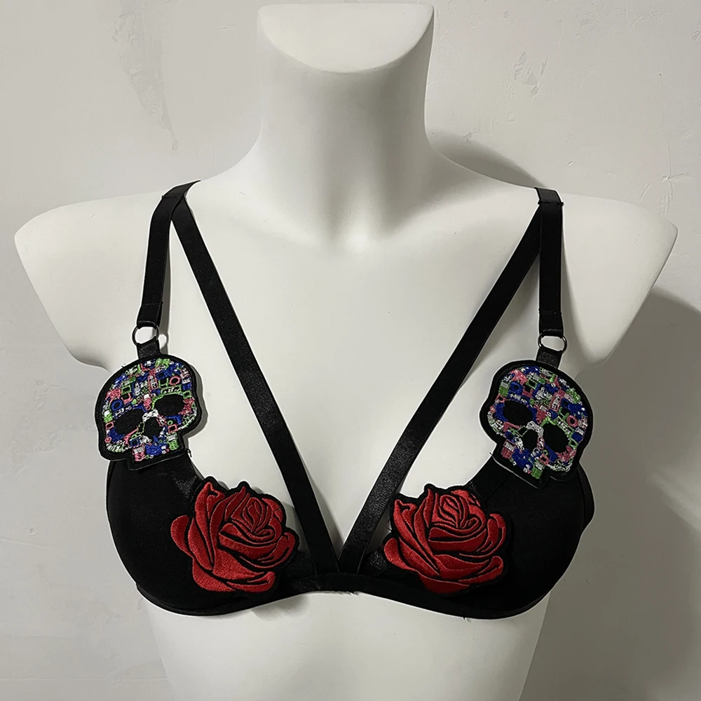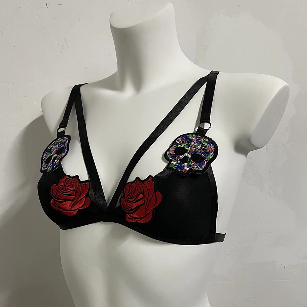 Black Halloween Body Harness Hollow Bralette Punk Bat Patch Crop Top Body Cage Goth Open Chest Harness Bra