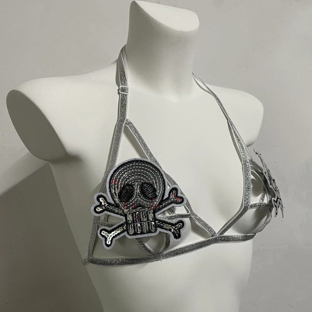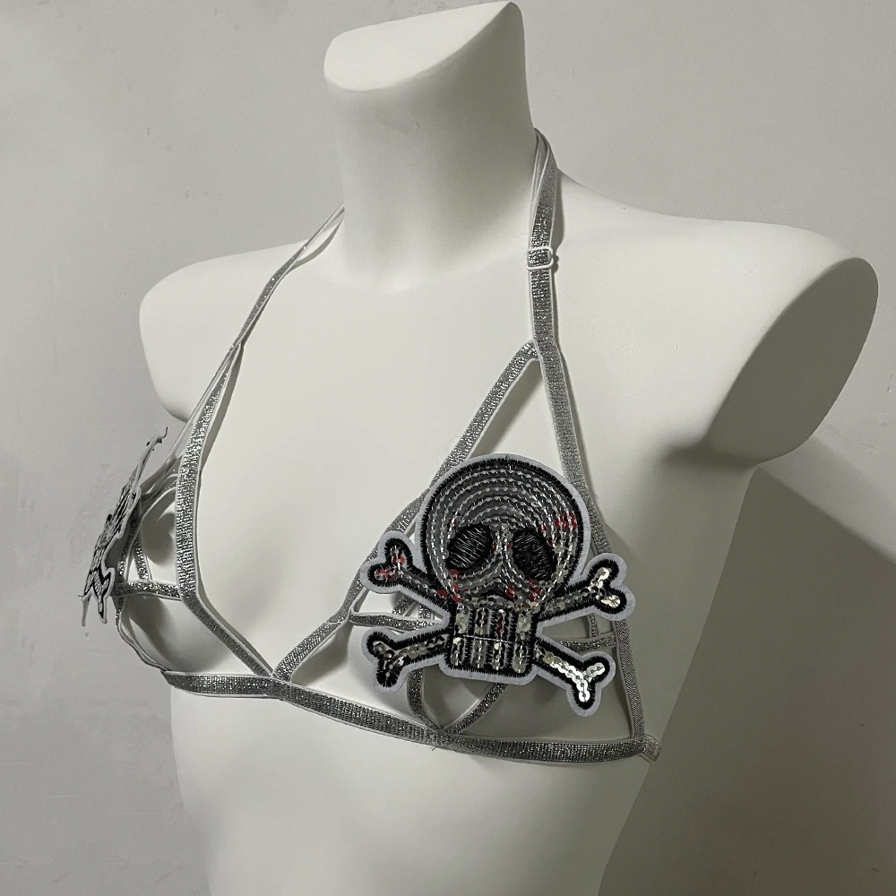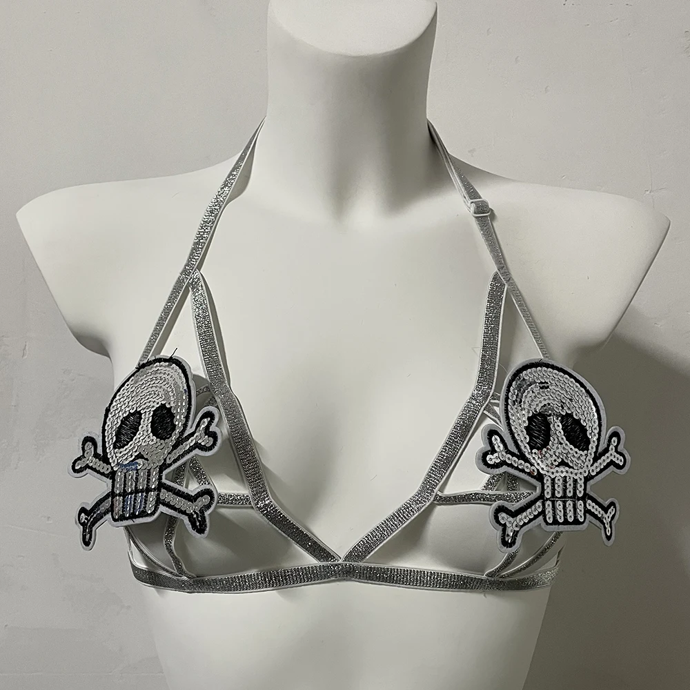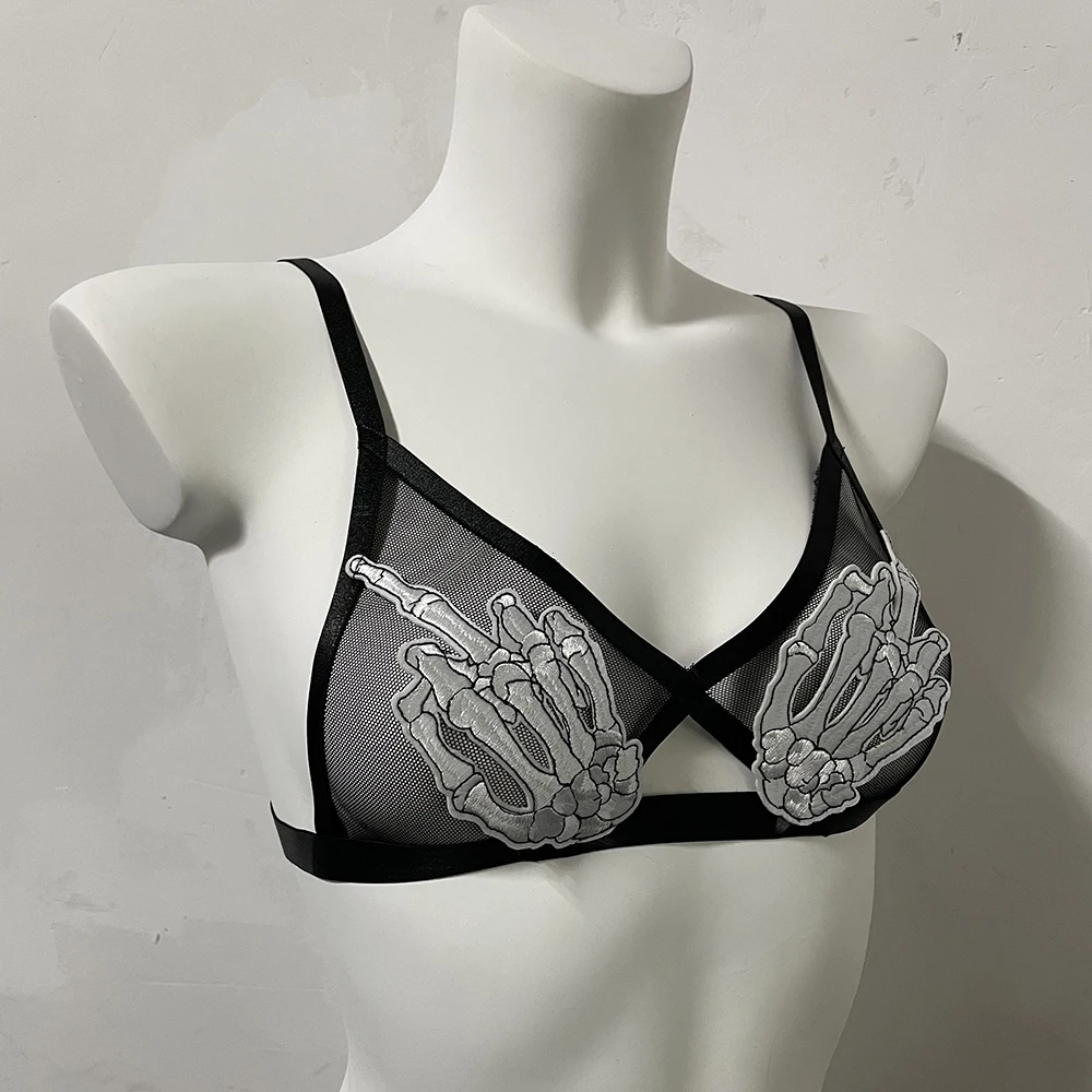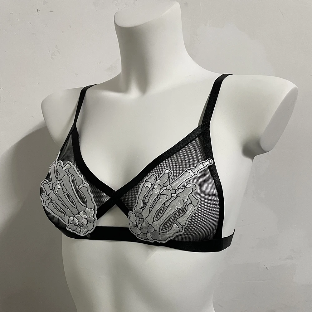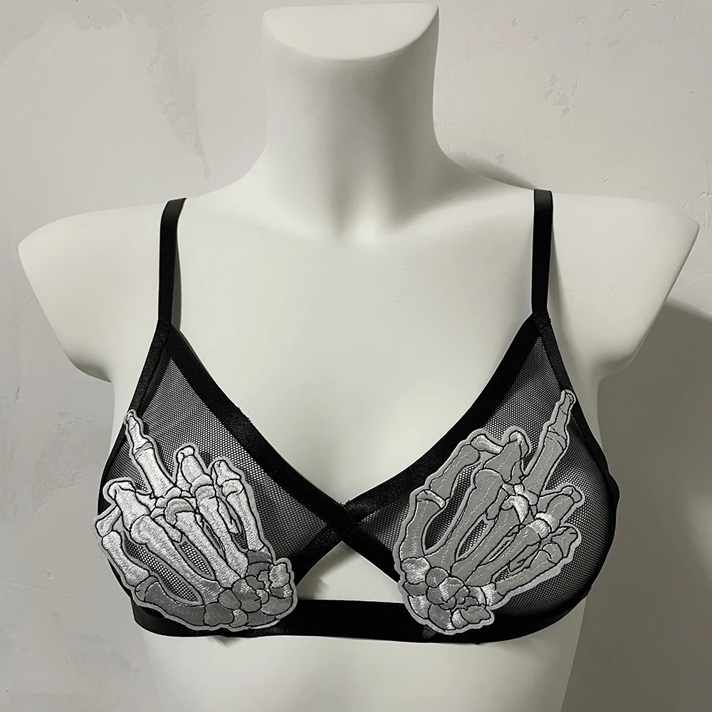 Black Halloween Body Harness Hollow Bralette Punk Bat Patch Crop Top Body Cage Goth Open Chest Harness Bra
