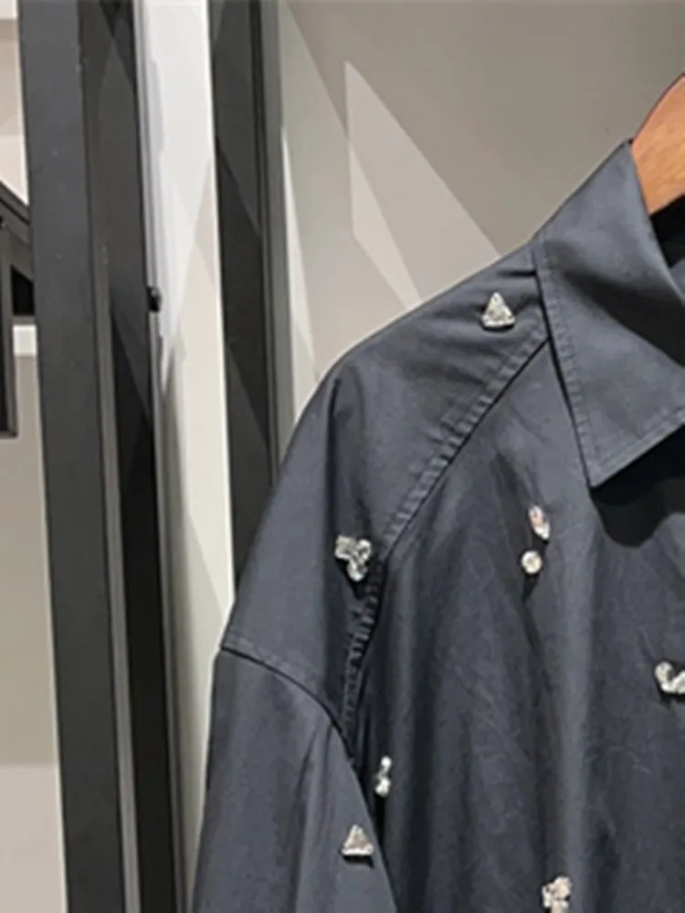 Black Rhinestone Decoration Women Set Single Breasted Turn-Down Collar Loose Shirt or Drawstring Elastic Waist Shorts for Lady