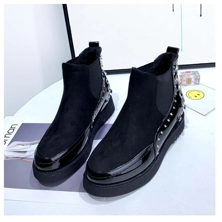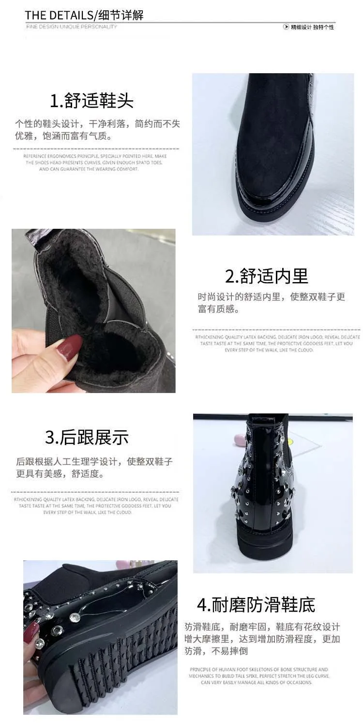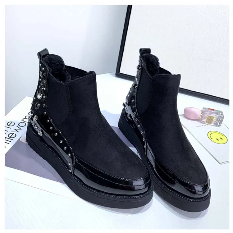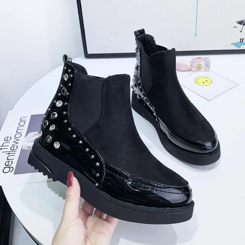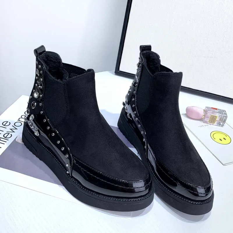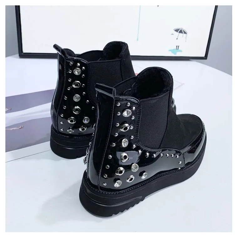 Black snow boots women thicken winter punk creepers crystal rivets booties plush lined height increase brogues patchwork 2020