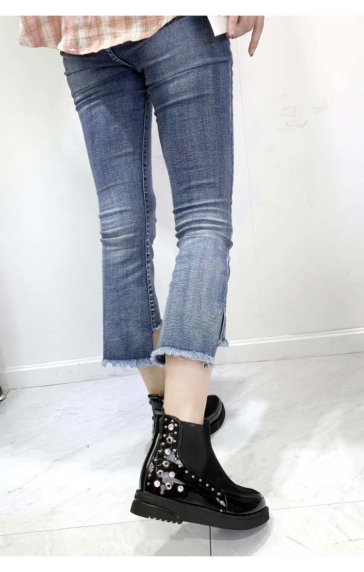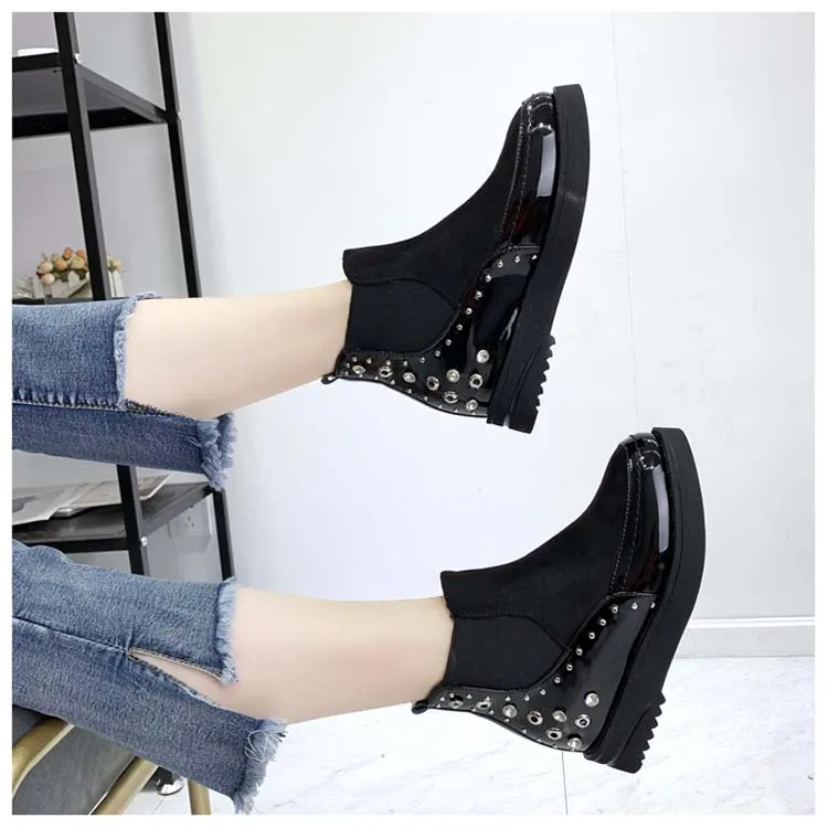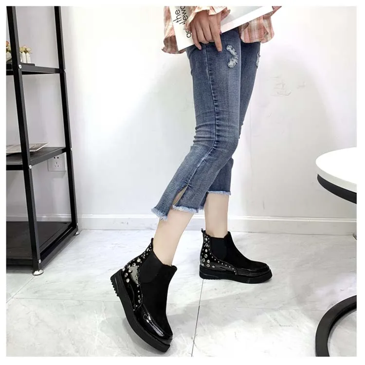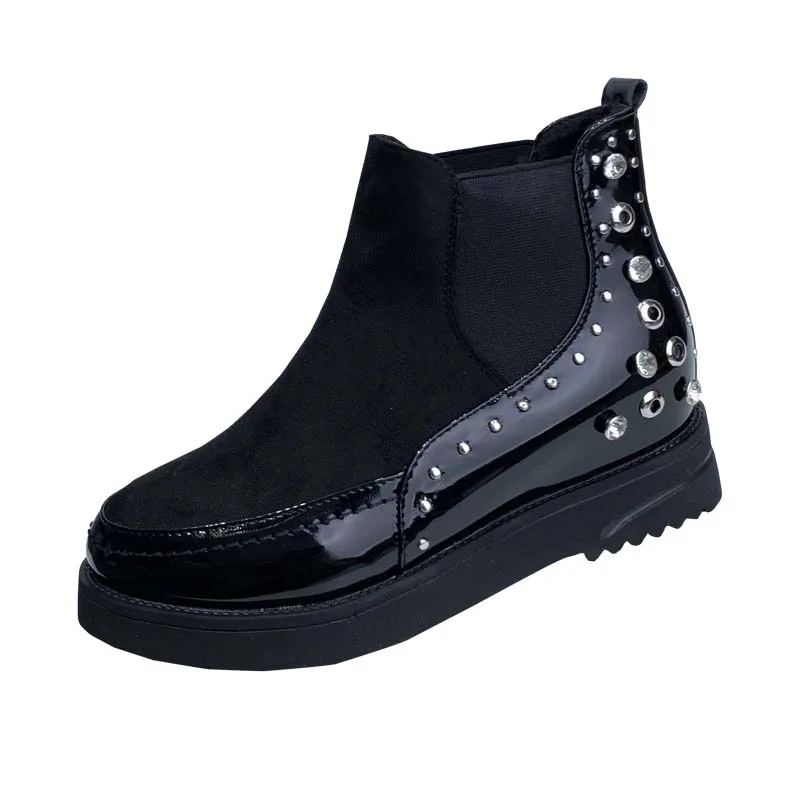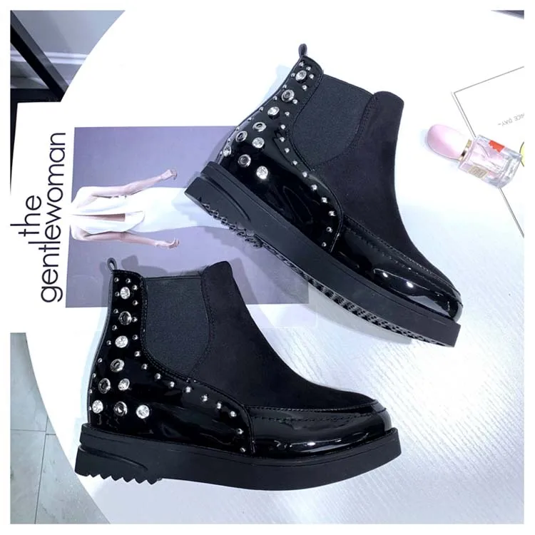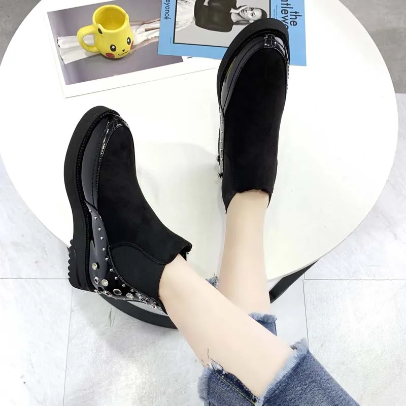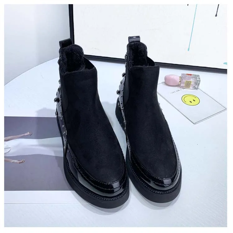 Black snow boots women thicken winter punk creepers crystal rivets booties plush lined height increase brogues patchwork 2020