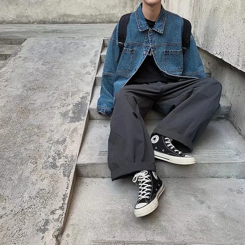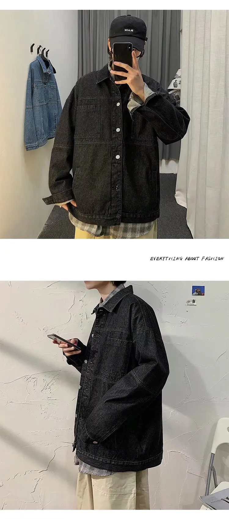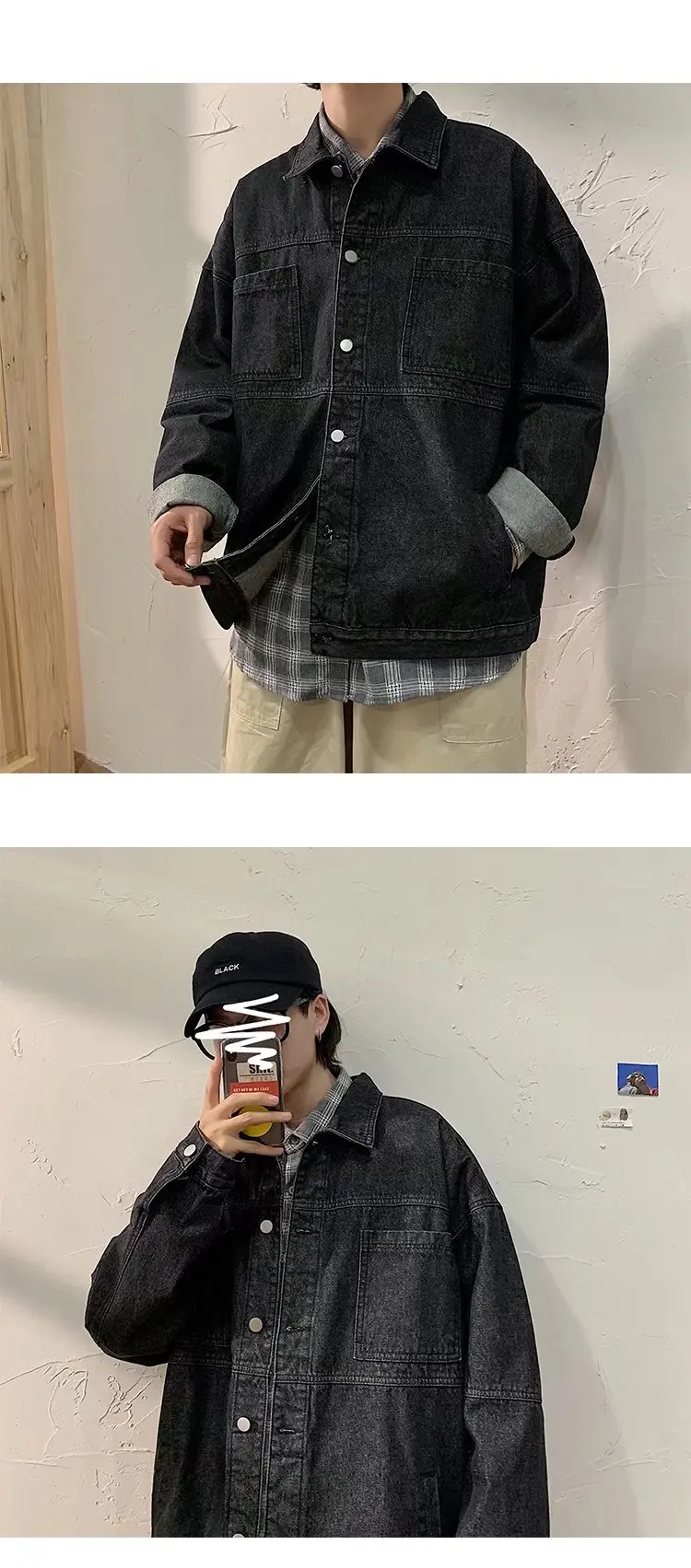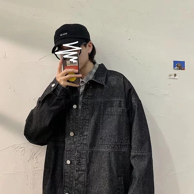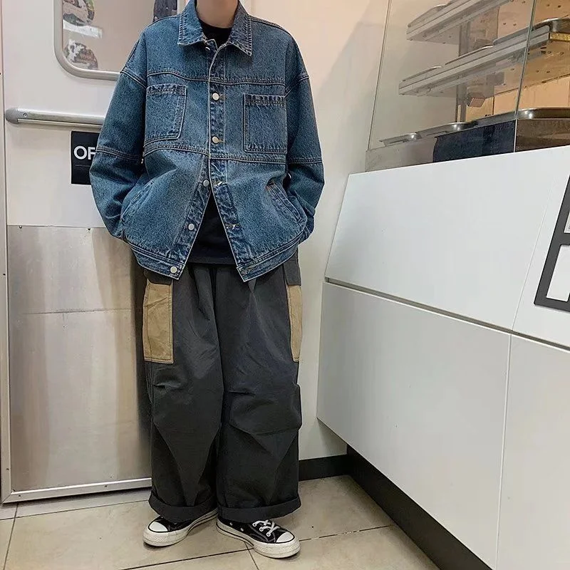 Blue Black Denim Jacket Men Fashion Retro Pocket Denim Jackets Mens Streetwear Loose Hip Hop Bomber Jacket Men Outwear M-2XL
