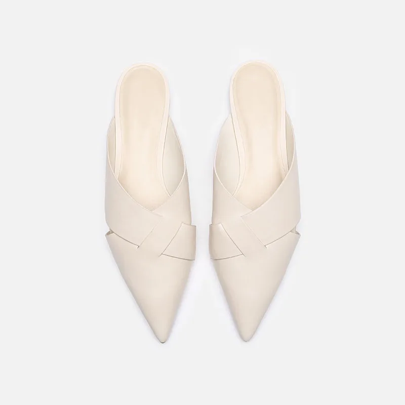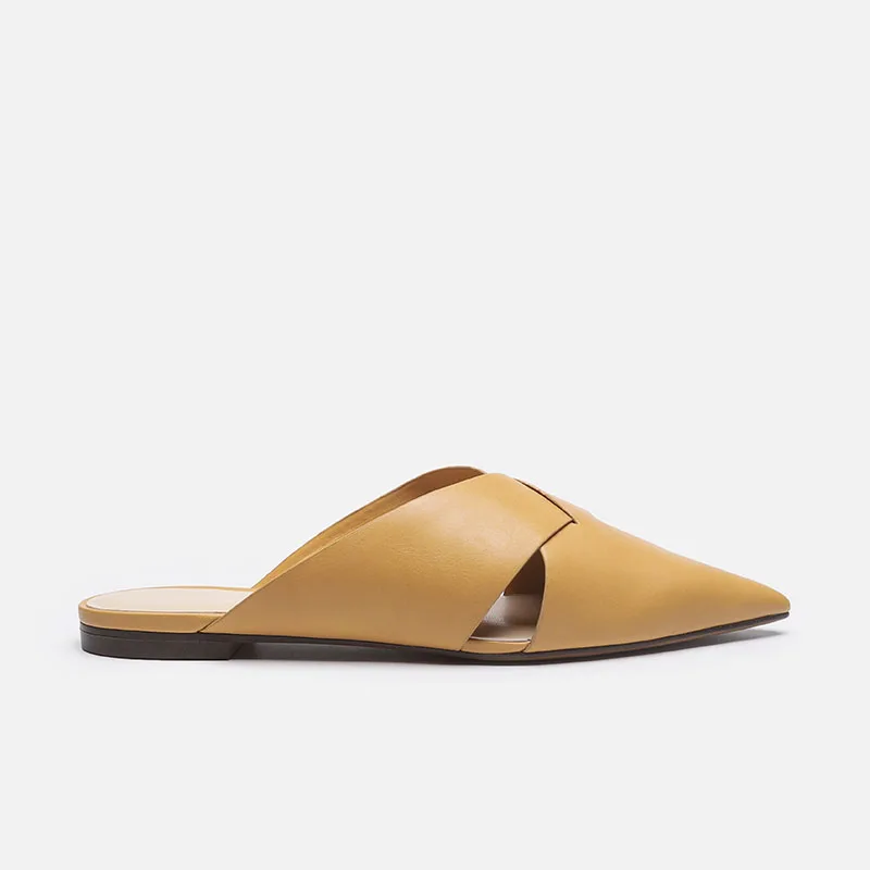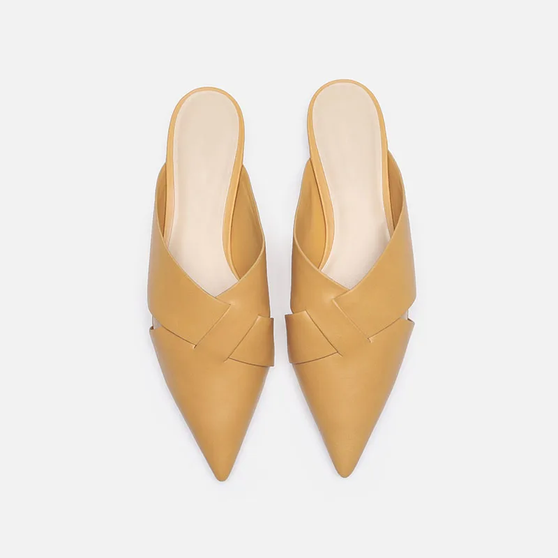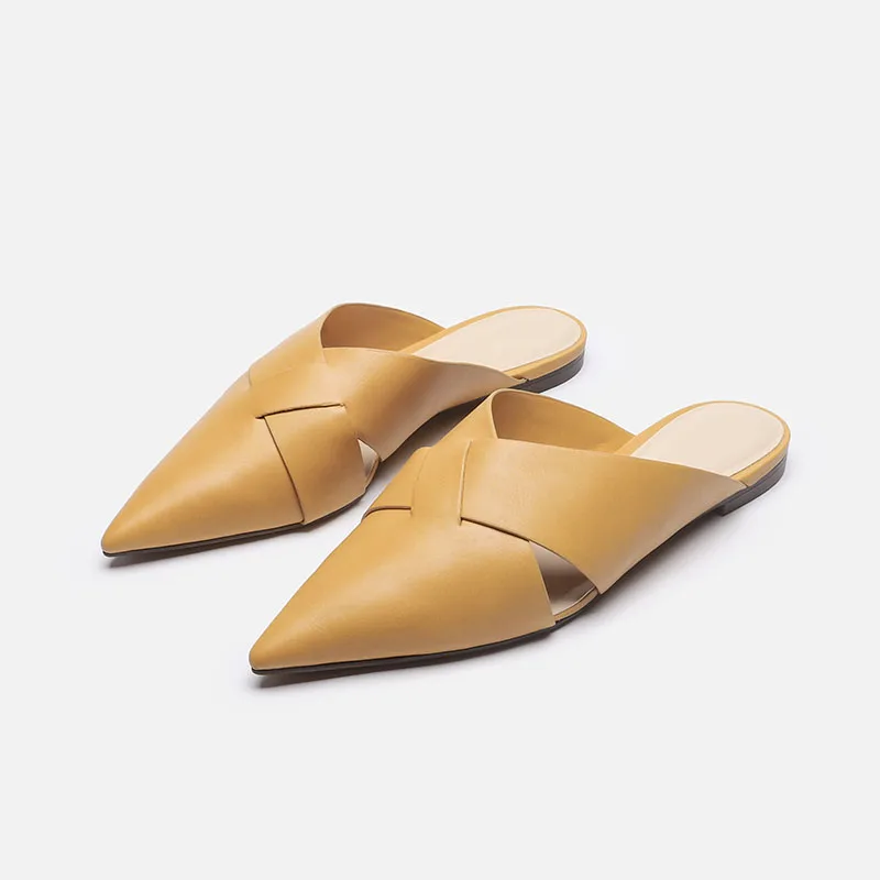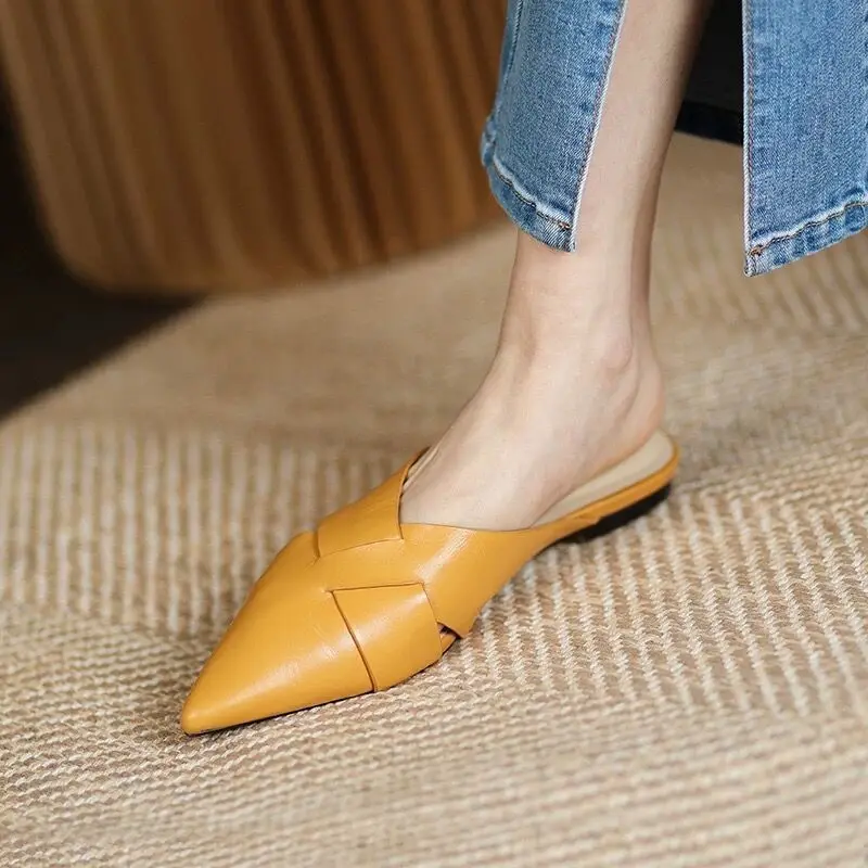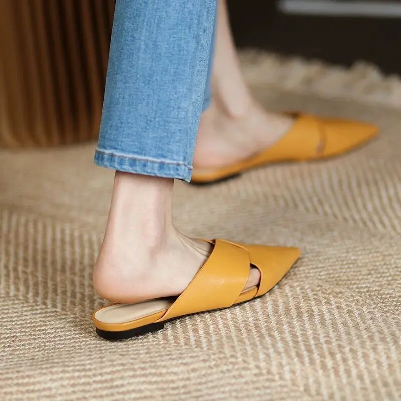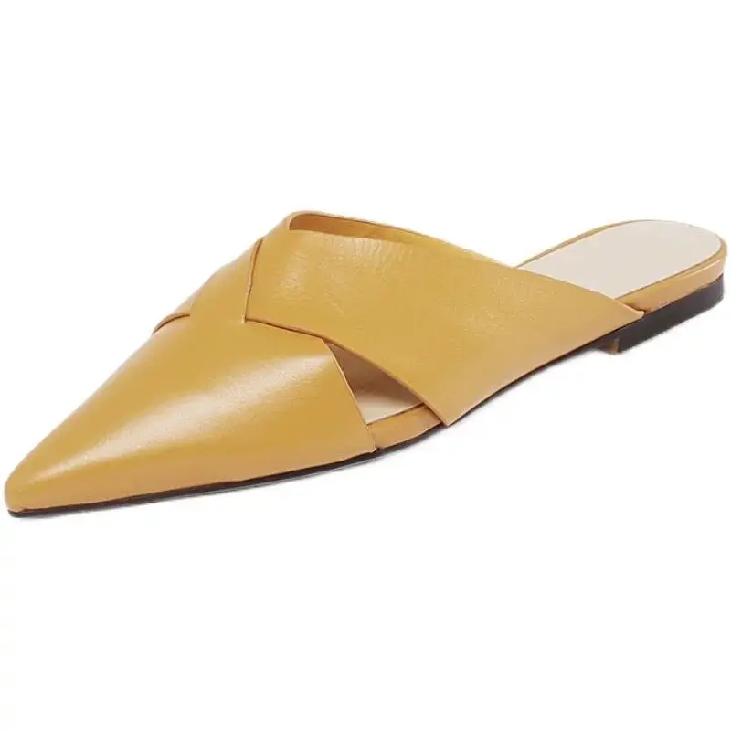 Brief Leather Cross Belt Slides Ladies Pointed Toe Mules Hollow Slippers Woman Flat Sandalias Femininas Yellow Slides Shoes 2023