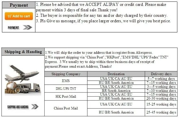Packages from our warehouse in China will be shipped by ePacket or EMS depending on the weight and size of the product. Packages shipped from our US warehouse are shipped through USPS.