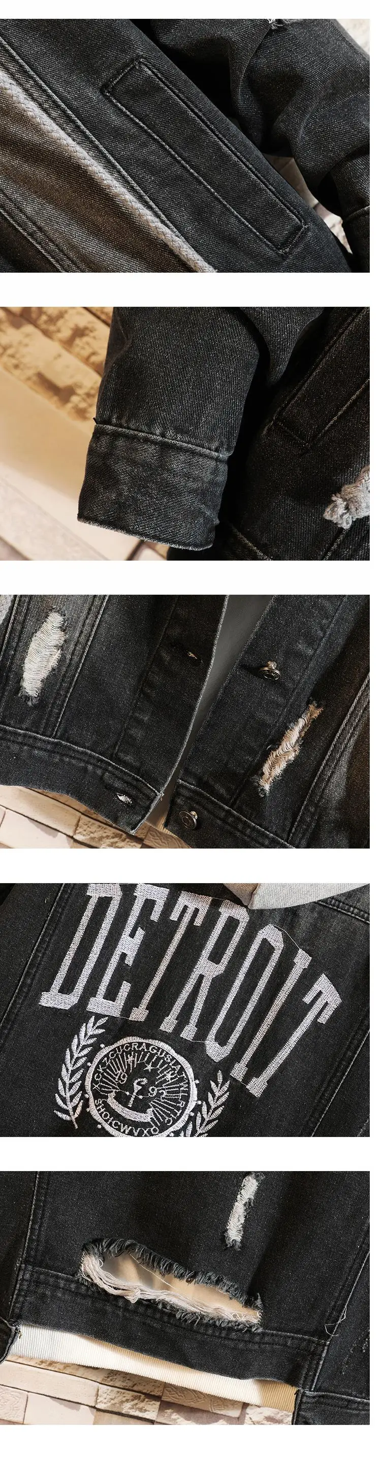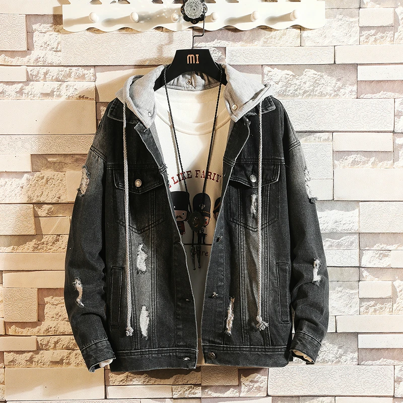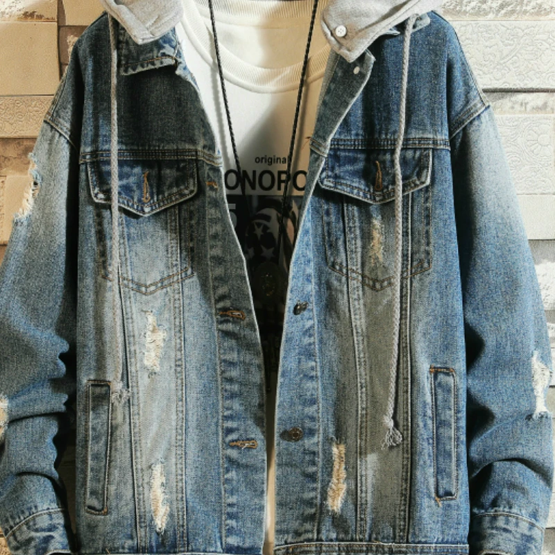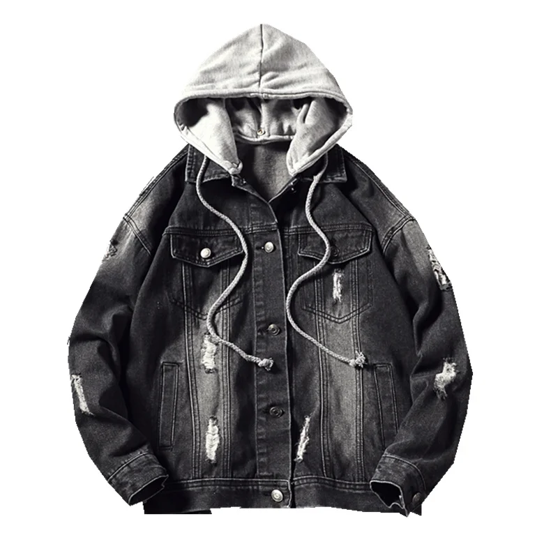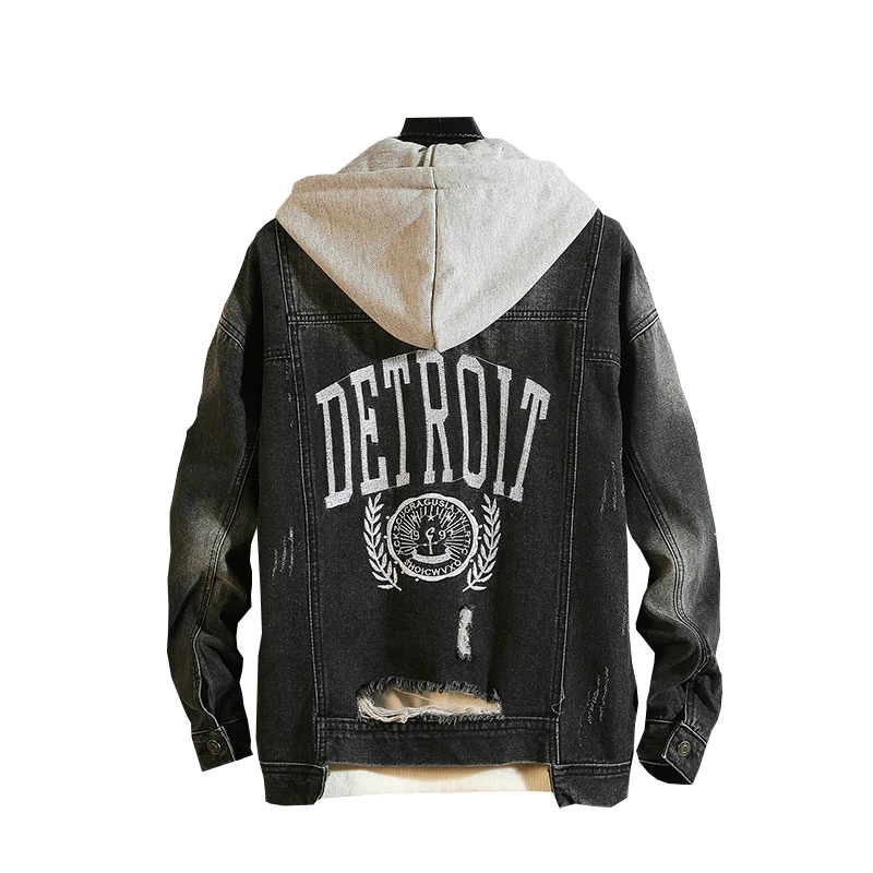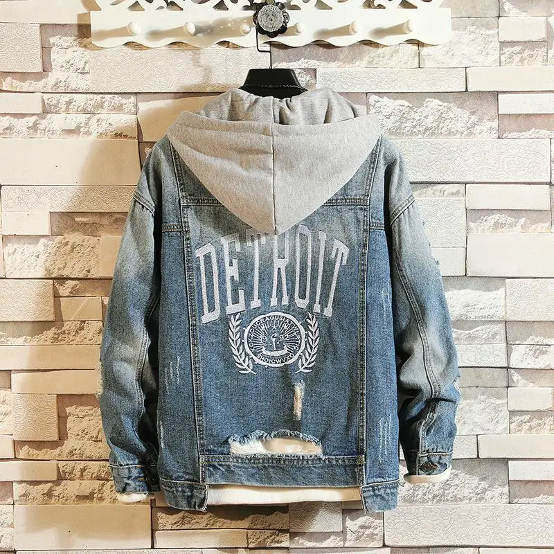 Casual Jacket Pop Mens Denim Jacket Coat Loose Fit Men Hip Hop Ripped Jeans Jackets Hoodies Cowboy Plus Size 5XL Hat Detachable