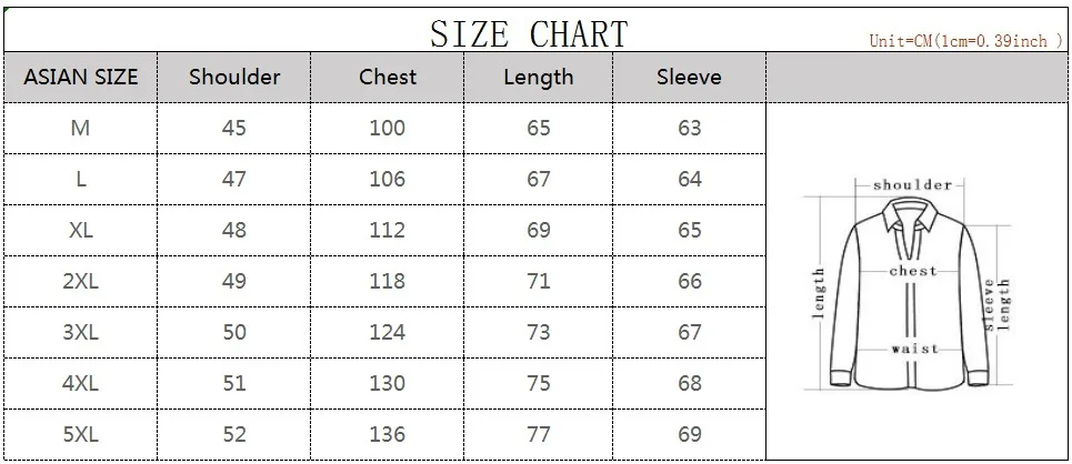 Note:We sell ASIAN SIZE.It is about2-3 sizeSMALLERthan US,UK,AU,EU size.Please choose the size according to our size form.All the dimensions we have personally measured and reality try. When you place the order please live the message with your Shoulder(CM) and Chest(CM) .We will help you to confirm the size.Think you for buying !