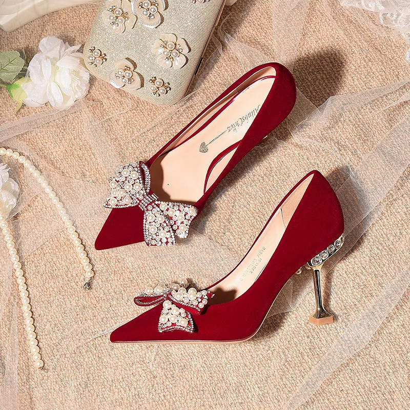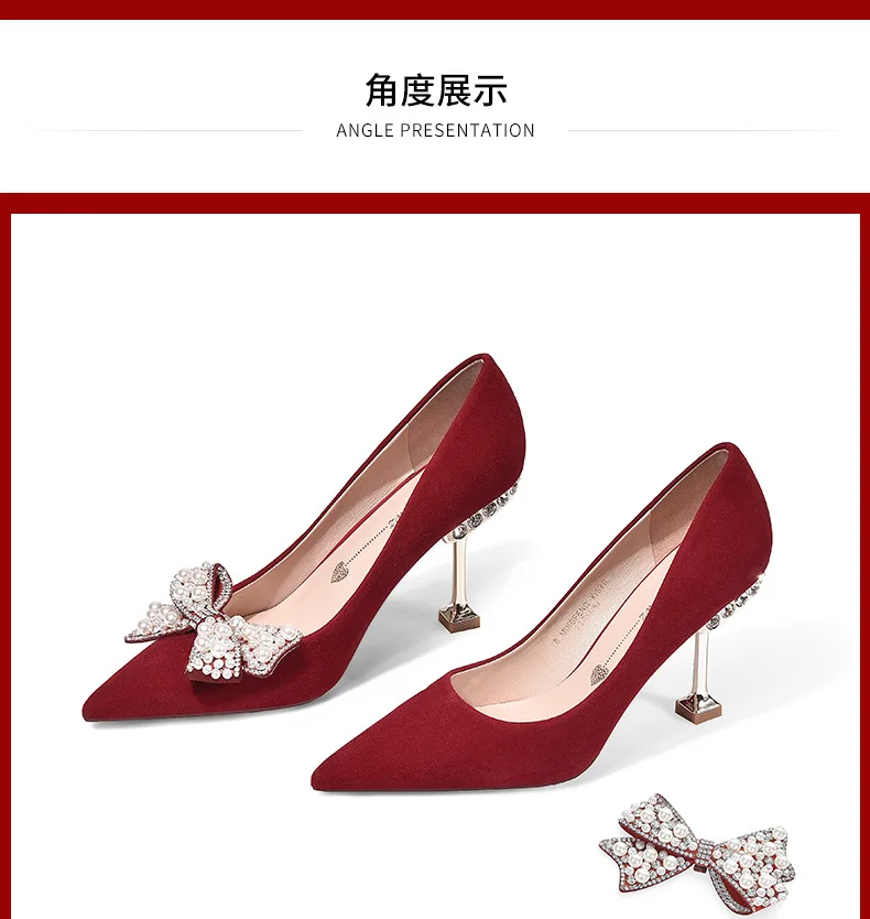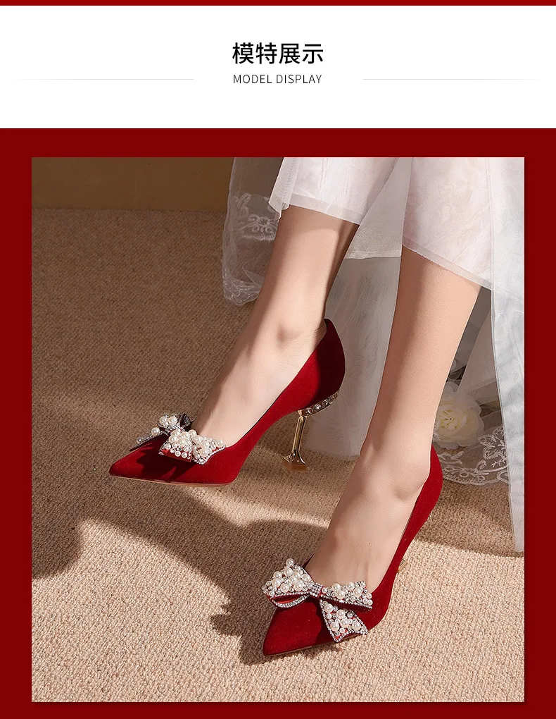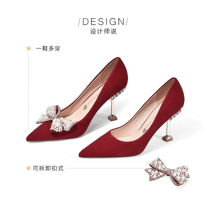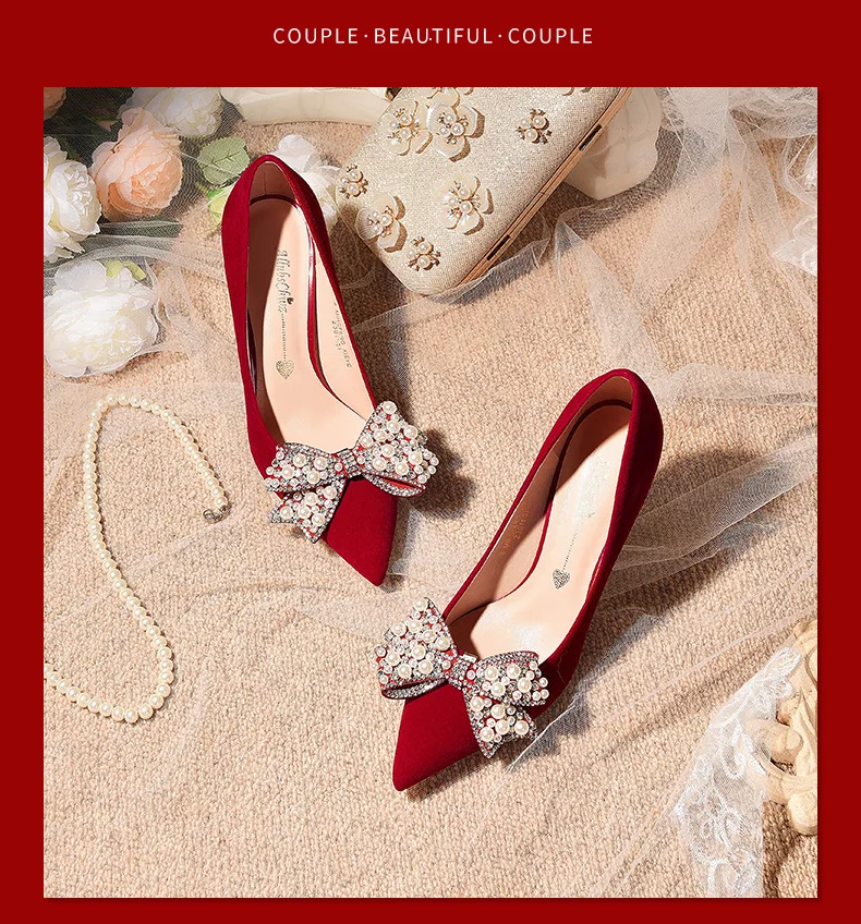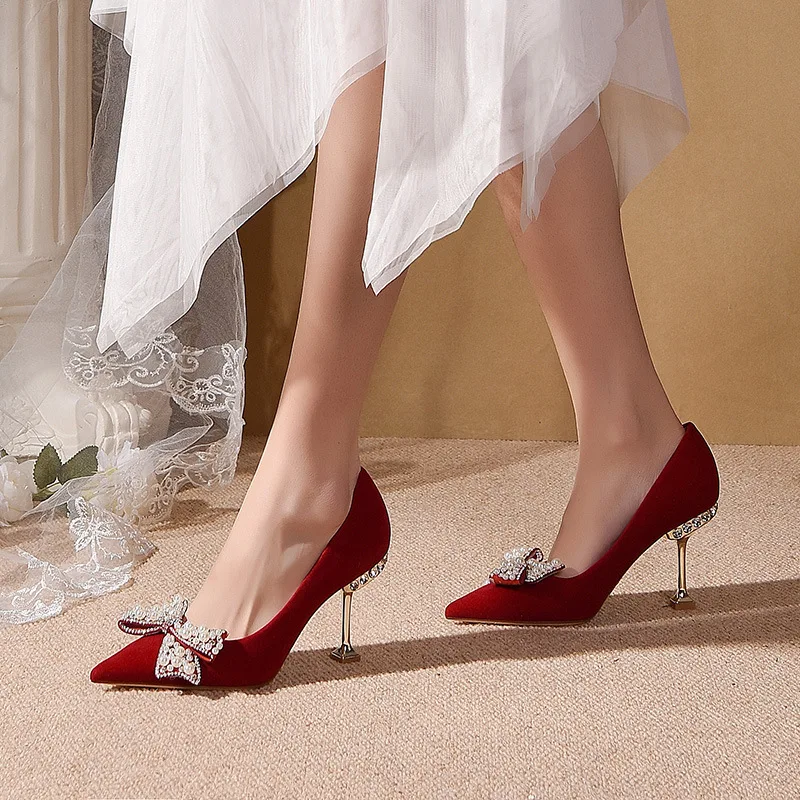 Chic Beads bow-knot wedding shoes woman pumps pointed toe flock talons hauts crystal metal stiletto high heels shoes women 2022