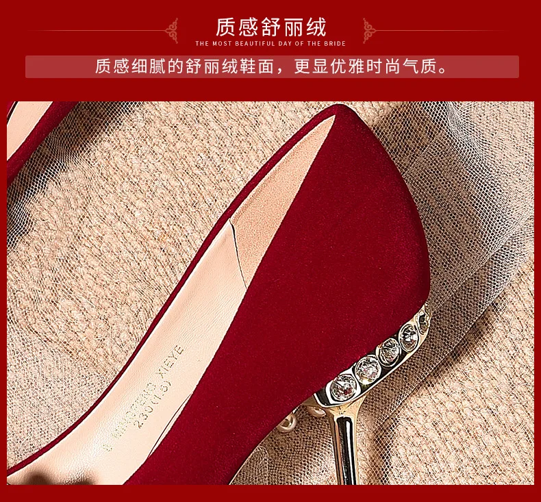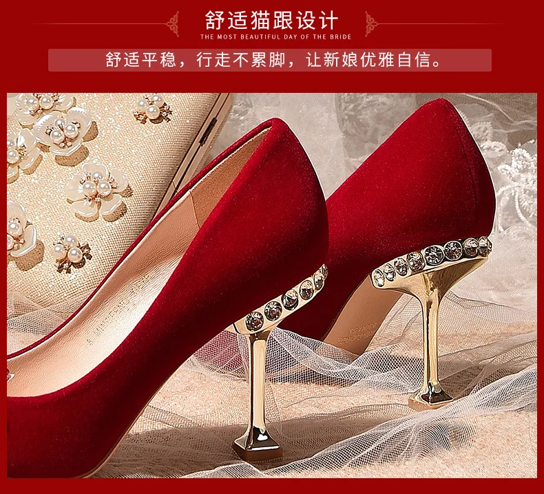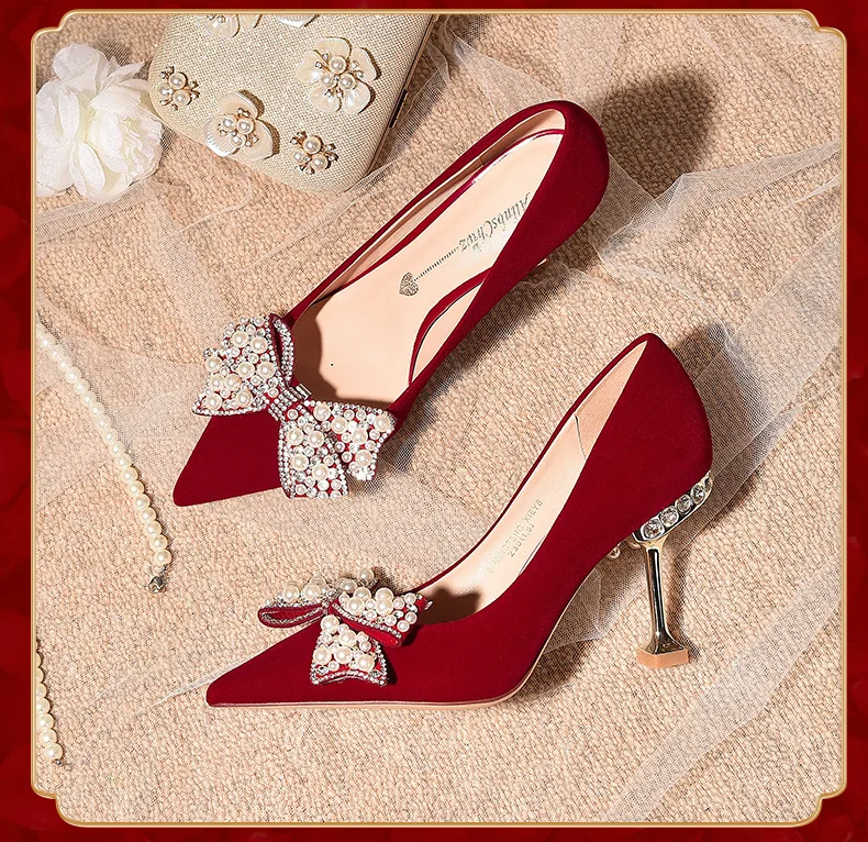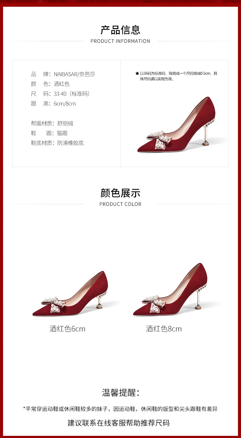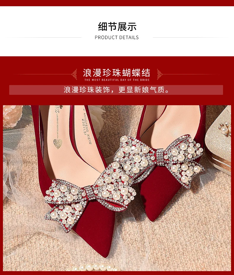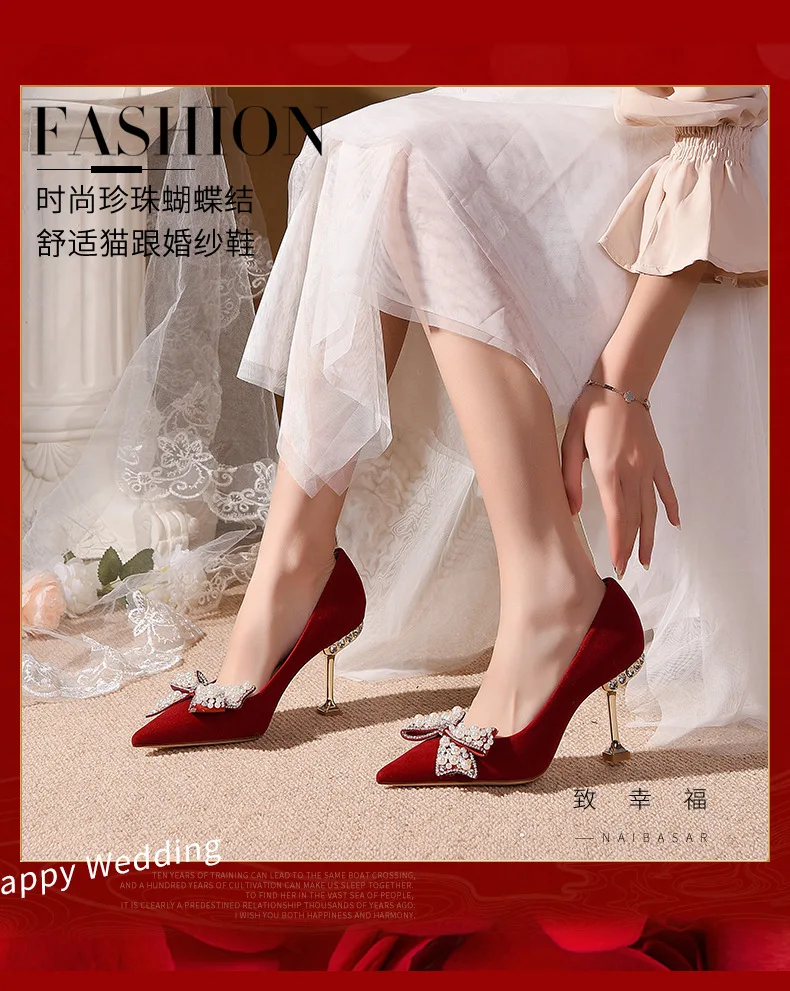 Chic Beads bow-knot wedding shoes woman pumps pointed toe flock talons hauts crystal metal stiletto high heels shoes women 2022