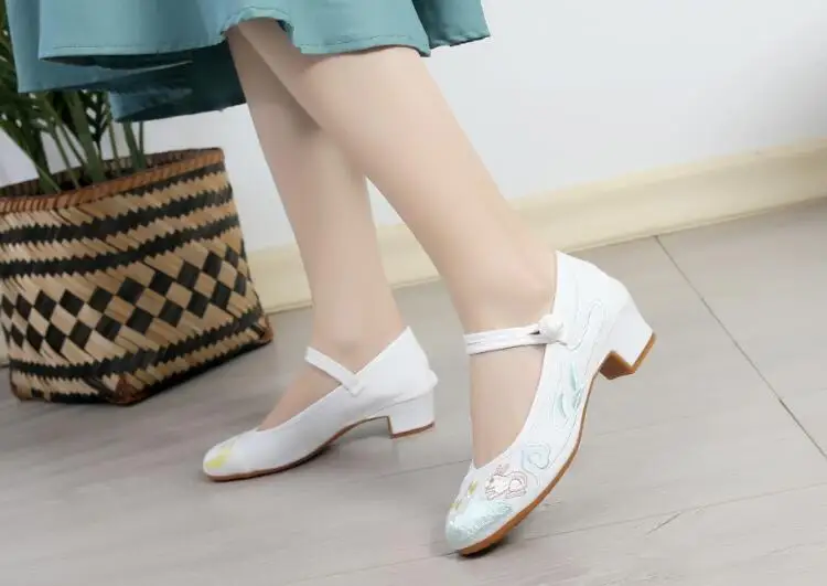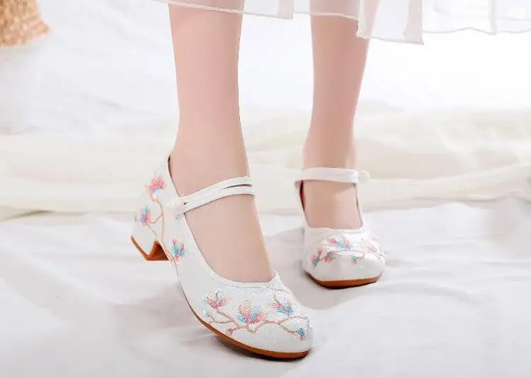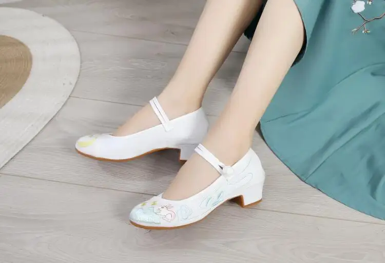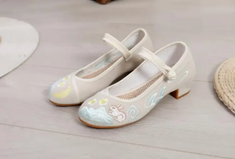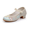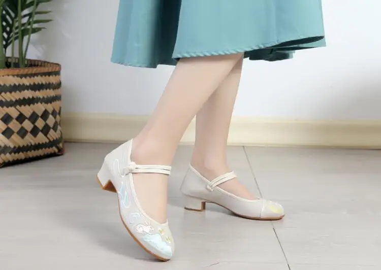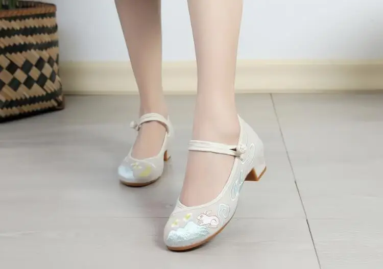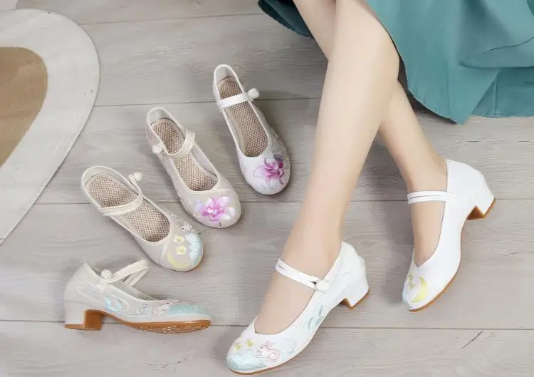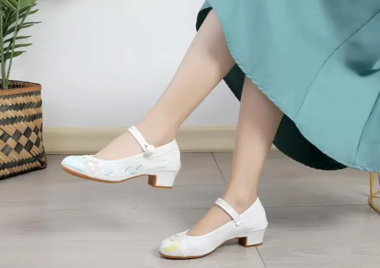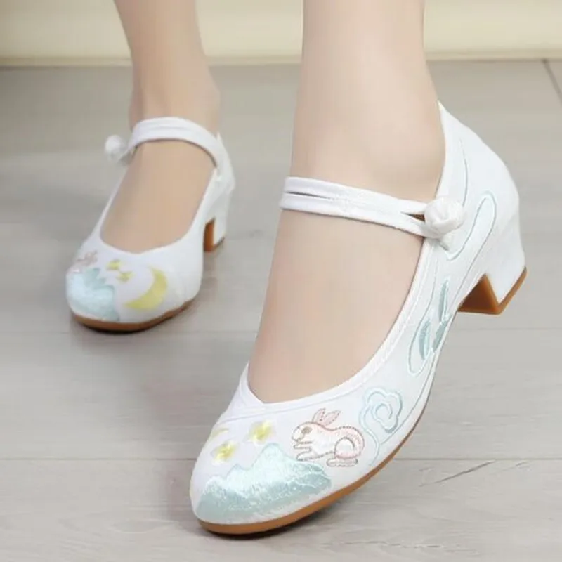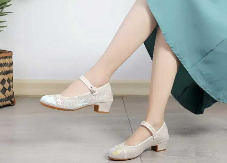 Chinese Style Embroider Women Pumps Button Strap Vintage Dress Shoes for Ladies Full Toe Chunky Heel Sandals for Mid-Autumn Day