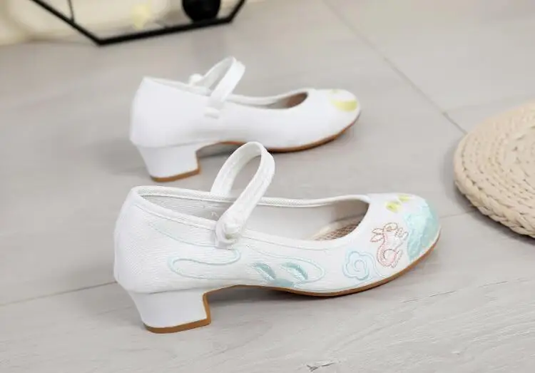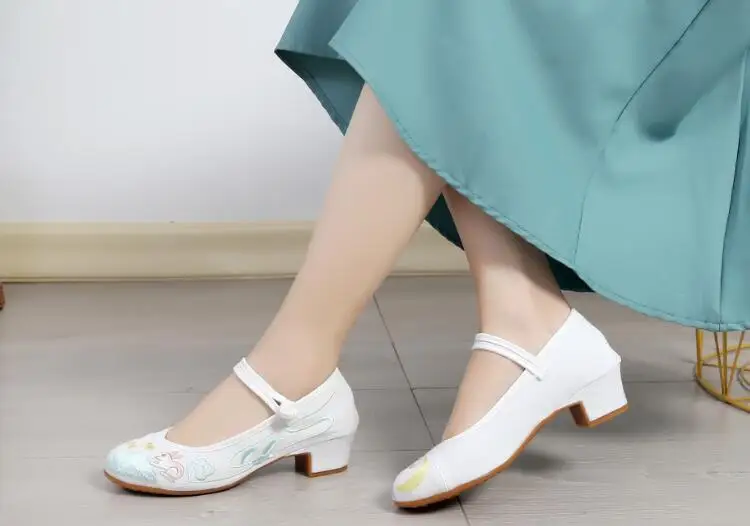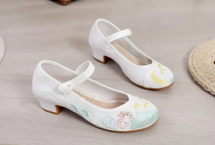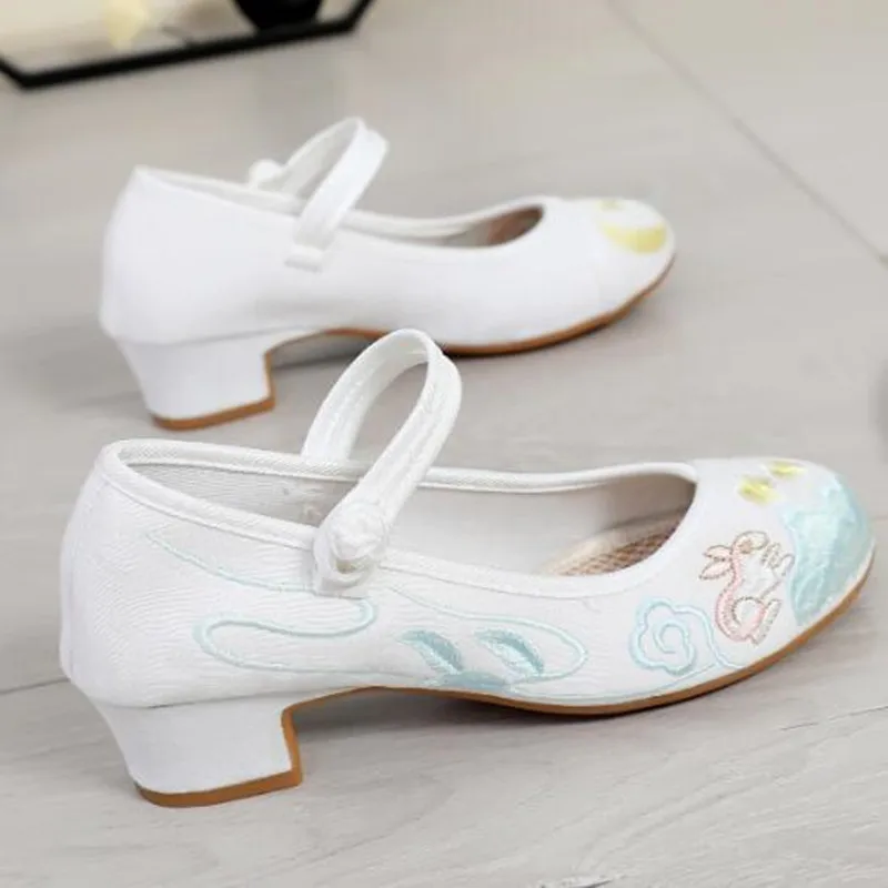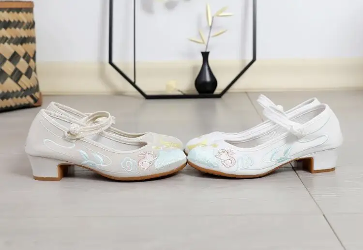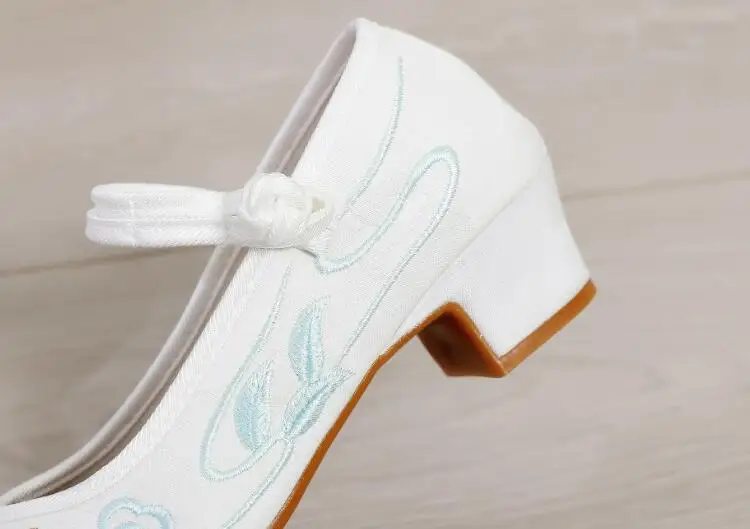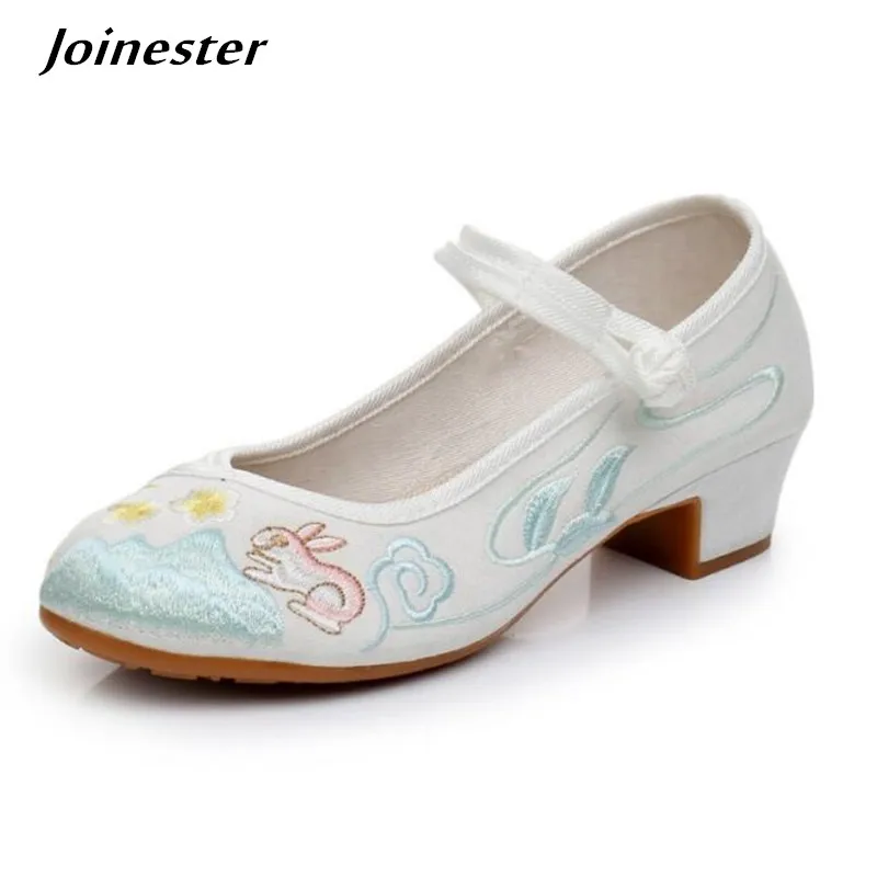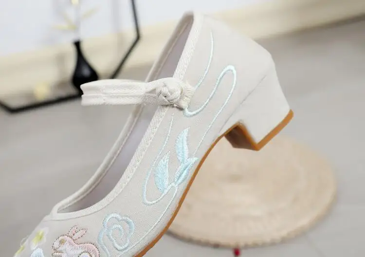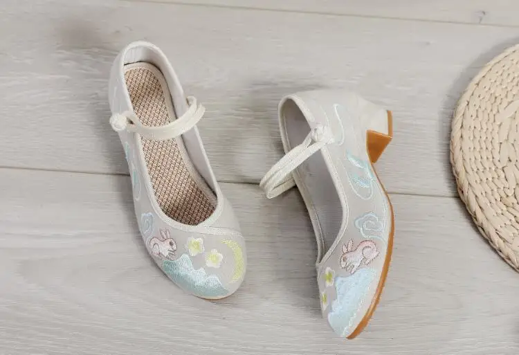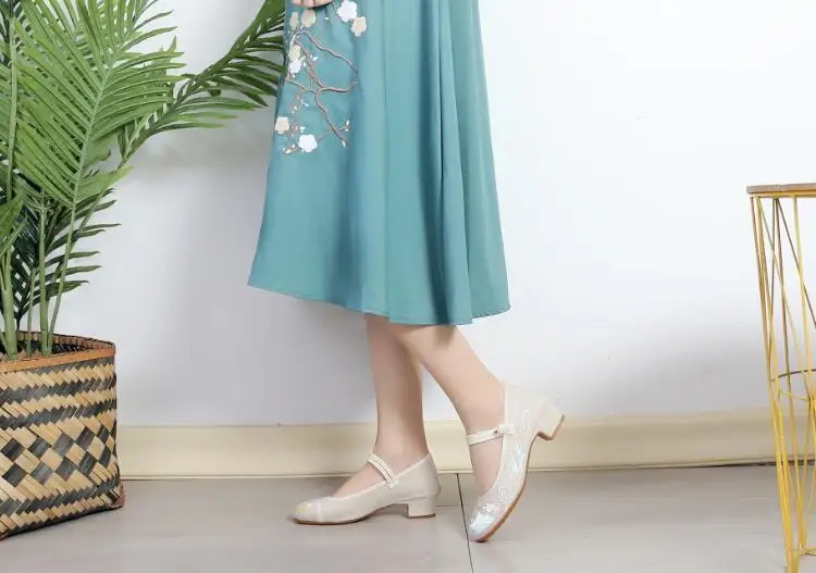 Chinese Style Embroider Women Pumps Button Strap Vintage Dress Shoes for Ladies Full Toe Chunky Heel Sandals for Mid-Autumn Day