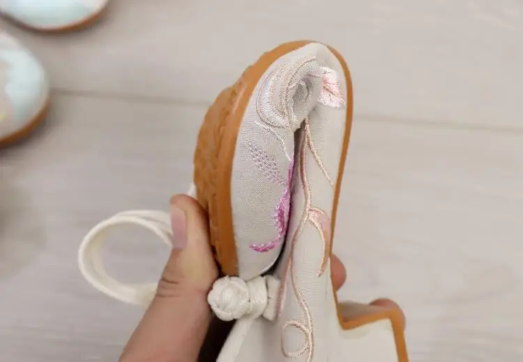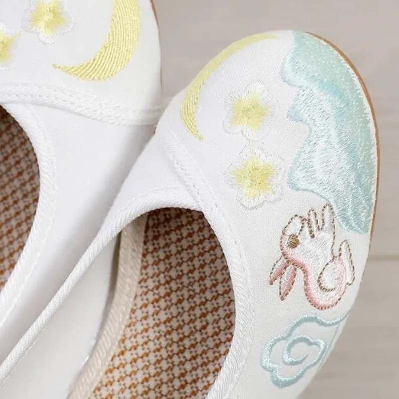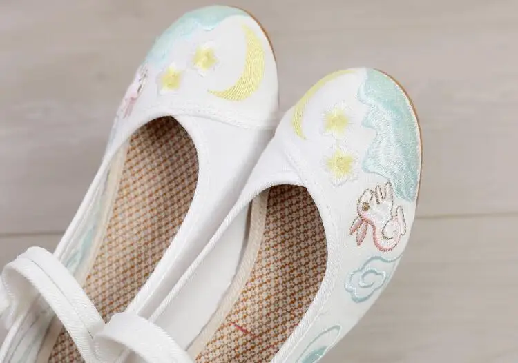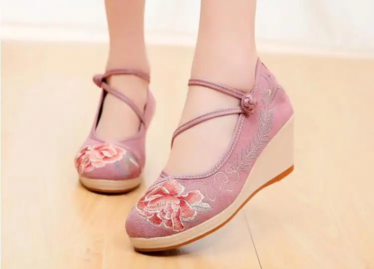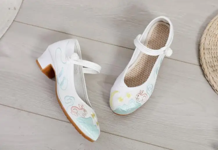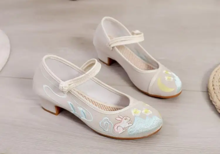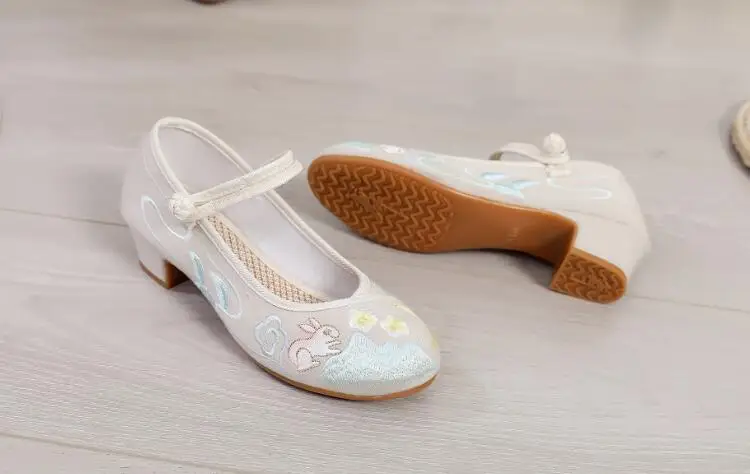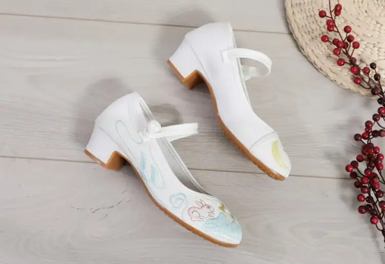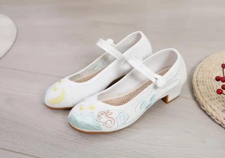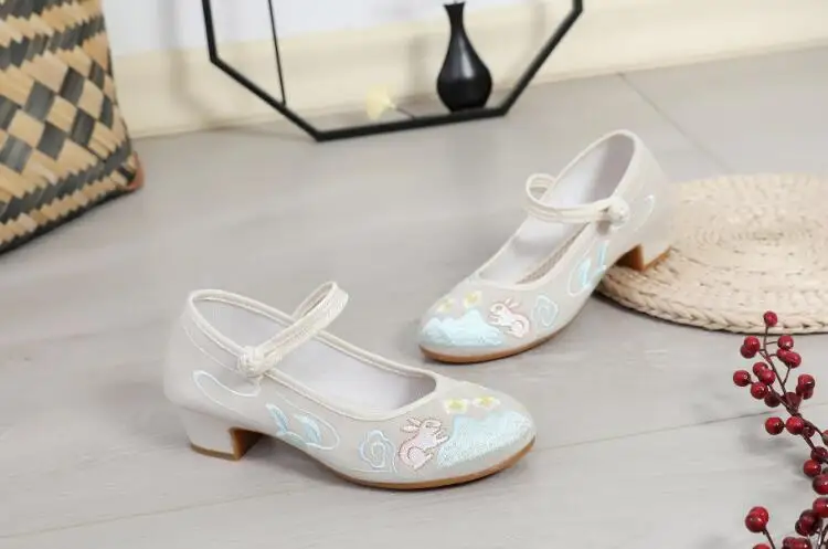 Chinese Style Embroider Women Pumps Button Strap Vintage Dress Shoes for Ladies Full Toe Chunky Heel Sandals for Mid-Autumn Day