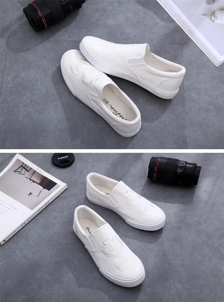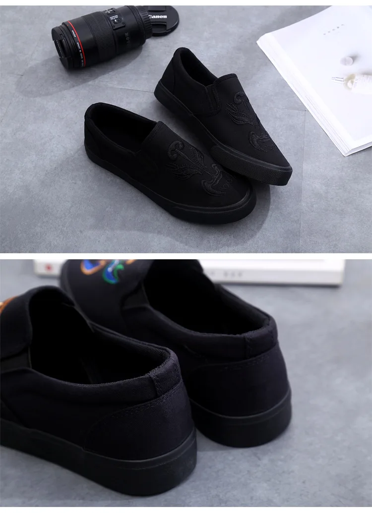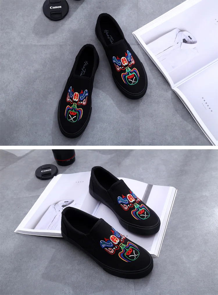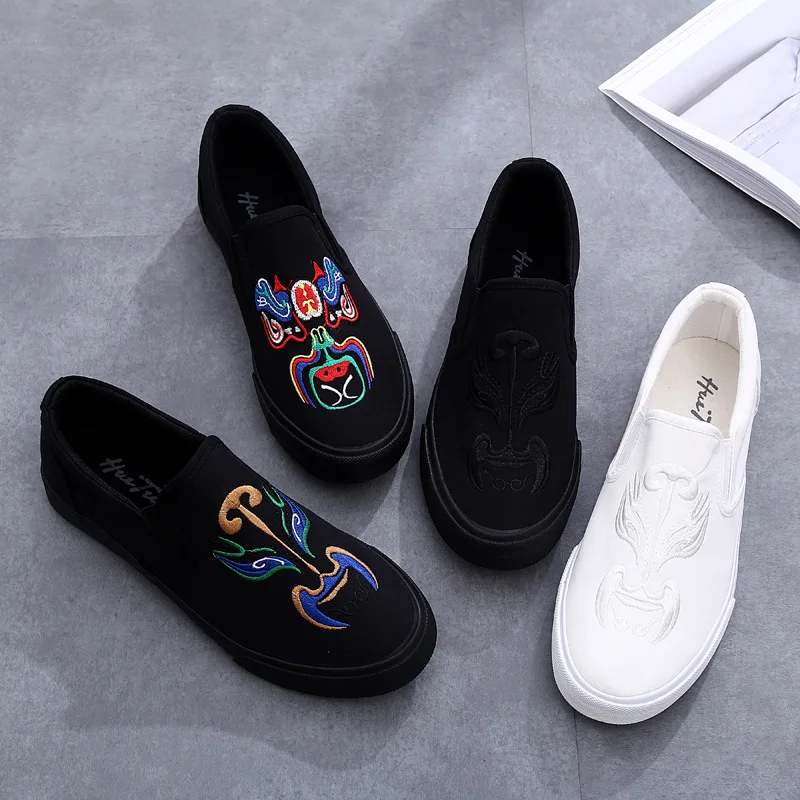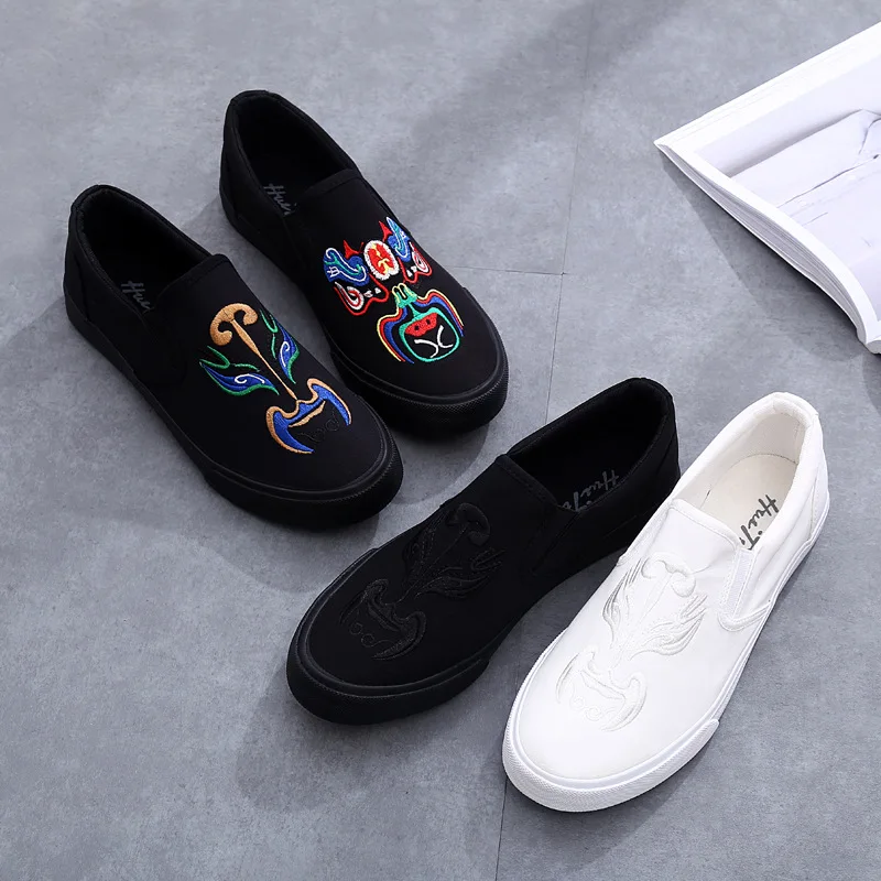 Chinese Style White Sneakers Men Embroidery Casual Shoes Slip on Canvas Shoes Men Loafers Comfortable Vulcanized Shoes