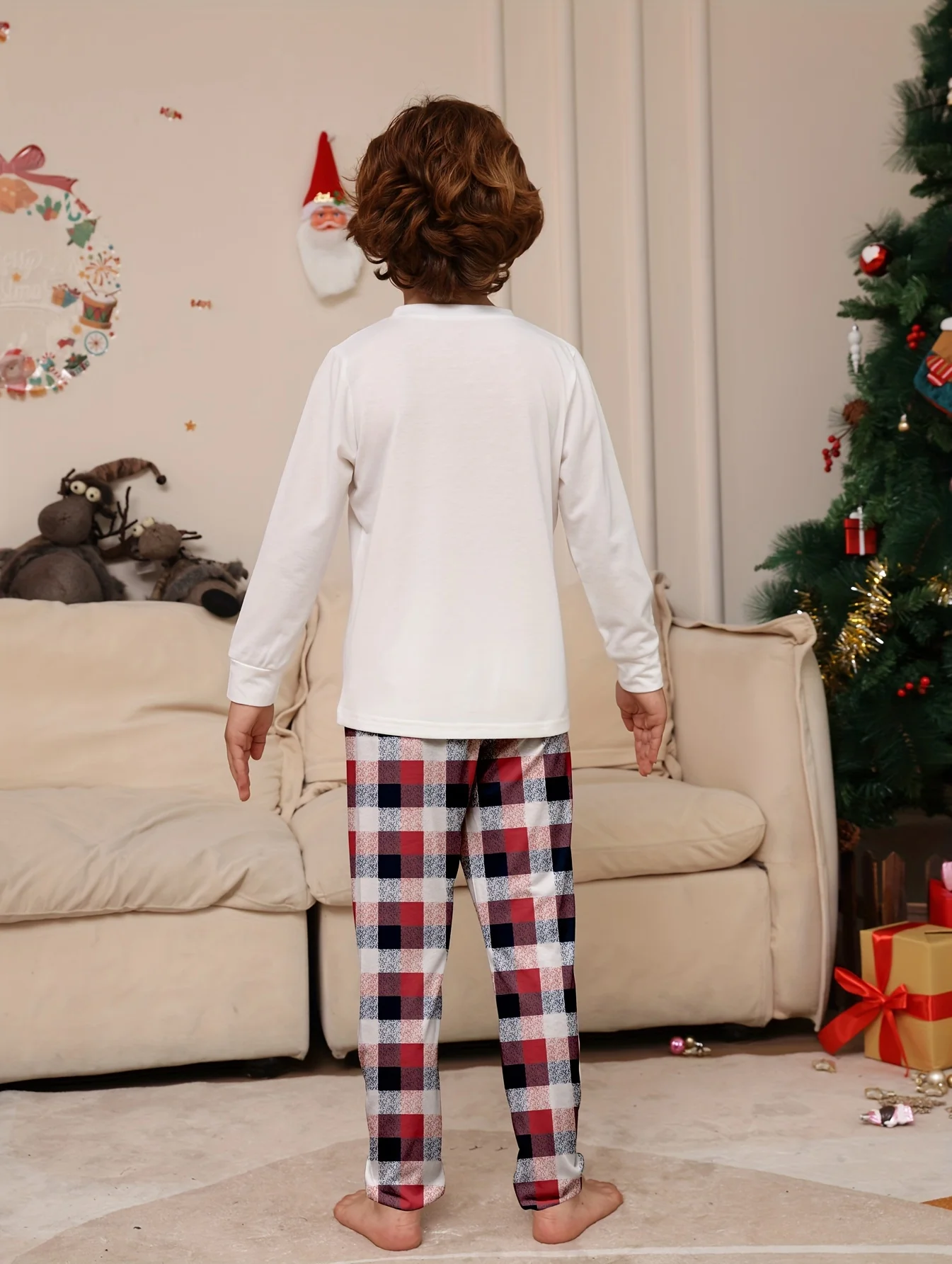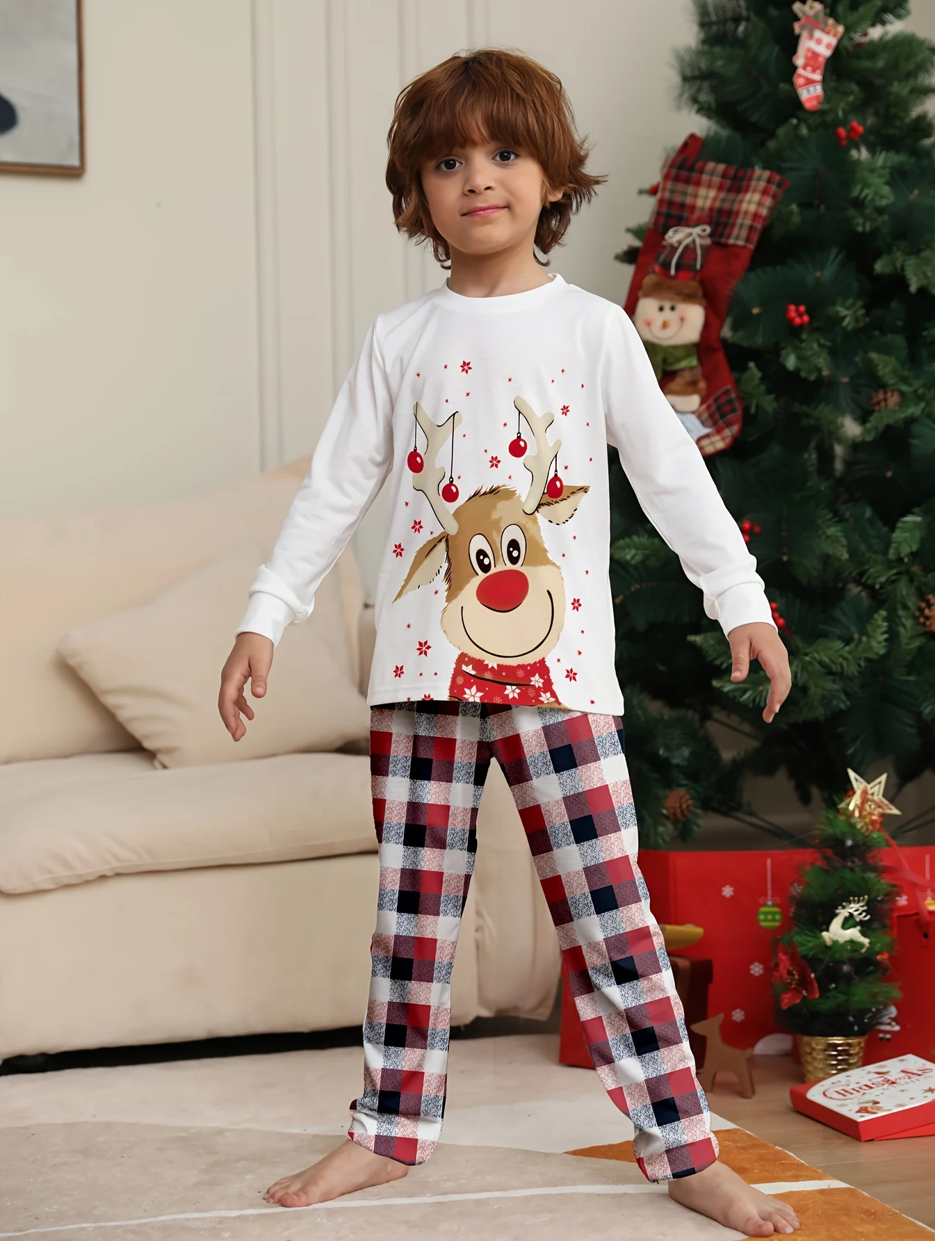 Christmas Toddler Boys 2-piece Pajama Sets Cartoon Elk Print Casual Round Neck Long Sleeve Top & Plaid Trousers For All Seasons