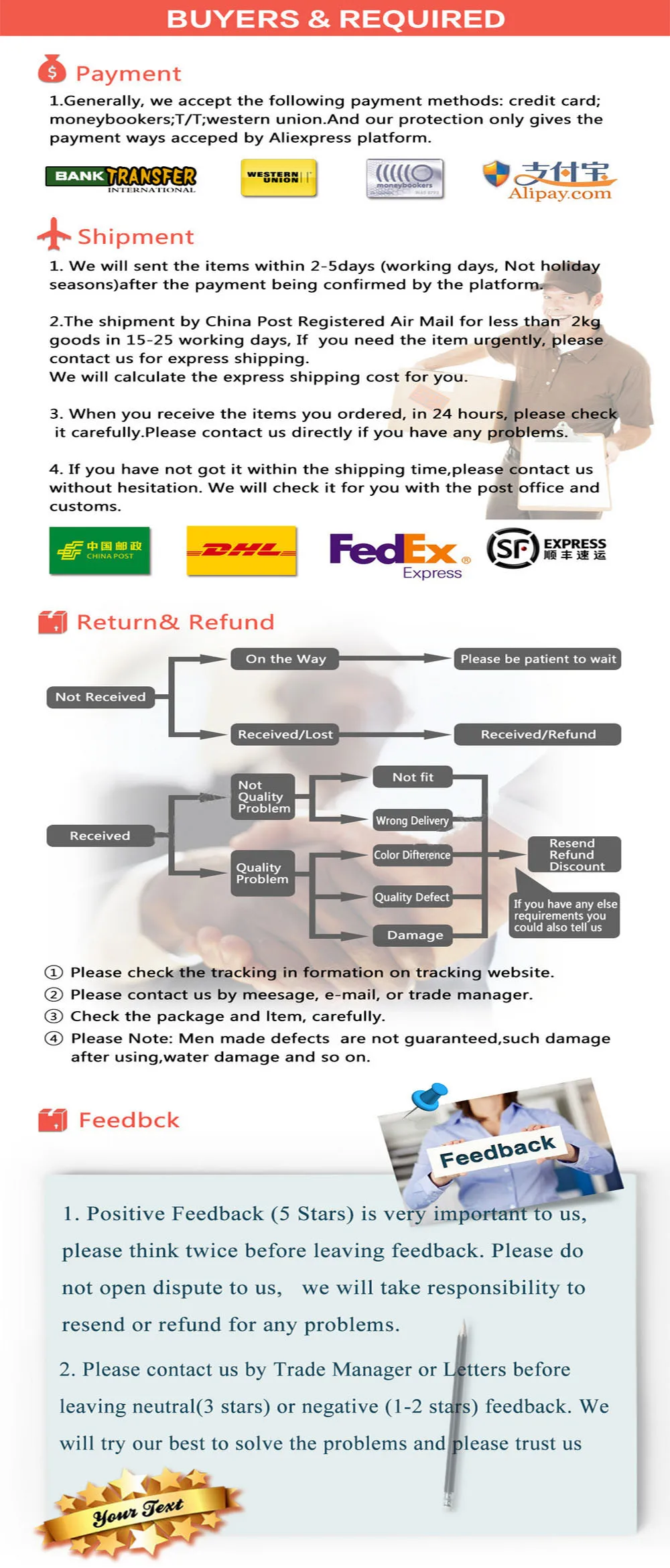 • If you did not receive the product within the guaranteed time( 45 days not including 2-5 day processing) you can request a refund or a reshipment.