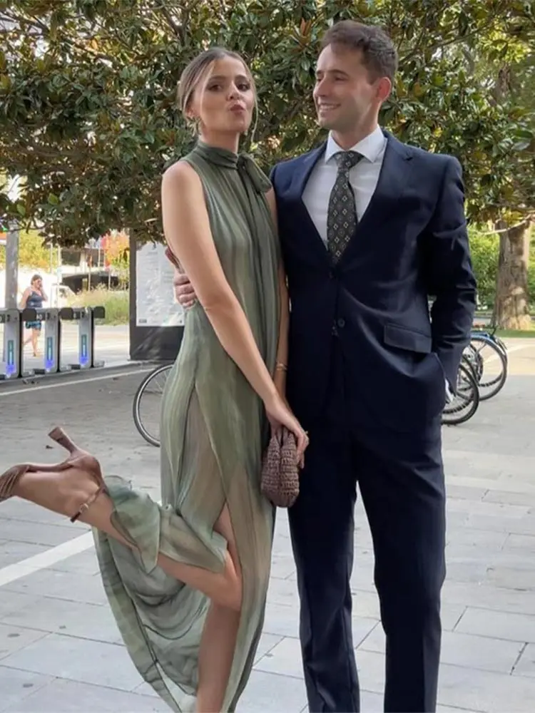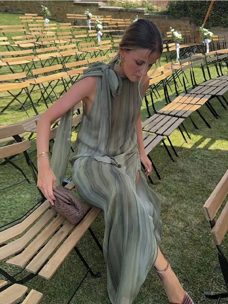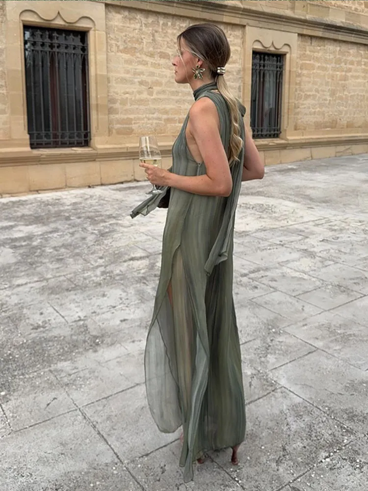 Contrast Color Hanging Neck Maxi Dress Women Chic Off Shoulder Sleeveless Split Loose Long Robes Lady Casual Party Dresses