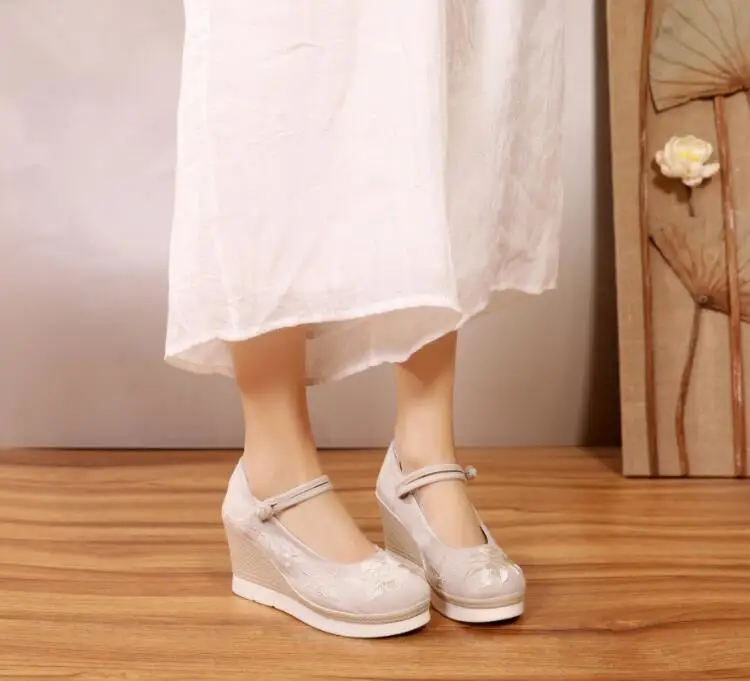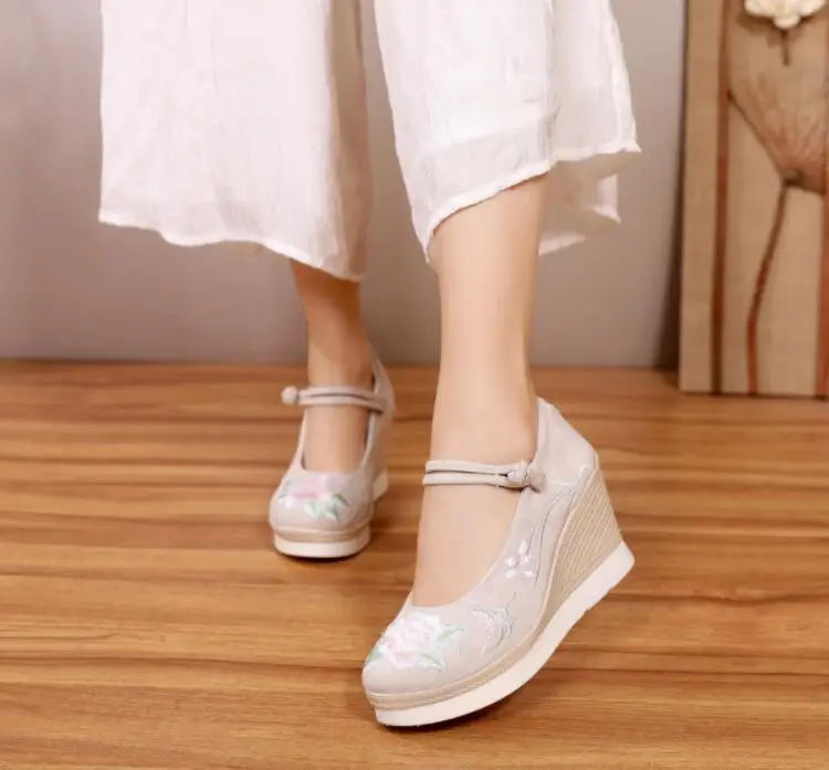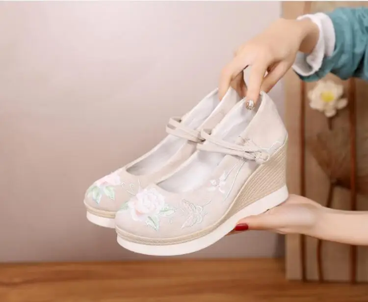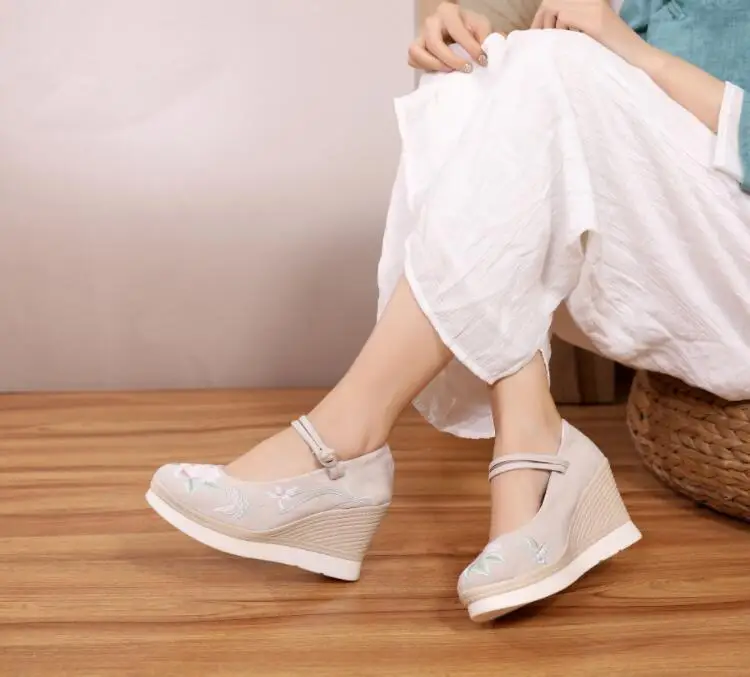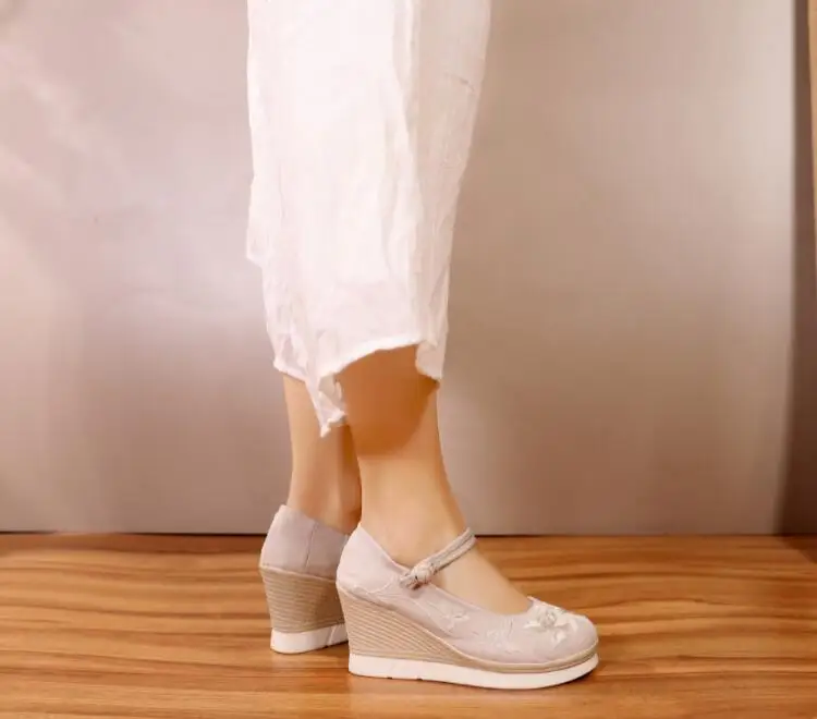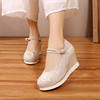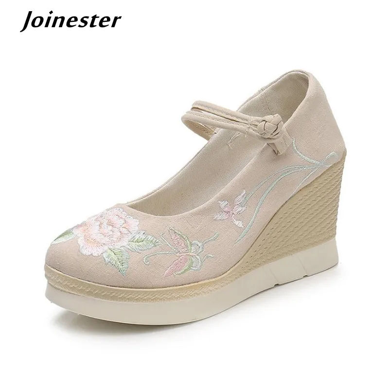 Cotton Fabric Women Wedge Pumps босоножки женские 2021 Ladies Sandals Vintage Embroidered Platform Shoes Mary Jane High Heels