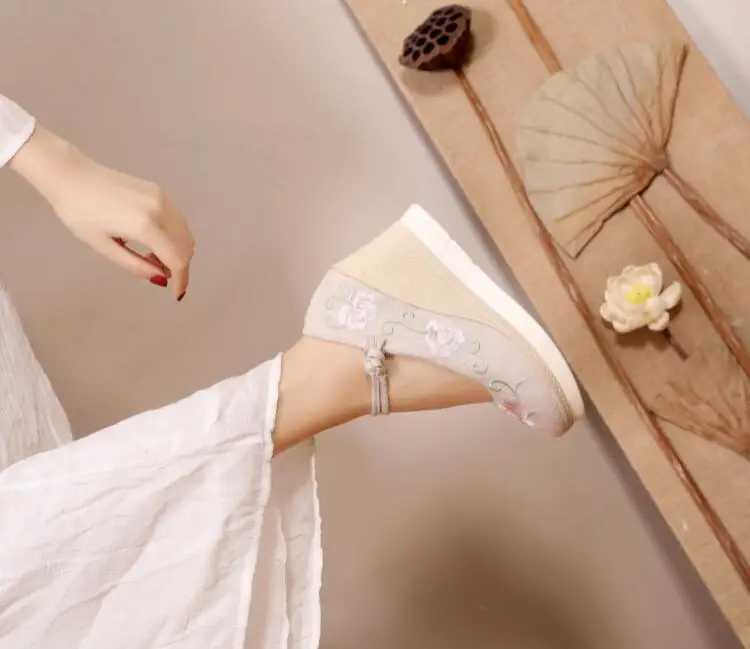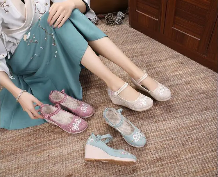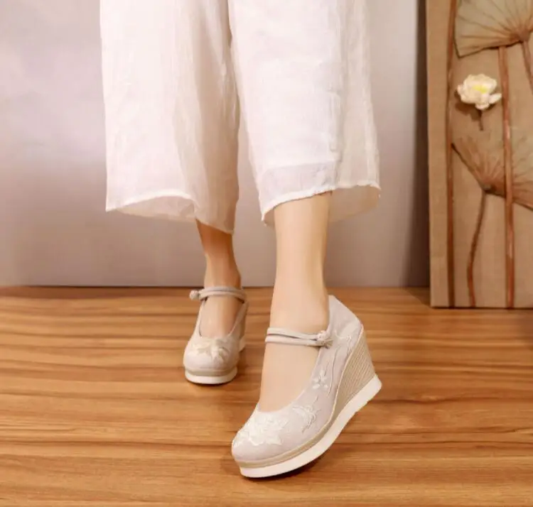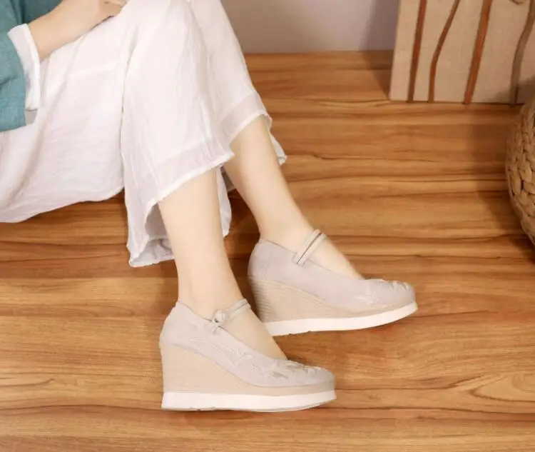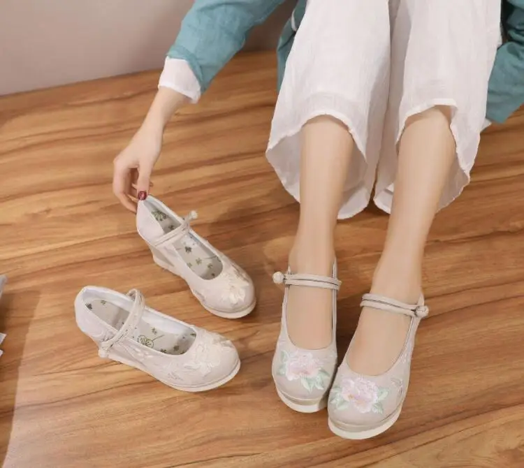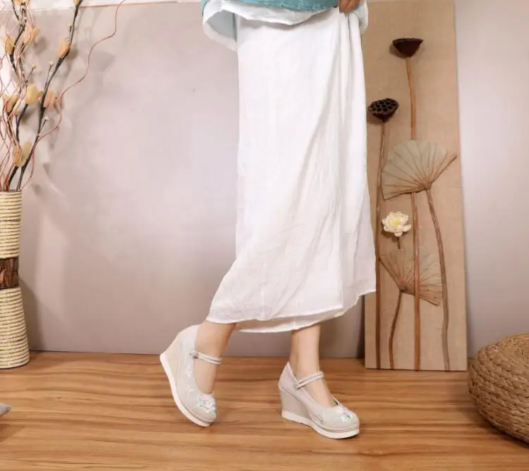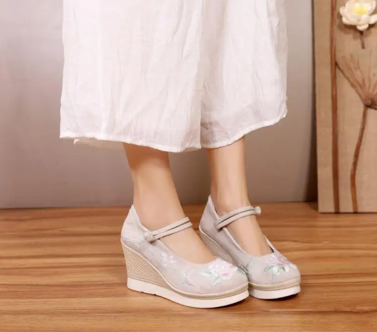 Cotton Fabric Women Wedge Pumps босоножки женские 2021 Ladies Sandals Vintage Embroidered Platform Shoes Mary Jane High Heels