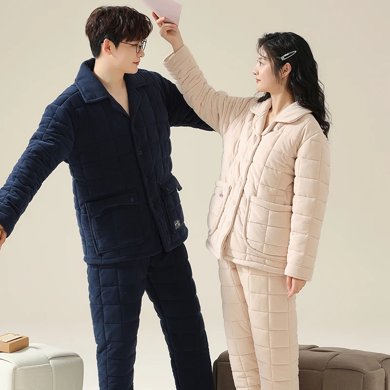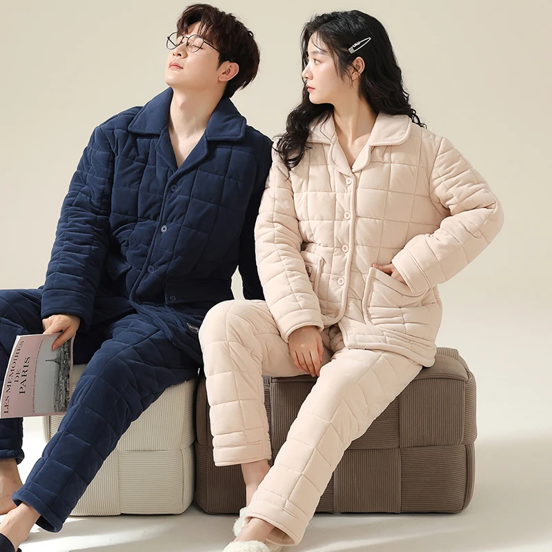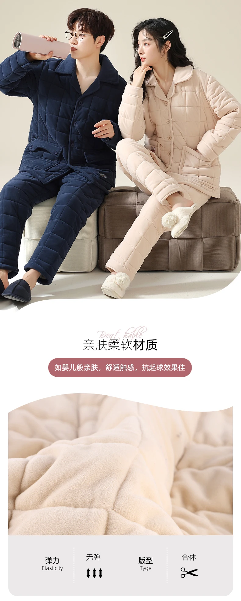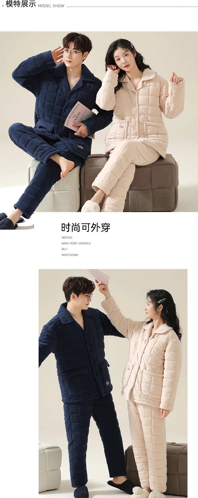 Couple Pajamas Set Men Women Turn-down Collar Pyjamas Male Female 3 Layer Clip Cotton Home Suit