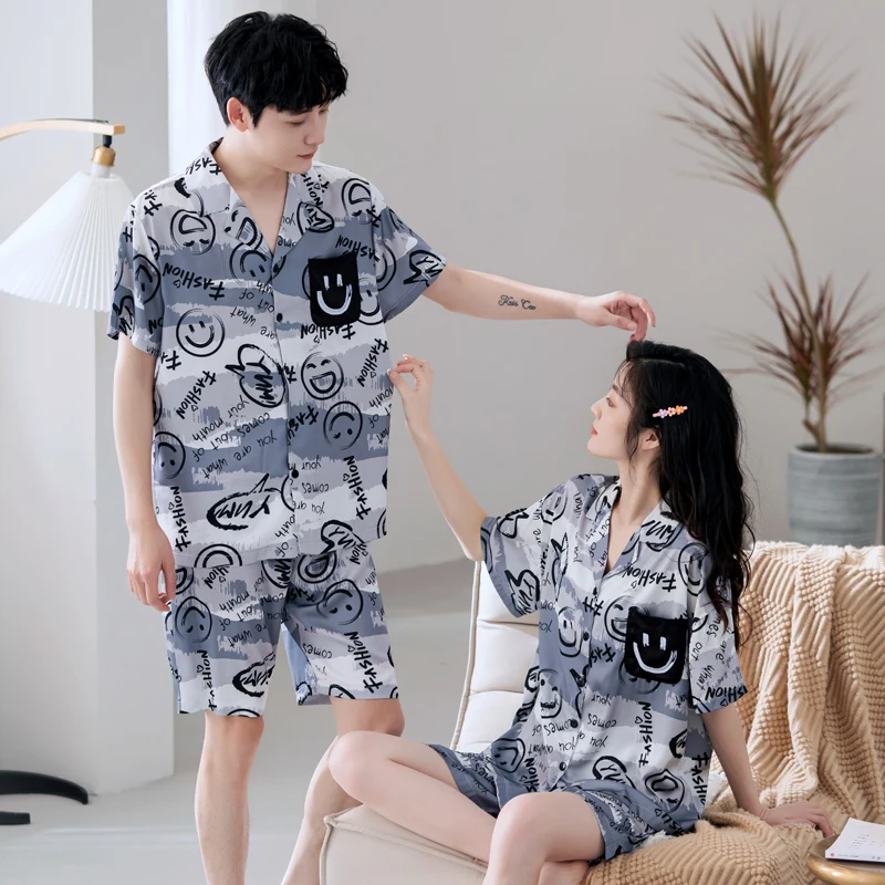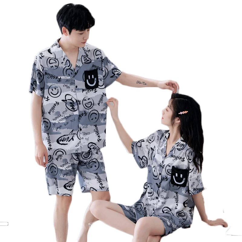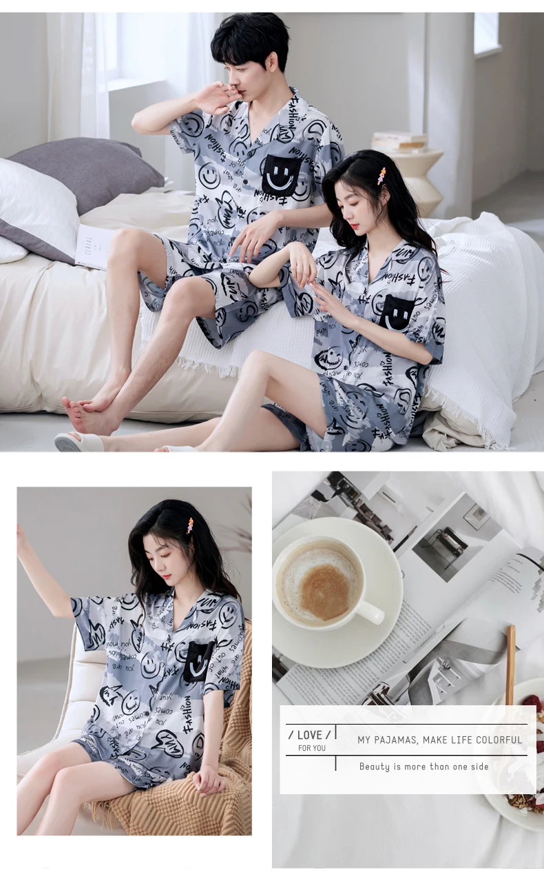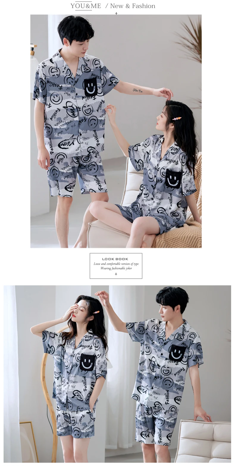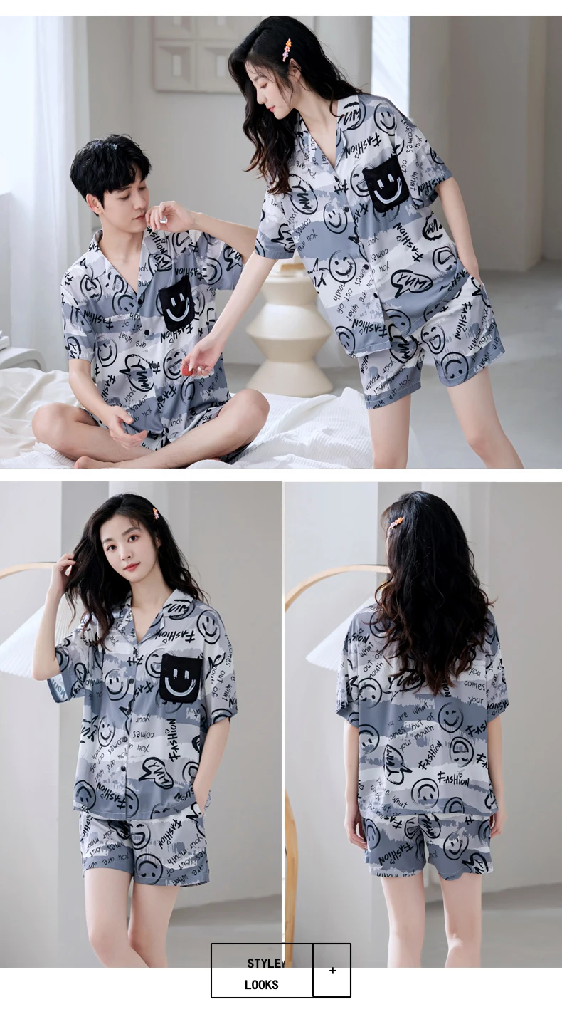 Couple Pajamas Set Summer Short Sleeve Sleepwear Men and Women Silk Pijamas Suit