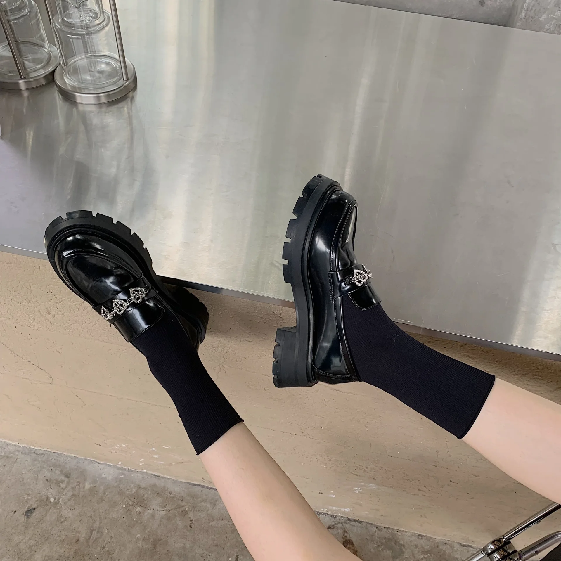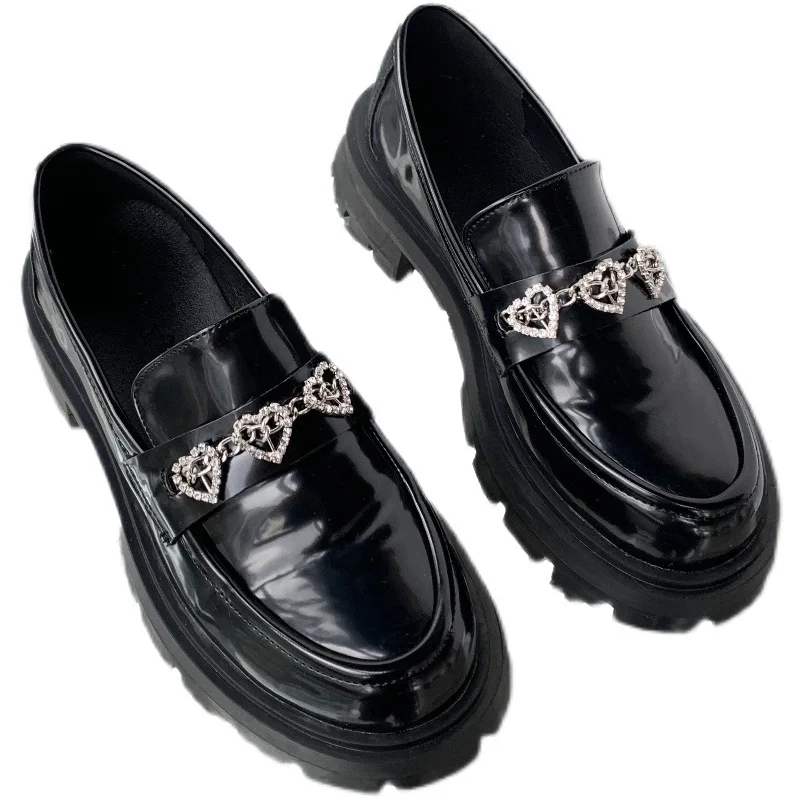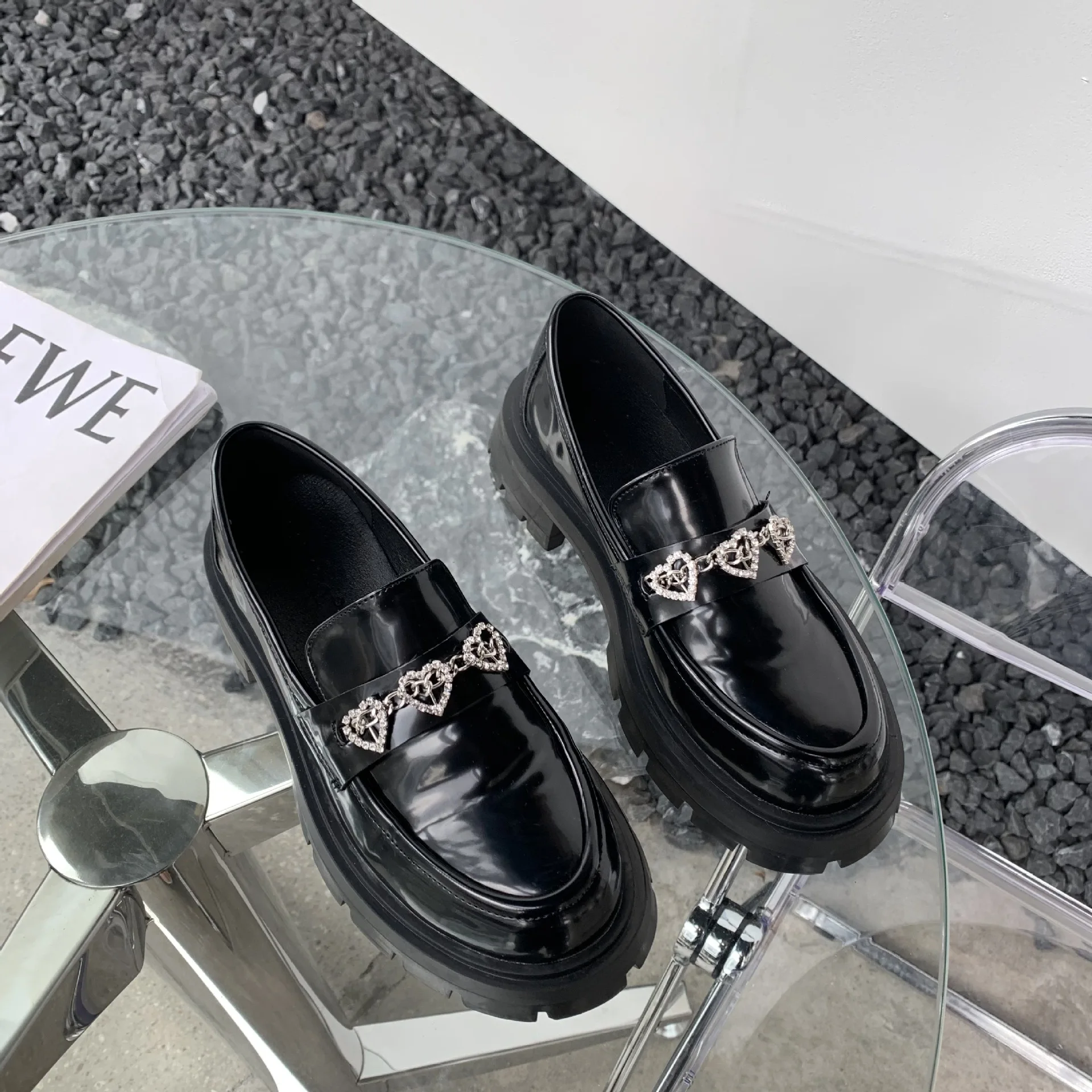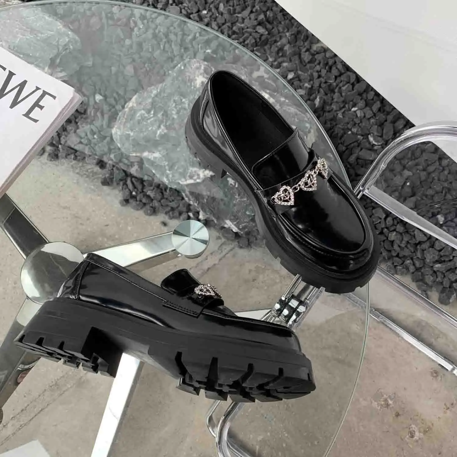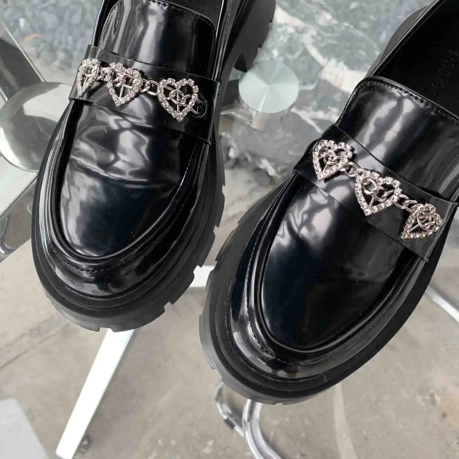 Creepers Heart crystal chain loafers woman patent leather oxford flats platform shoes thick soled small leather shoes women 2021