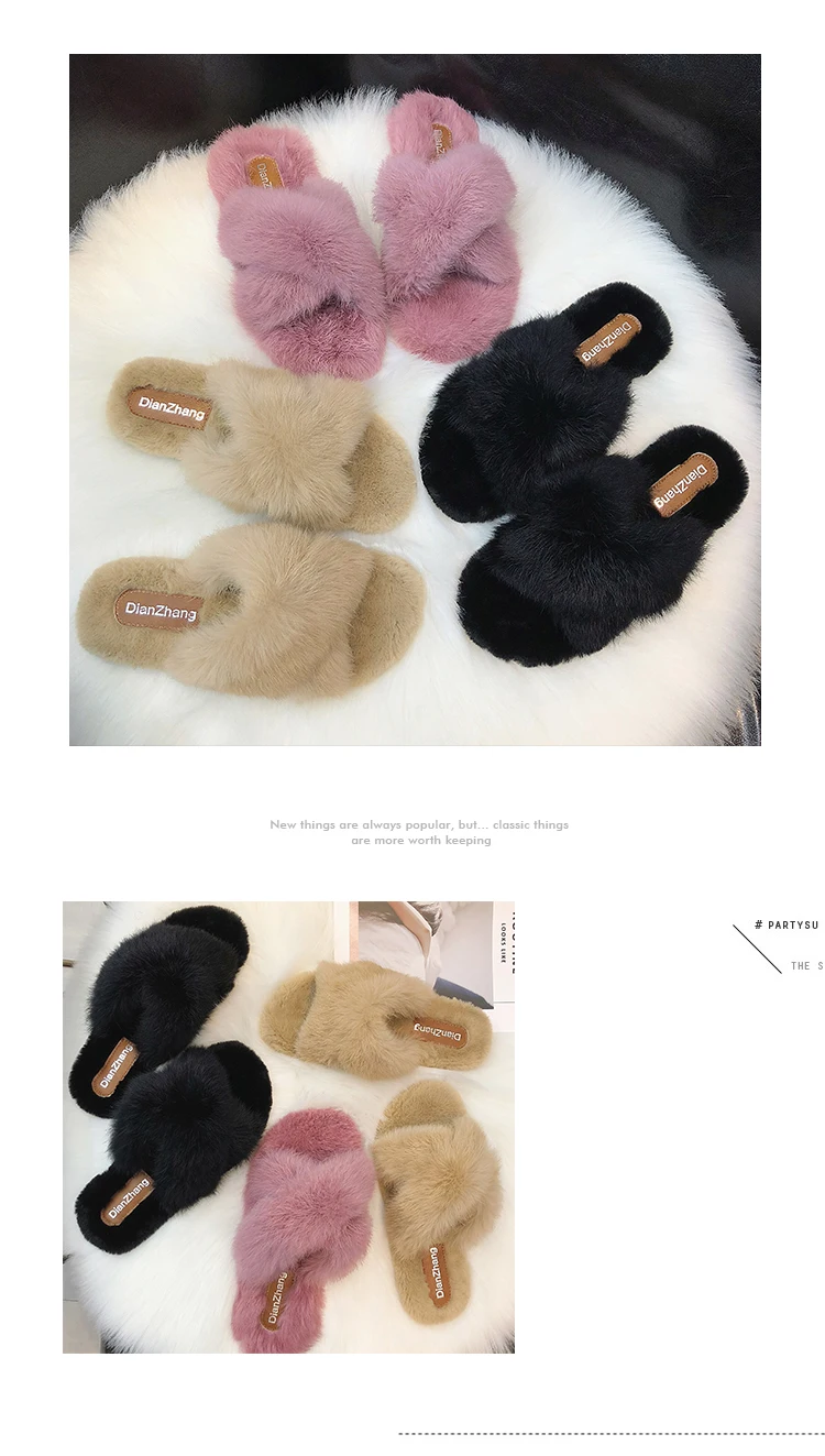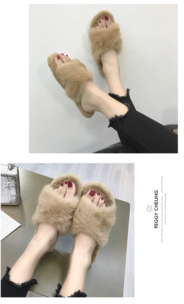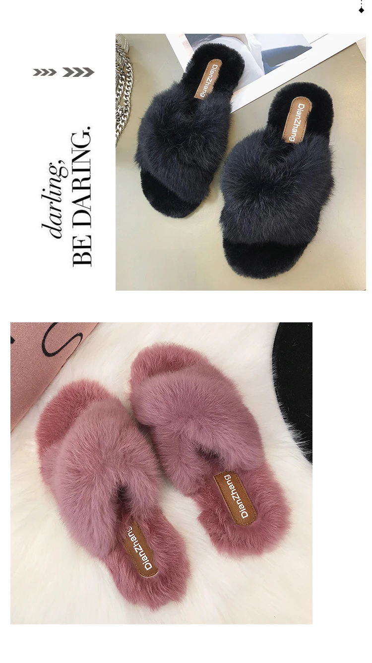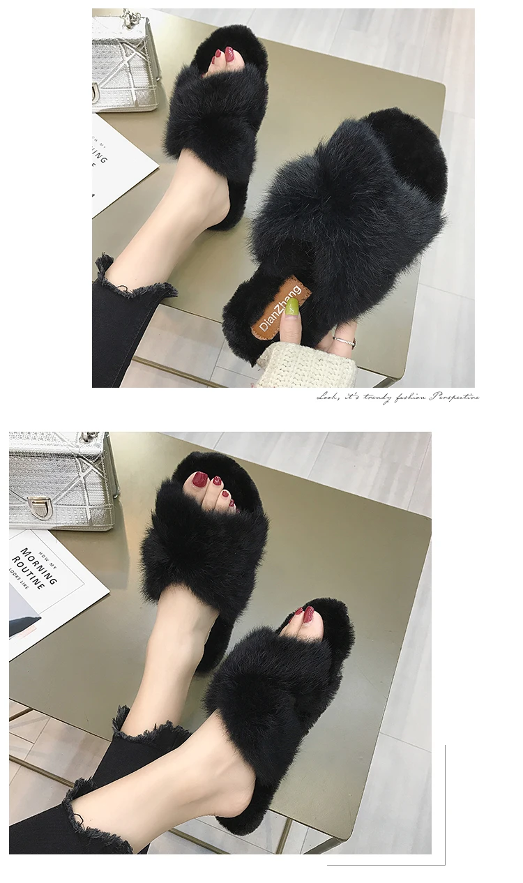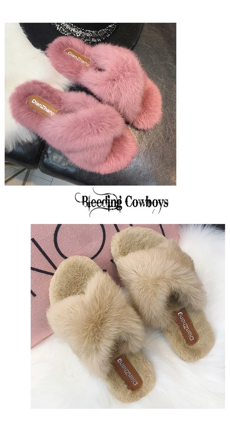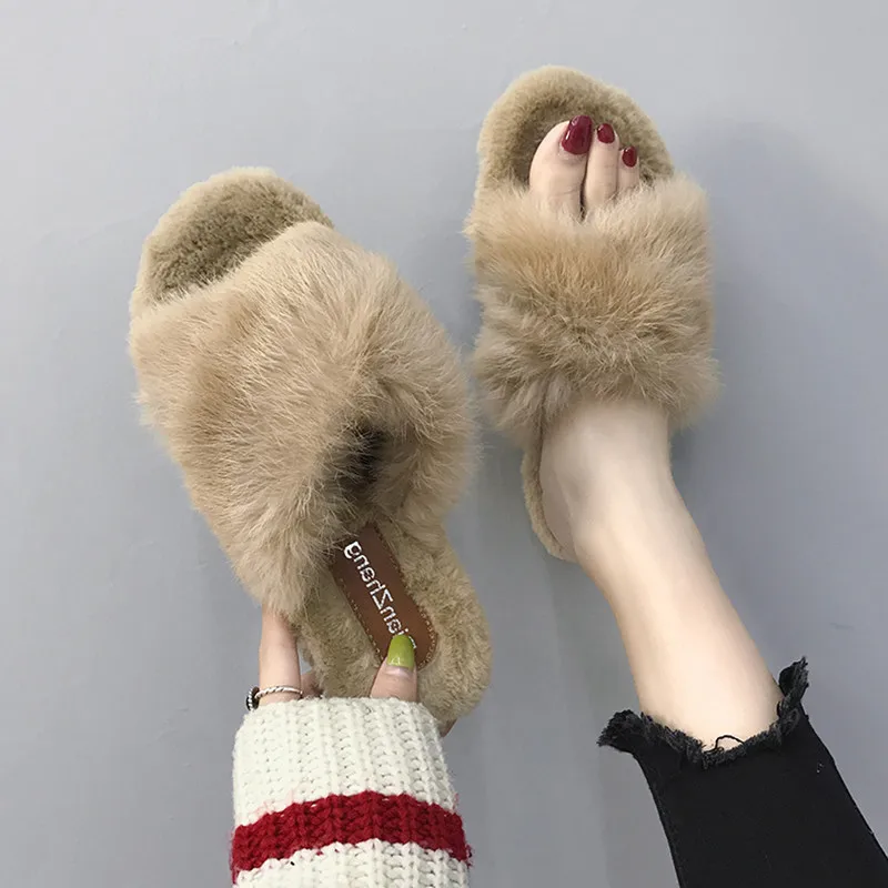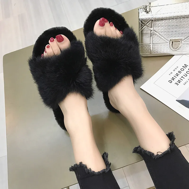 A Luxury Brand Women Fluffy Fur Slides Winter flat Heels Slippers
