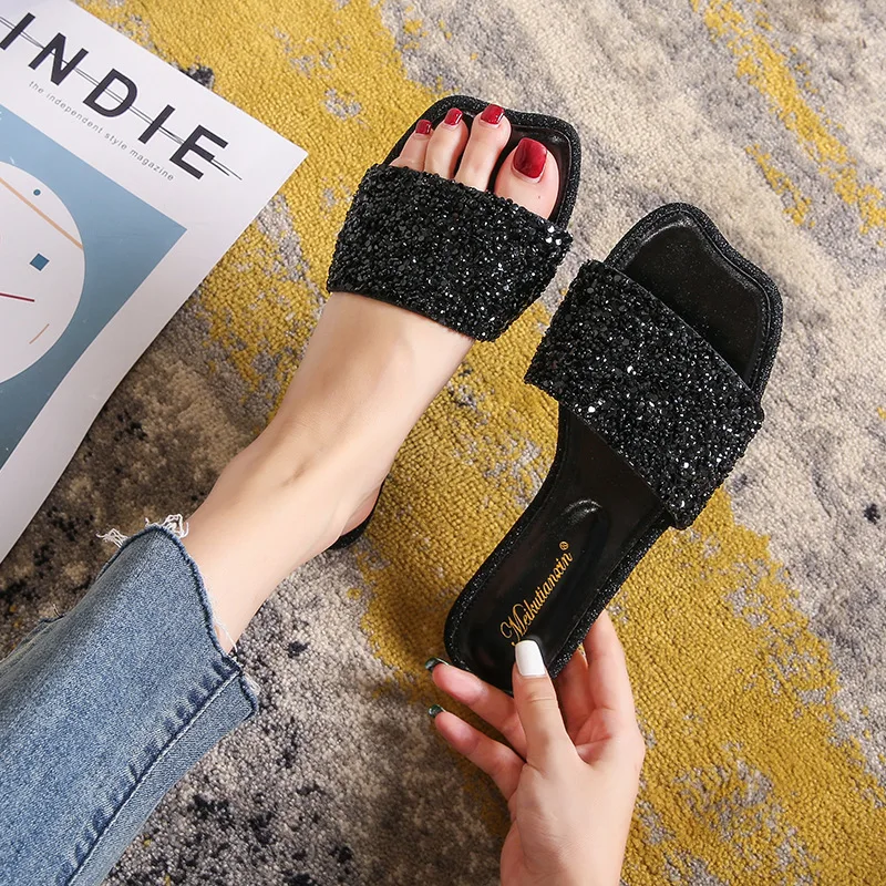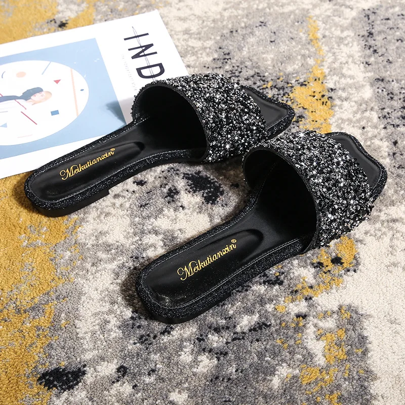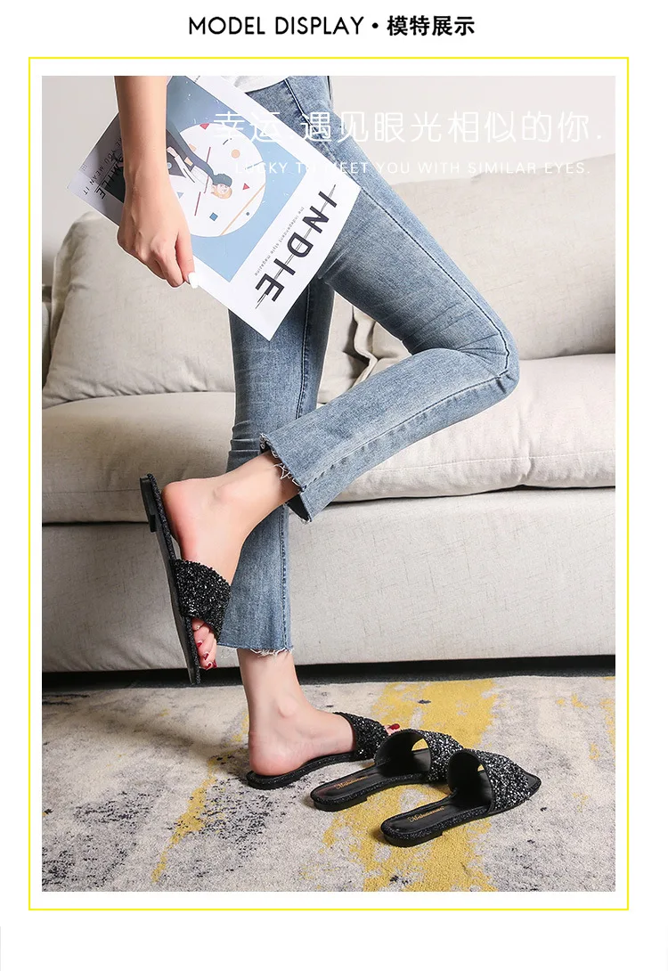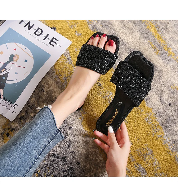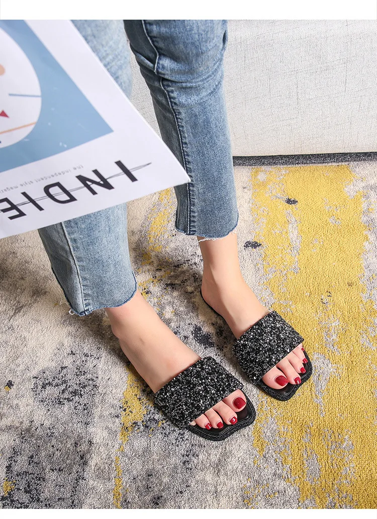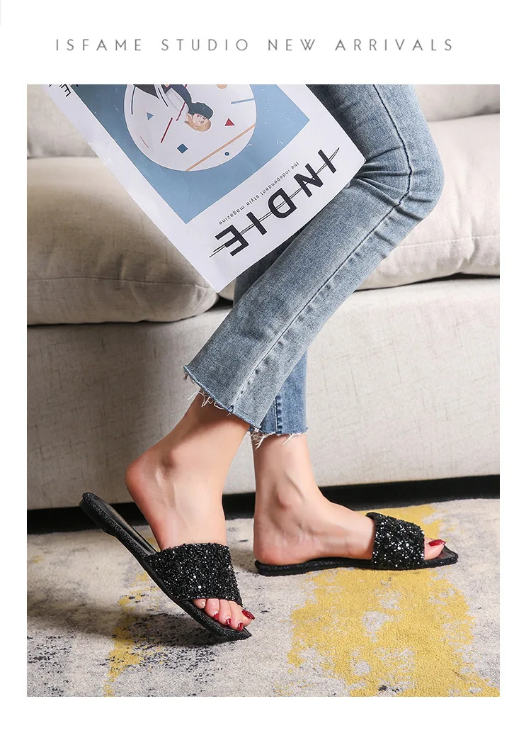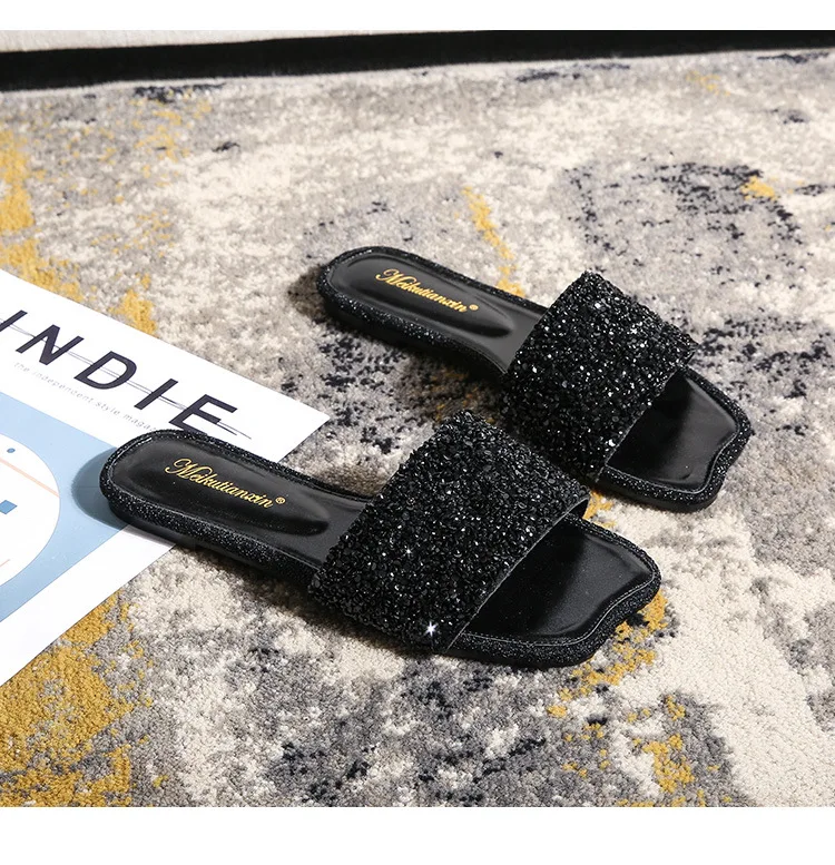 crystal beading flat slippers women strange open toe flip flops bling bling glitter beach sandalias mujer mules big size 43 44