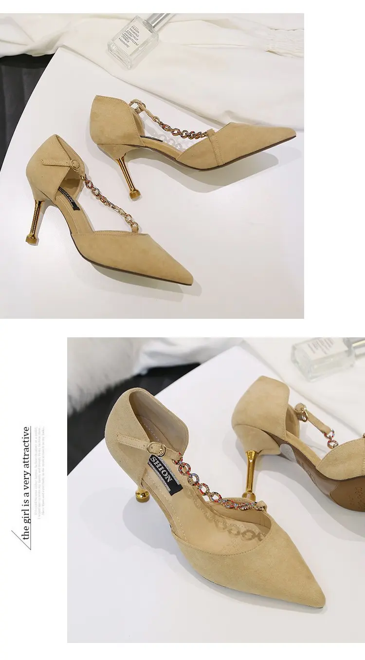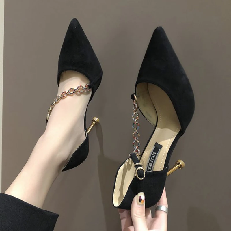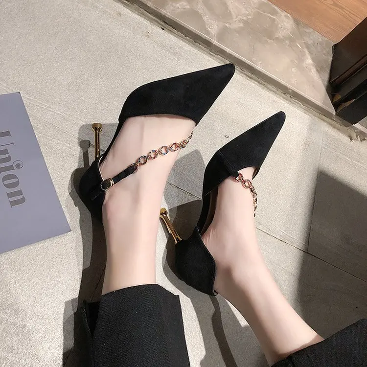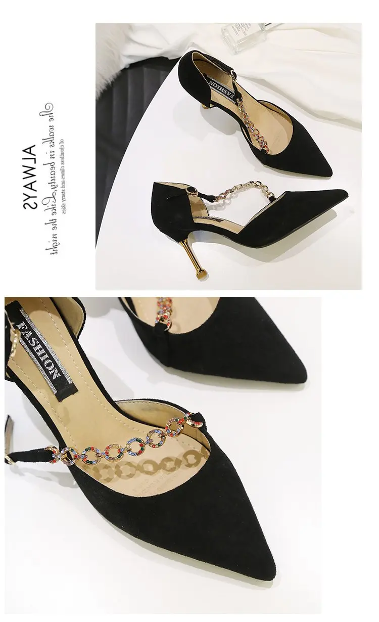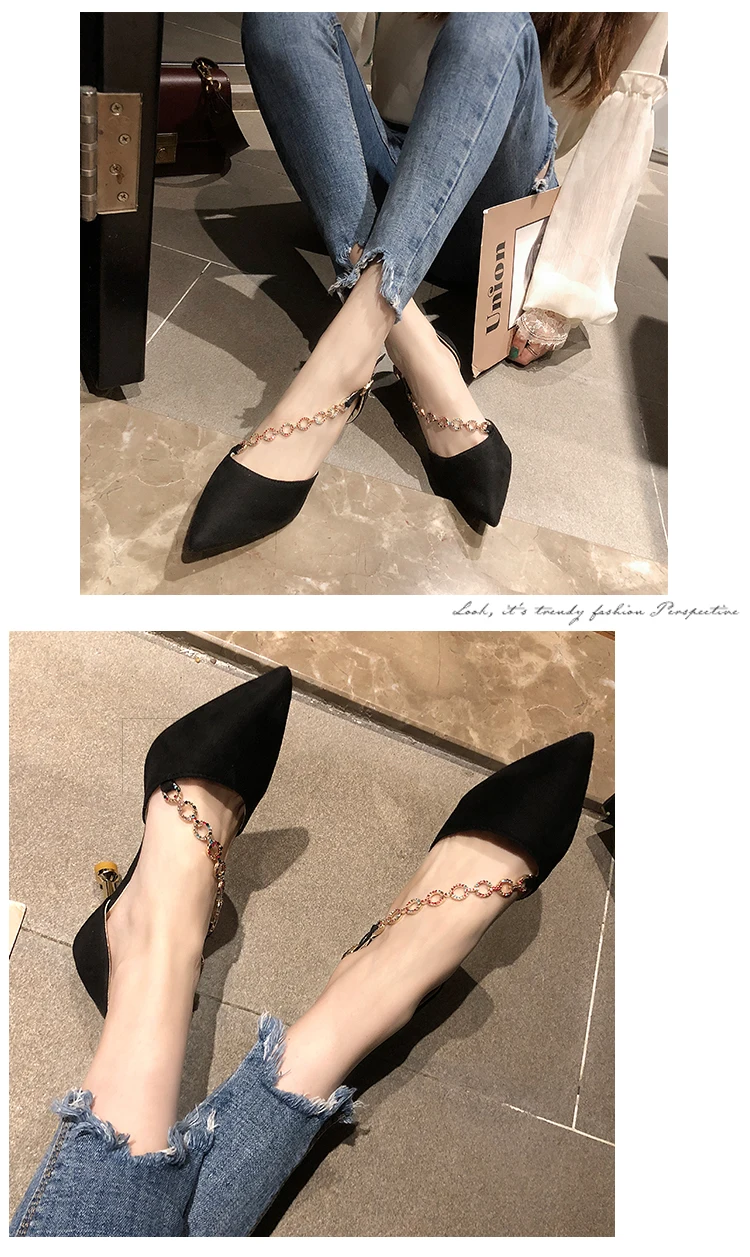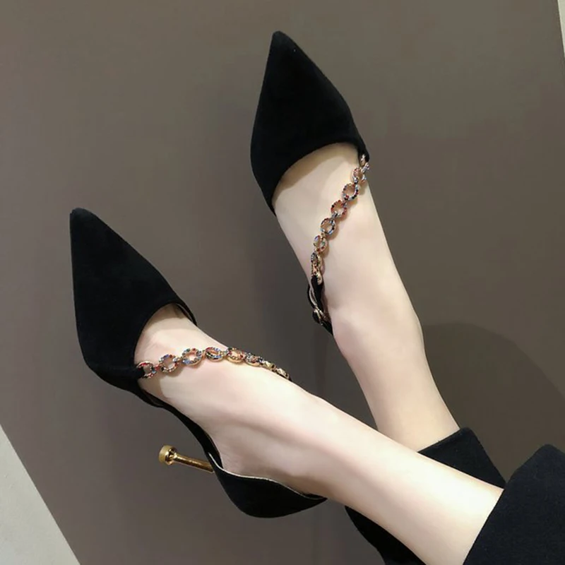 Crystal Chain pumps woman beads band pointy toe tacones mujer party metal heels flock pompes stiletto high heels shoes women2020