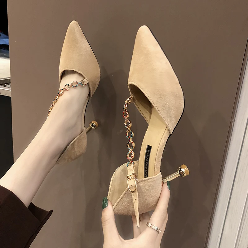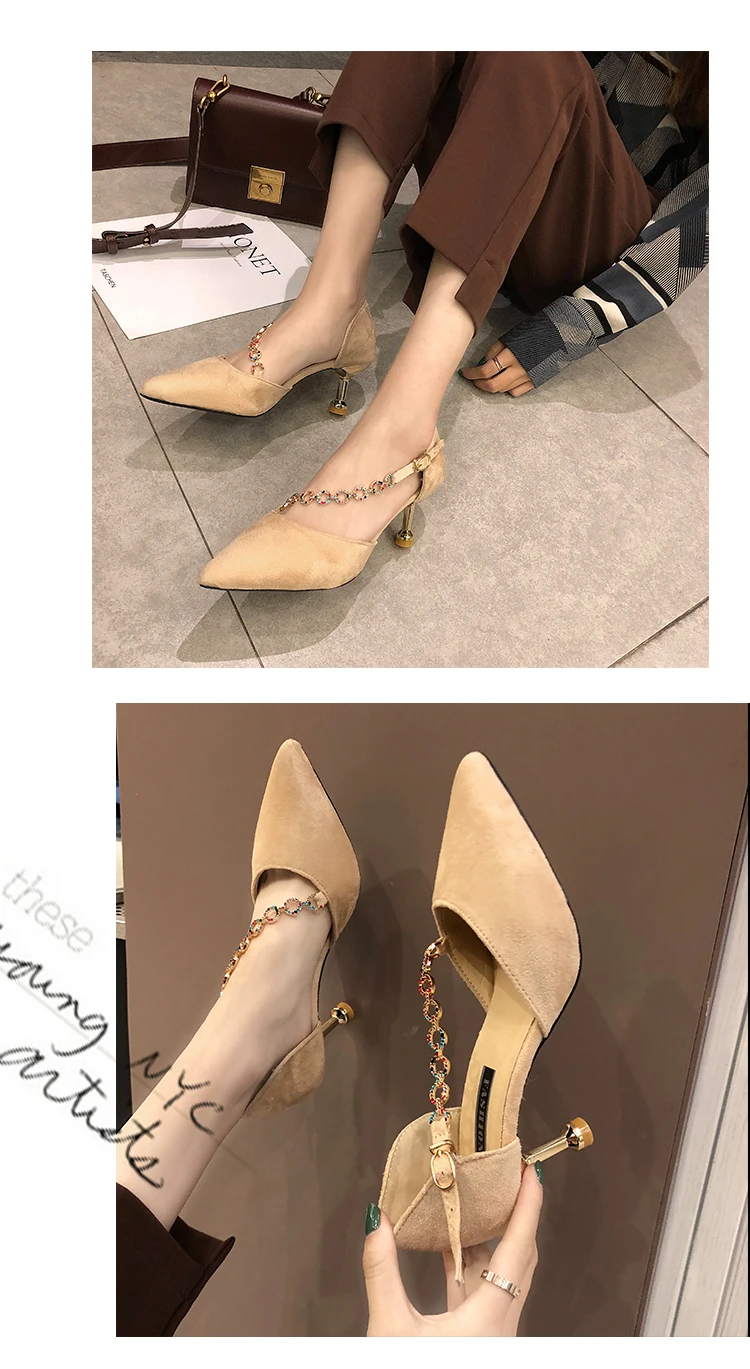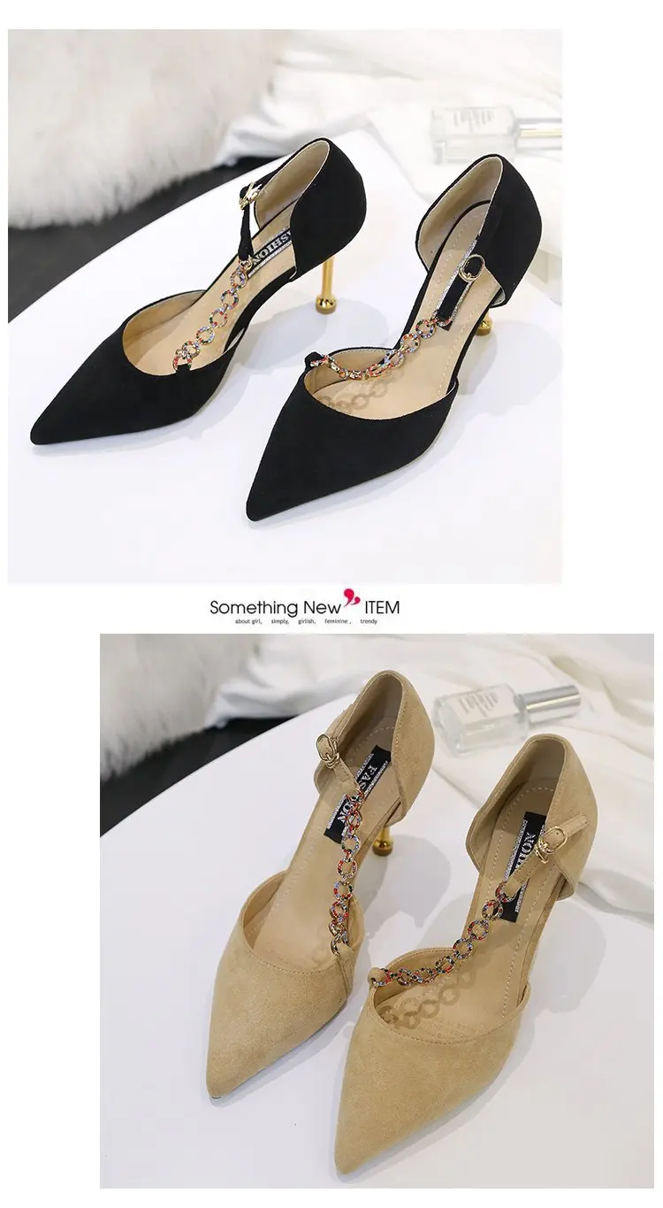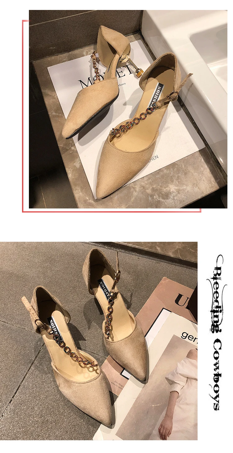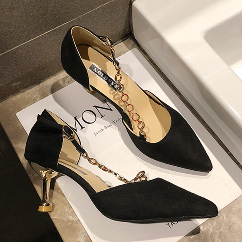Crystal Chain pumps woman beads band pointy toe tacones mujer party metal heels flock pompes stiletto high heels shoes women2020