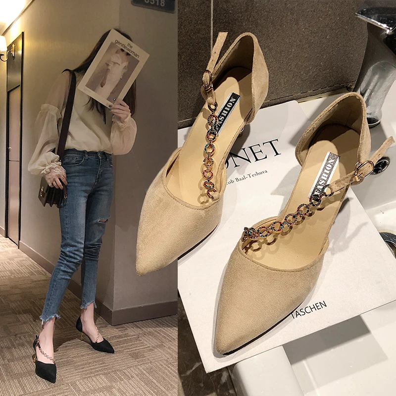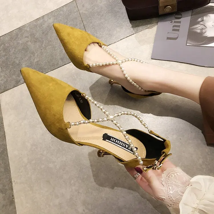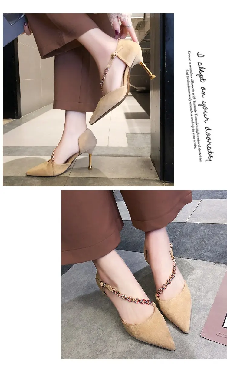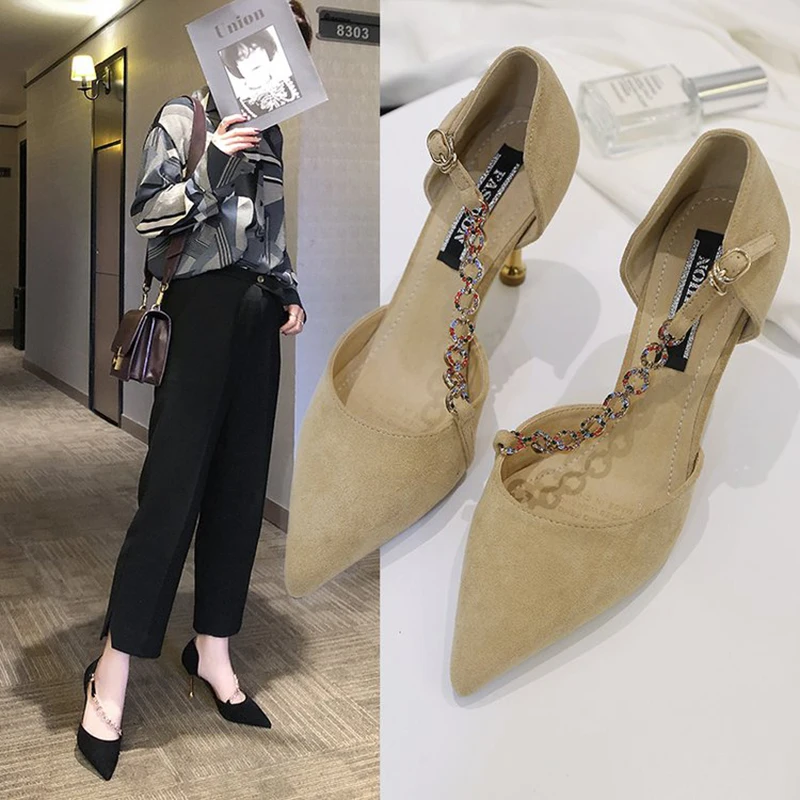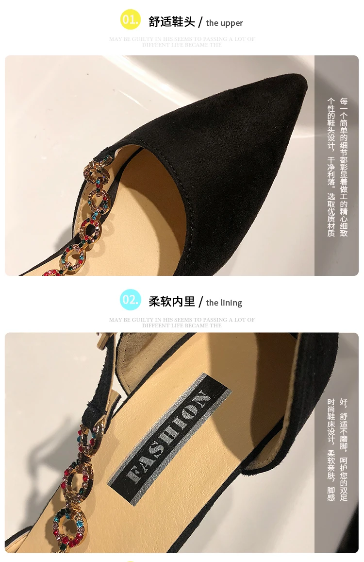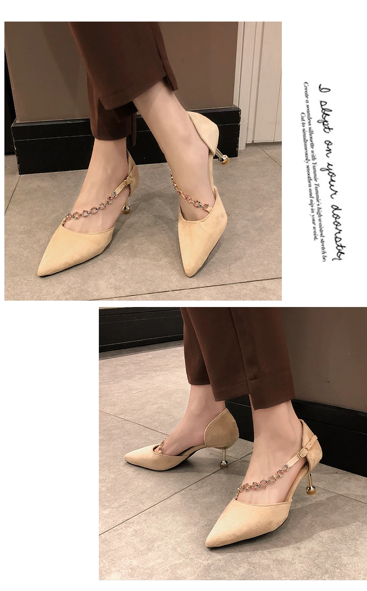 Crystal Chain pumps woman beads band pointy toe tacones mujer party metal heels flock pompes stiletto high heels shoes women2020