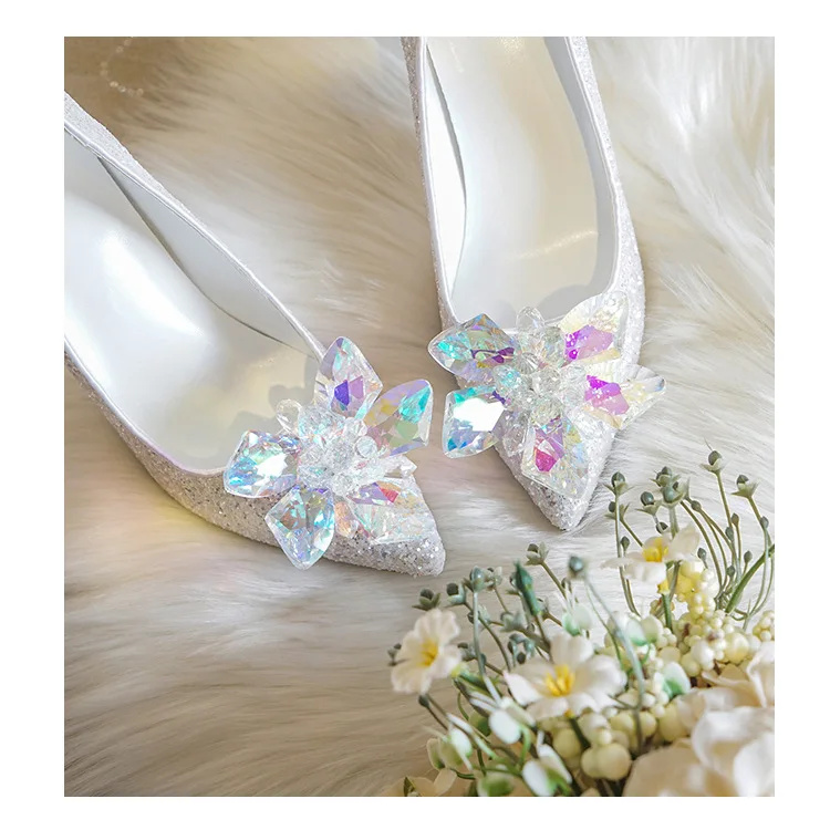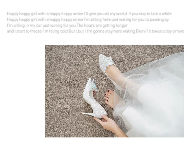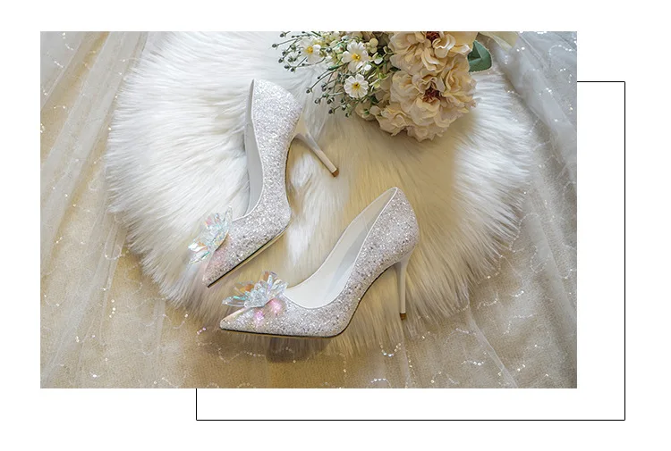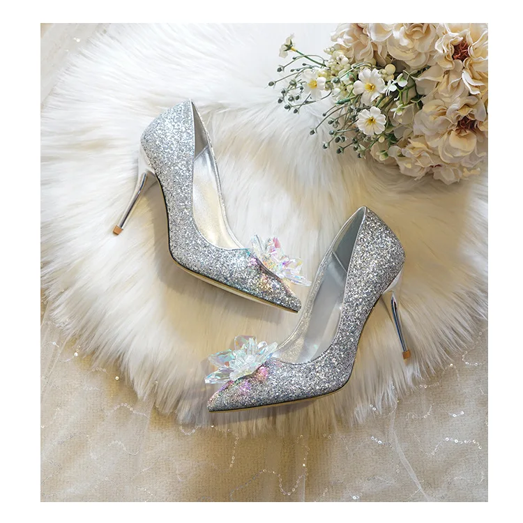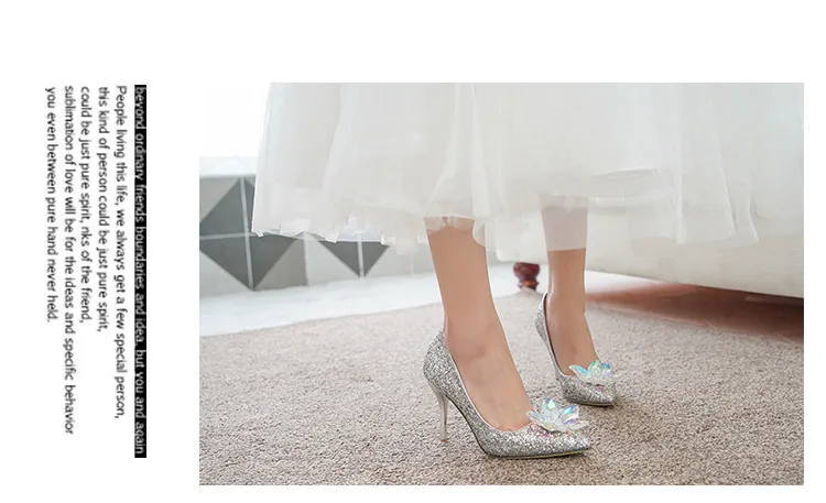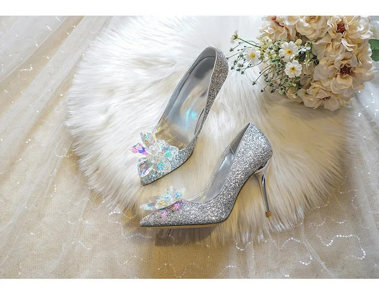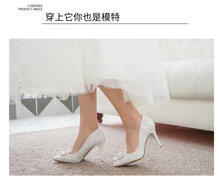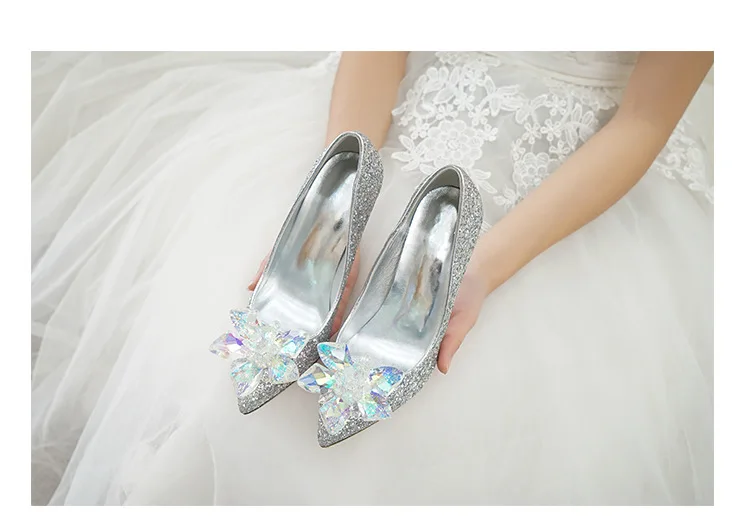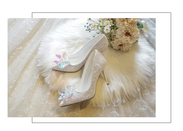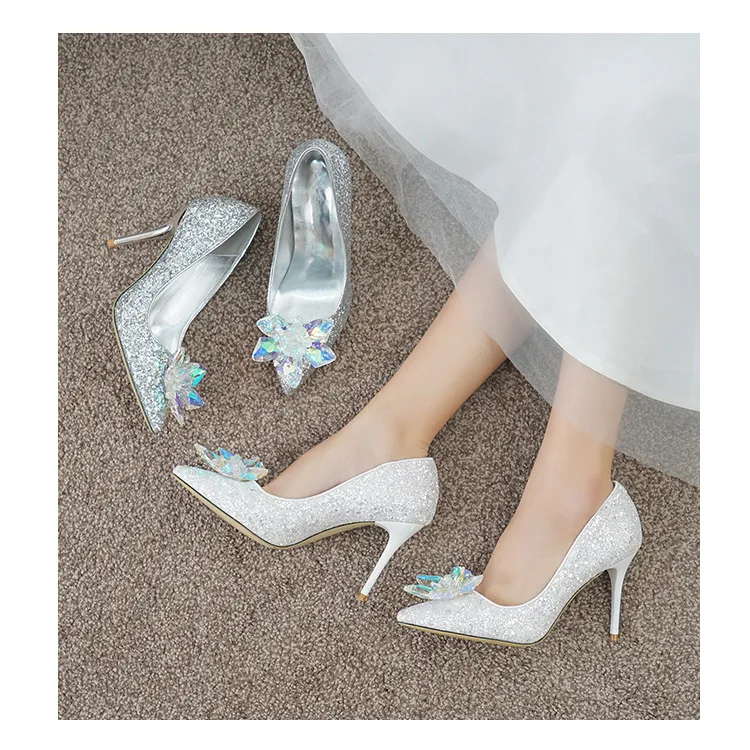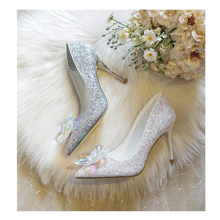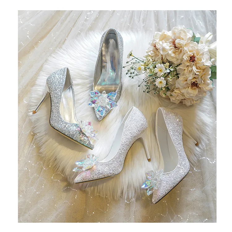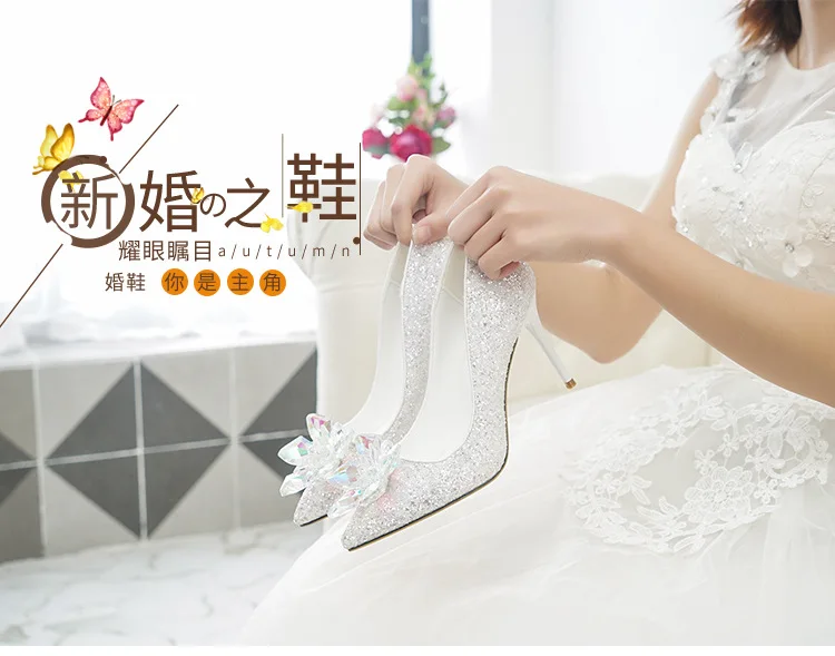 Crystal Glitter gorgeous wedding pumps women white/silver slip on upscale single shoes woman pointed toe glass high heels shoes