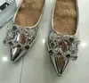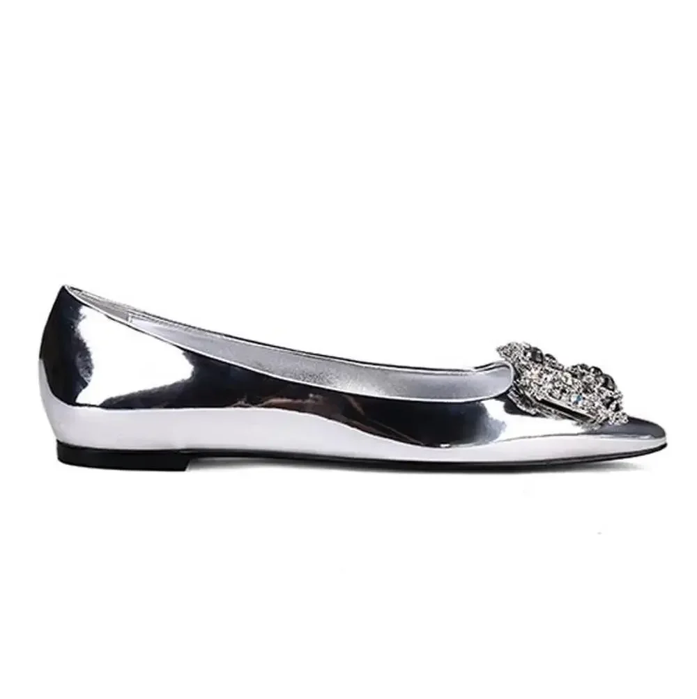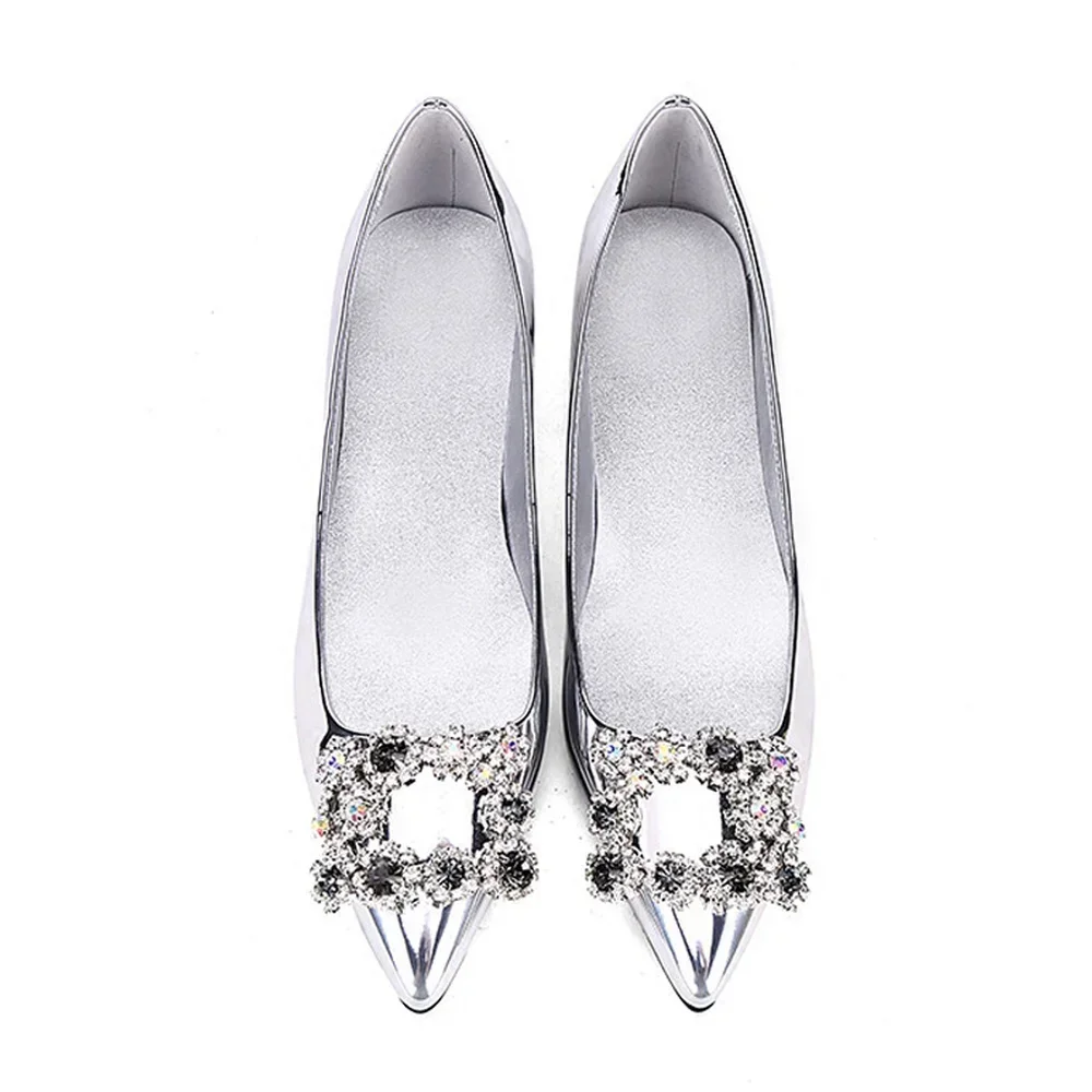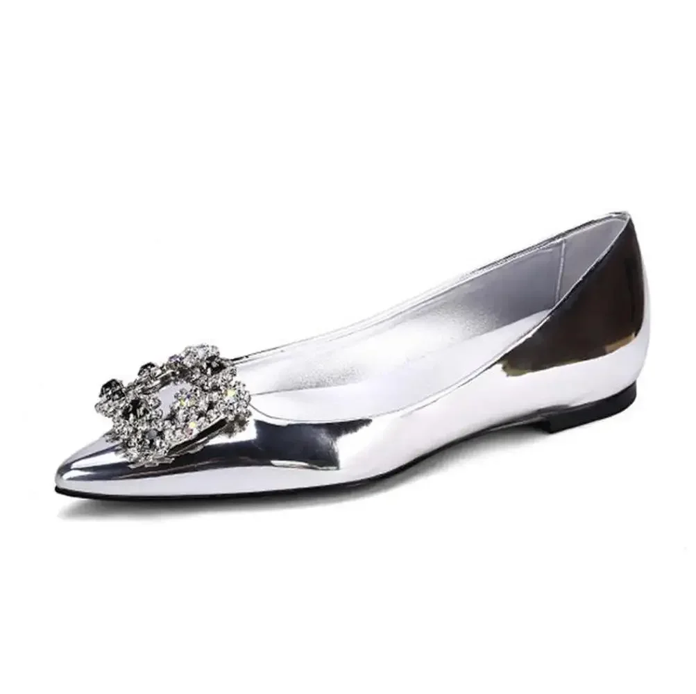 Custom 2024 new female silver rhinestone single shoes patent leather pointed flat shoes social women’s plus size wedding shoes