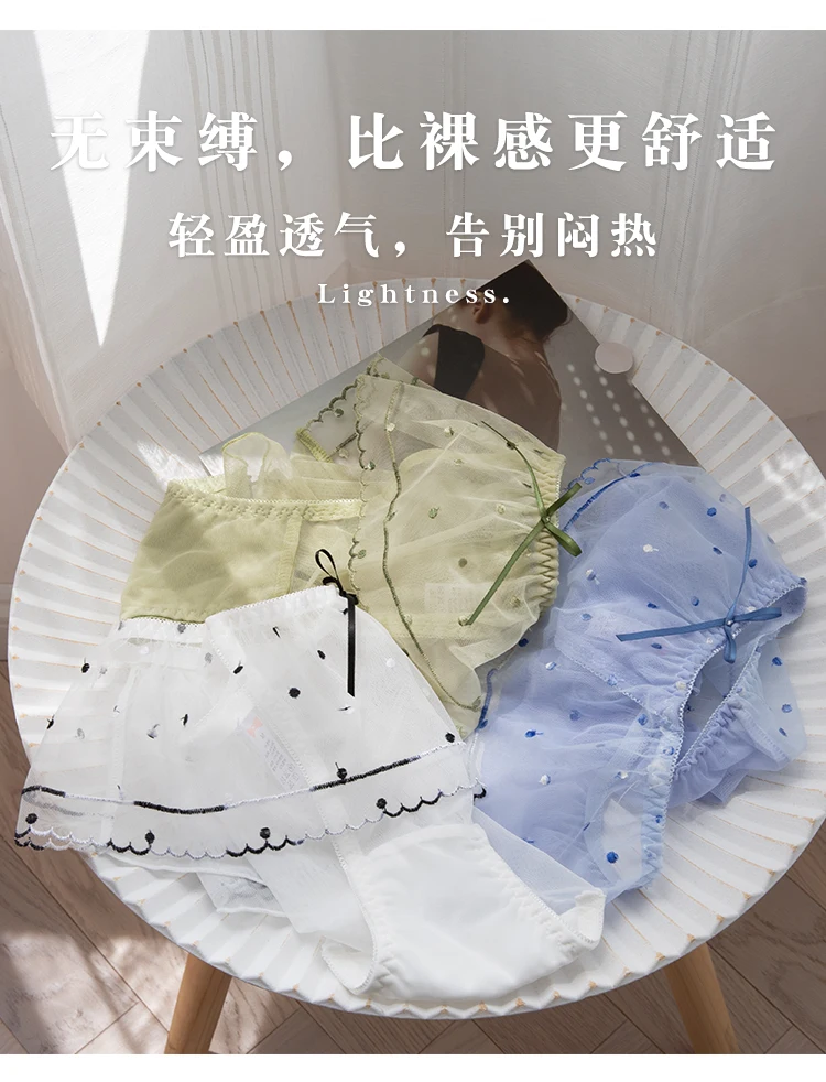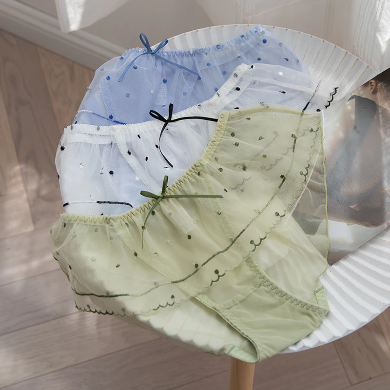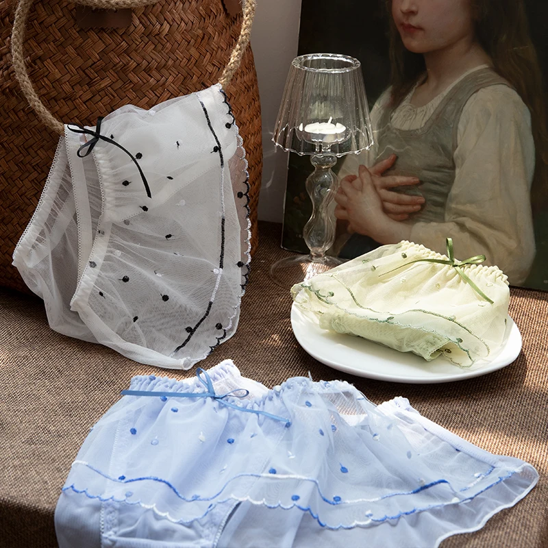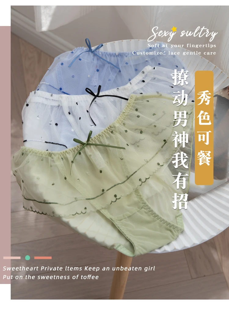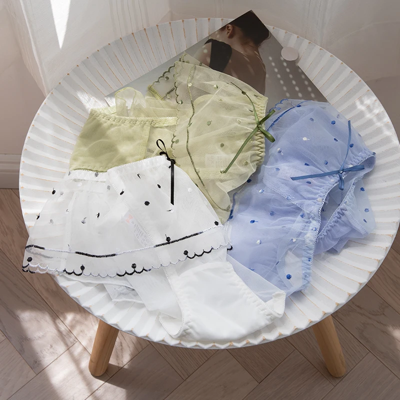 Cute Sexy Women Panties Underwear Transparent Briefs Net Yarn Sweet Girls Intimates Dot Embroidery Bow Trim