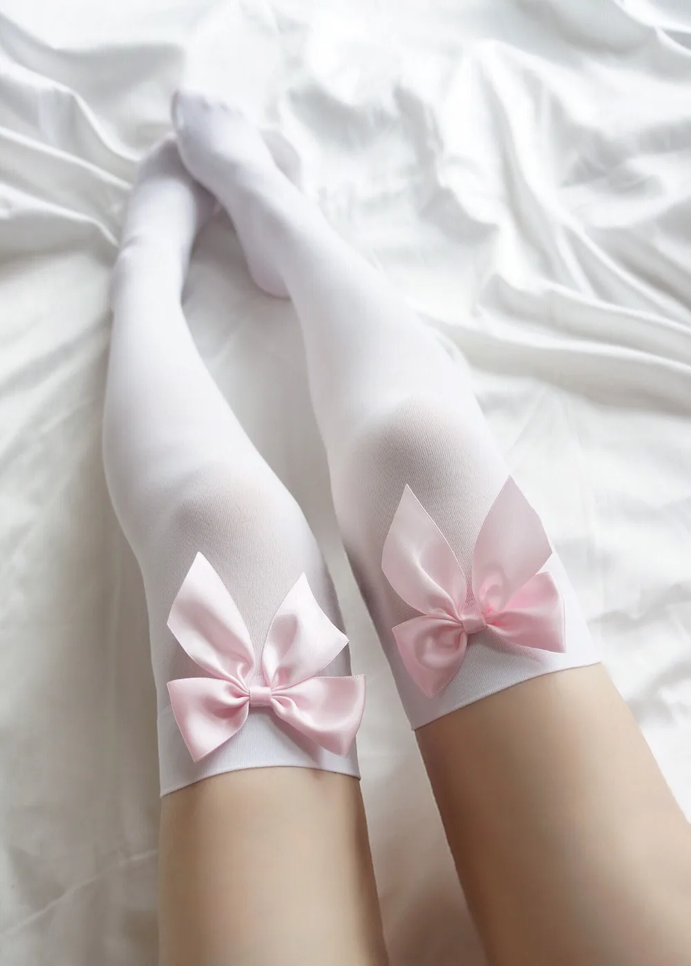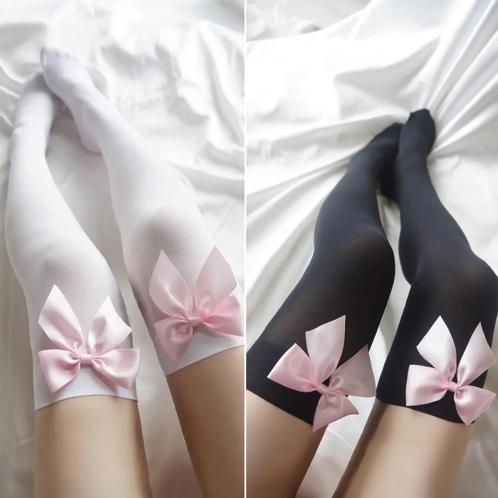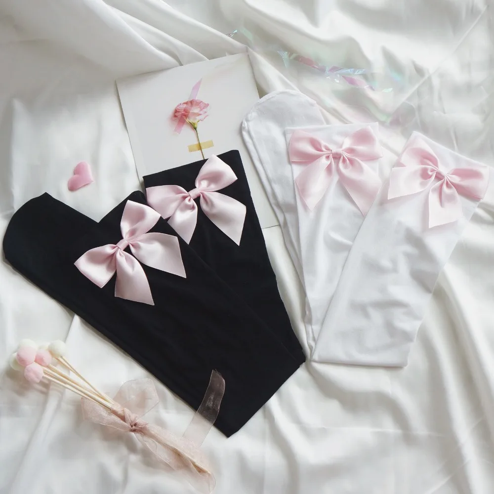 Cute Women’s Lolita Pink Bow Black & White Over-knee Stockings Velvet Women Girls Stockings