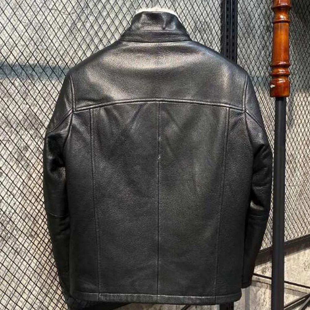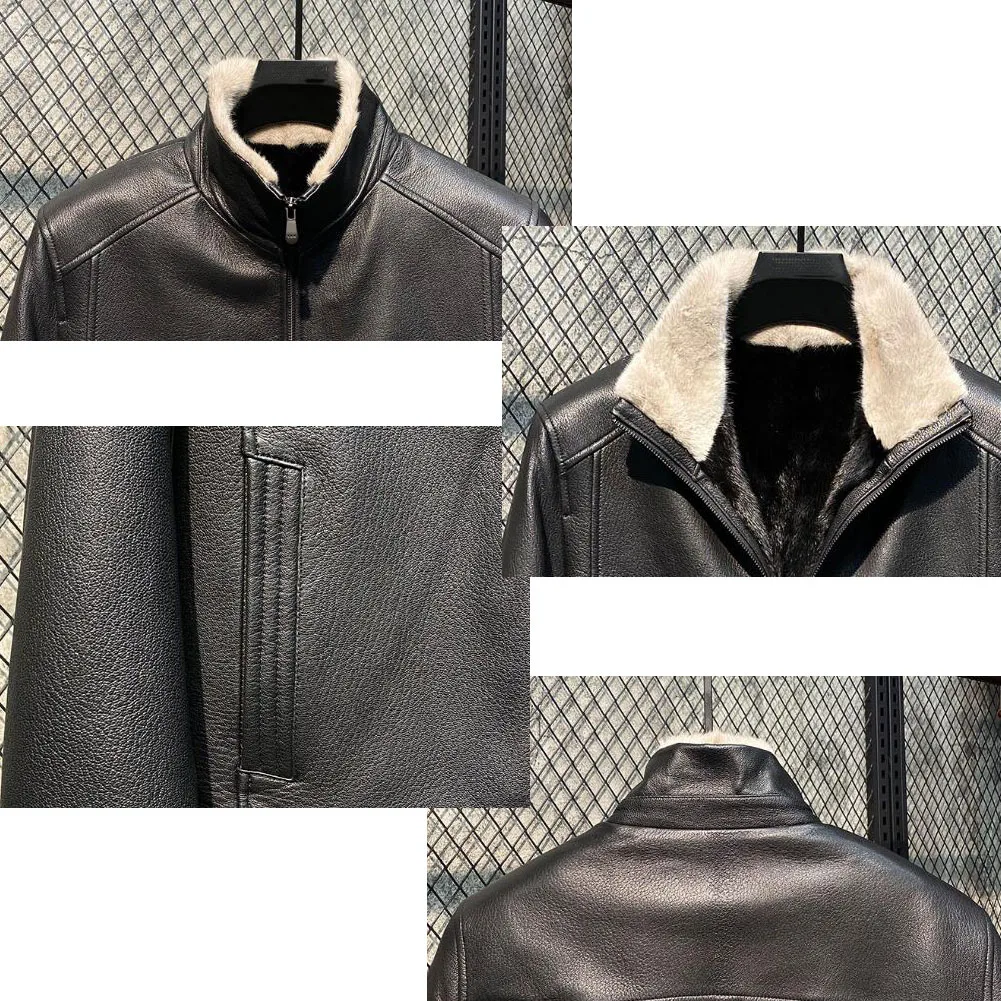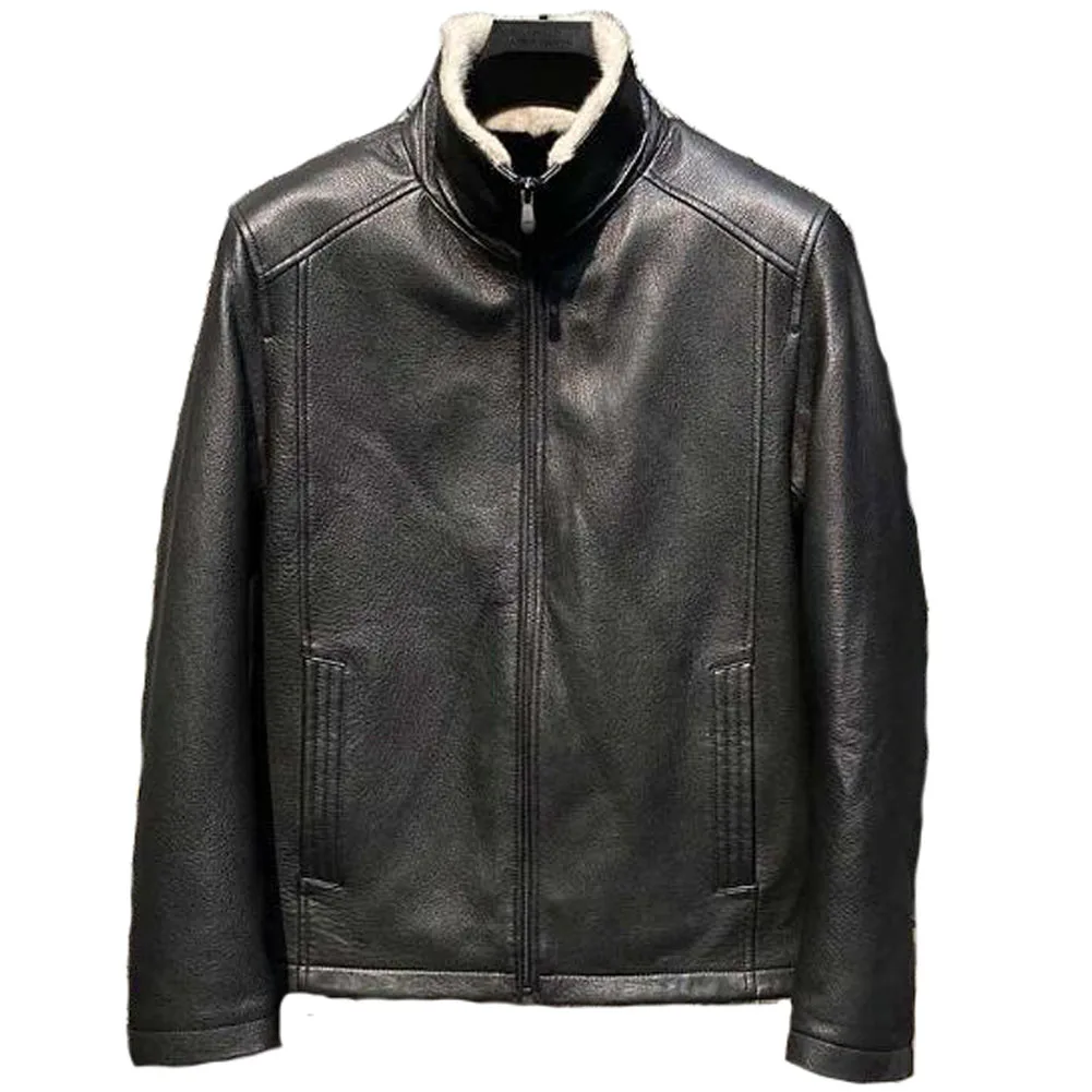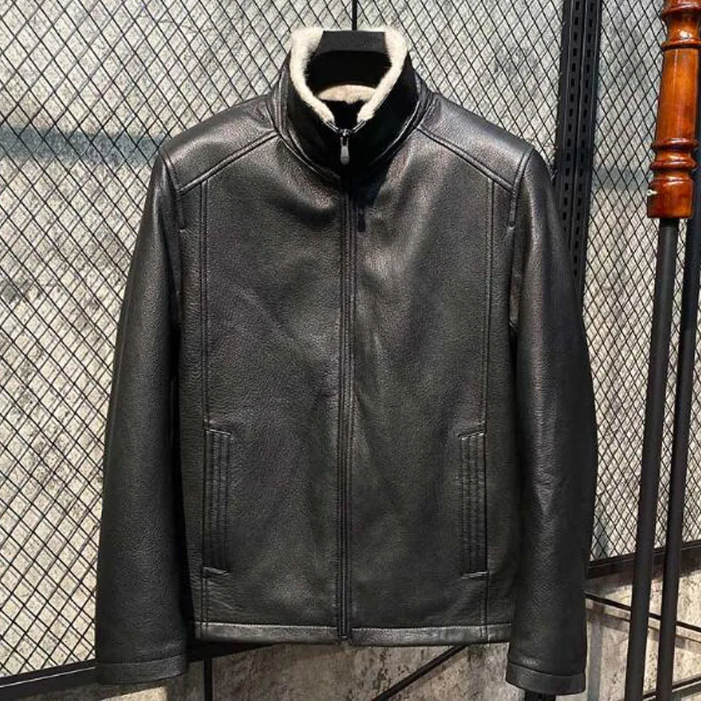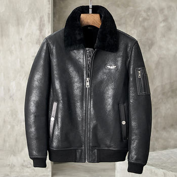Denny&Dora Mens Black Shearling Jacket Short Sheepskin Coat For Men Aviator Leather Jacket